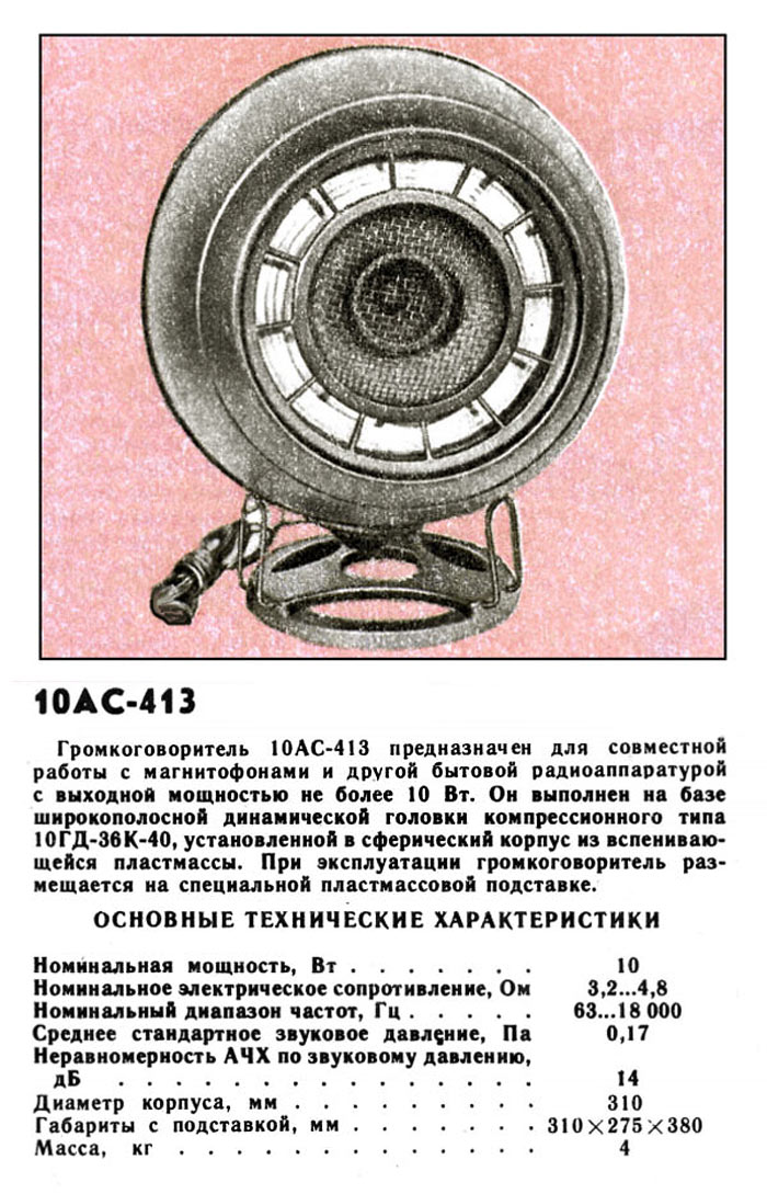 Акустическая система *10АС-413* выпускалась с 1984 года Смоленским заводом *Измеритель*, а с 1985 года и Харьковским приборостроительным заводом им. Шевченко. Кроме другого громкоговорителя она аналогична АС *6АС-213*. АС *10АС-413* предназначена работы с радиоаппаратурой мощностью до 10 Вт. АС выполнена на базе компрессионной широкополосной динамической головки *10ГД-36К-40*, установленной в сферический корпус из вспенивающейся пластмассы. При эксплуатации АС размещается па пластмассовой подставке. Номинальная мощность 10 Вт. Номинальное электрическое сопротивление 4 Ома. Диапазон воспроизводимых частот - 63...18000 Гц. Среднее звуковое давление 0,17 Па. Неравномерность АЧХ по звуковому давлению 14 дБ. Диаметр корпуса 310 мм. Габариты АС с подставкой - 310x275x380 мм. Масса 4 кг.