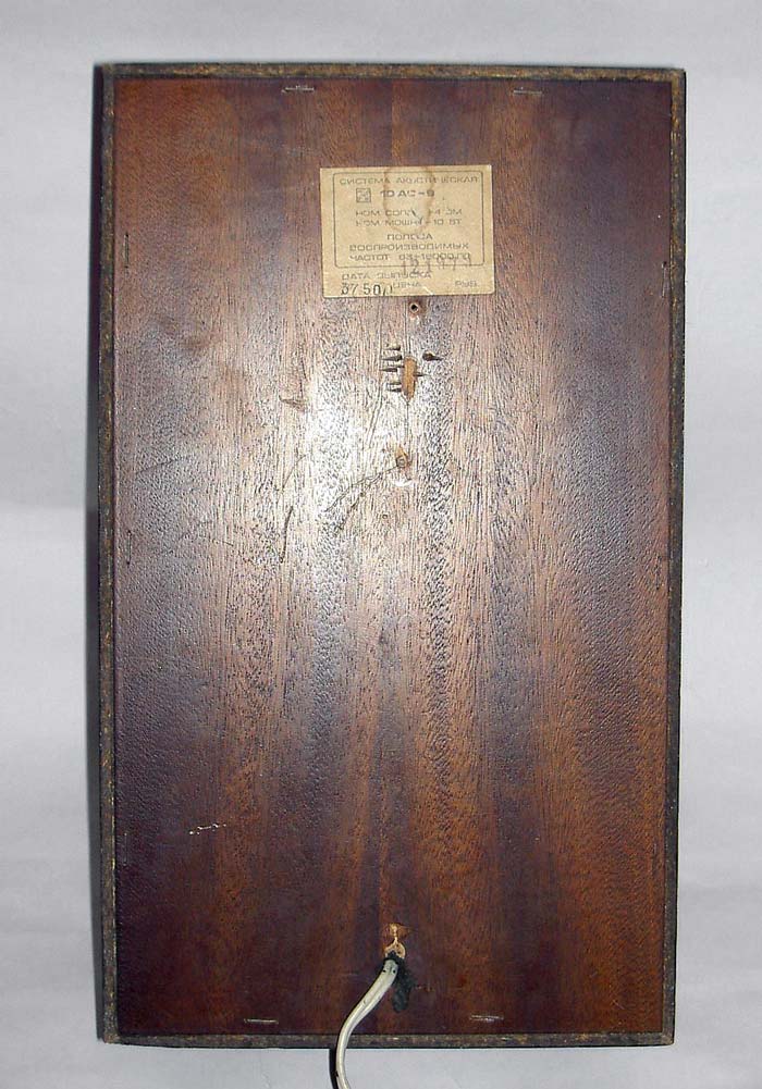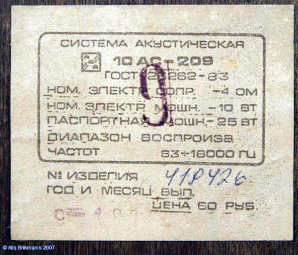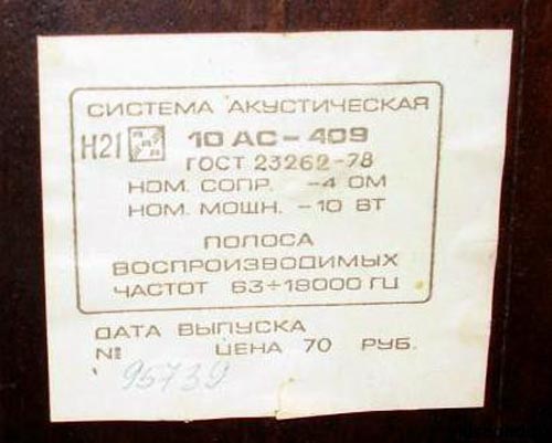 Акустическая двухполосная система с фазоинвертором *10АС-9* выпускалась с начала 1978 года Рижским радиозаводом им. А.С.Попова. АС входили в состав МЦ *Мелодия-106-стерео*. Корпус АС выполнен в виде прямоугольного неразборного ящика из ДСП, покрытым внешне натуральным шпоном. Спереди лицевая панель АС закрыта пластмассовой декоративной накладкой. НЧ динамик расположен в нижней части АС по центру вертикальной оси. ВЧ динамик находится над НЧ и сдвинут в левую сторону. Справа от ВЧ находится выход фазоинвертора. Внутри АС расположен электрический фильтр и звукопоглощающий материал. Диапазон воспроизводимых частот звука 63...18000 Гц. Чувствительность 85 дБ. Входное сопротивление 4 Ом. Номинальная мощность 10 Вт. Максимальная мощность 25 Вт. Используемые громкоговорители: НЧ/СЧ: 25 ГДН-1-4 (10 ГД-34). ВЧ: 6 ГДВ-1-16 (3 ГД-2). Габариты АС - 360х210х177 мм. Масса одной АС - 5 кг. С начала 1979 года АС именовались как *10АС-409*, с 1983 года как *10АС-209* и *10АС-408*.