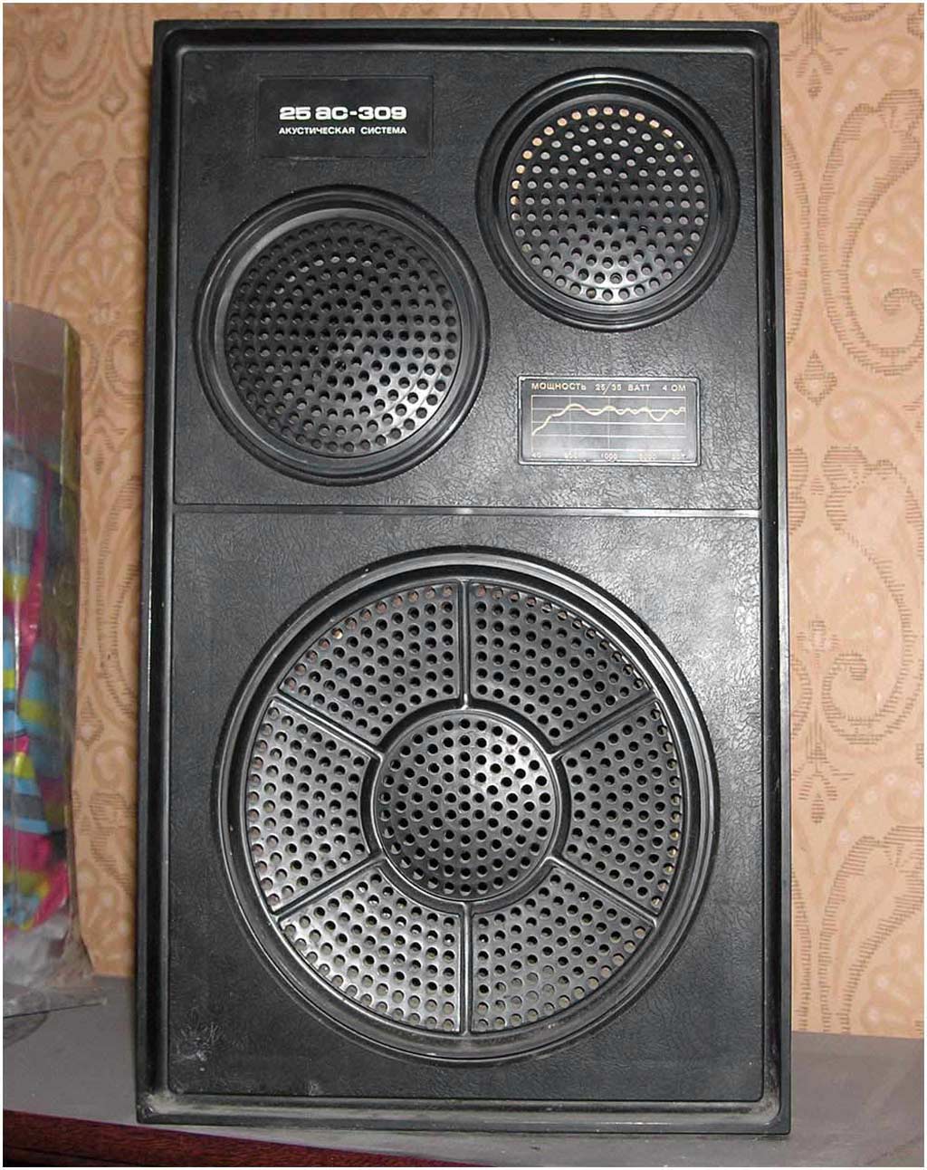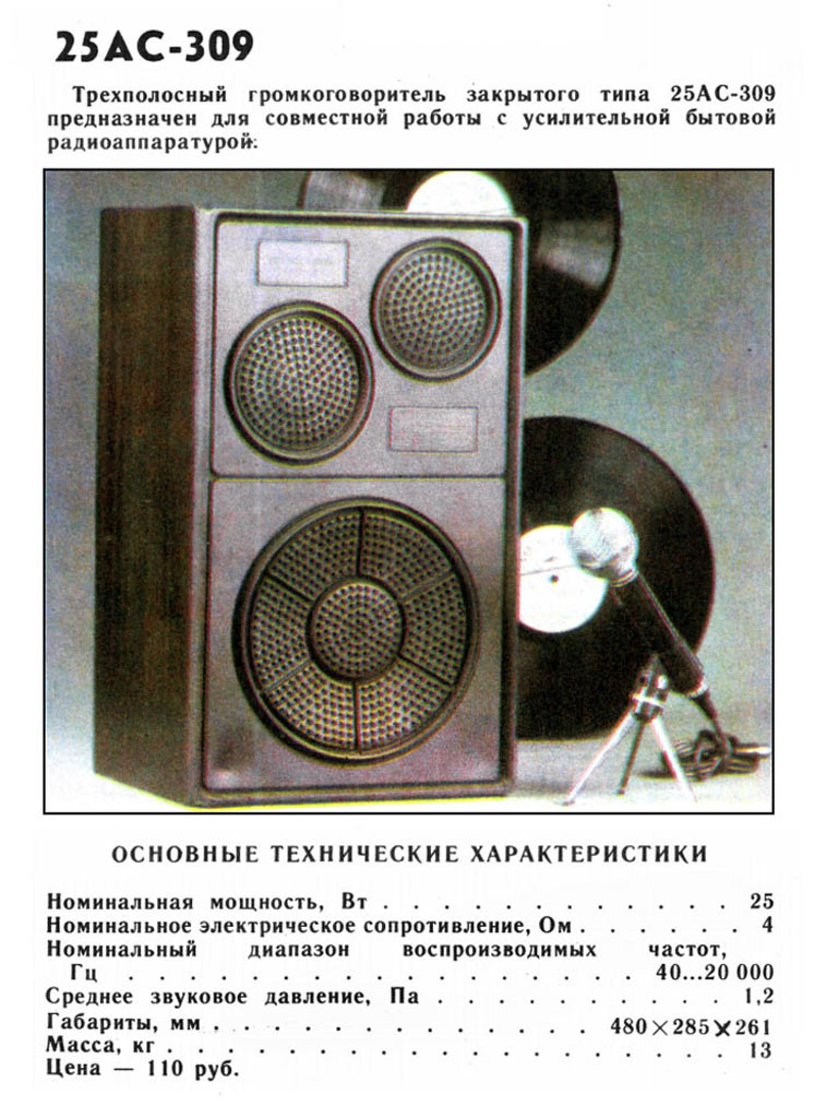Акустическая система *25АС-309* выпускалась с 1982 года Бердским радиозаводом. 3-х полосная АС закрытого типа **25АС-309** предназначена для совместной работы с бытовой высококачественной усилительной радиоаппаратурой. Номинальная мощность - 25 Вт. Среднее звуковое давление 1,2 Па. Номинальное электрическое сопротивление 4 Ом. Диапазон воспроизводимых частот - 40...20000 Гц. Габариты одной АС - 480х285х261 мм. Масса - 13 кг. Цена одной АС 110 рублей. С осени 1984 года завод выпускал аналогичную АС типа *25АС-109* переименованную по ГОСТ 23262-83.