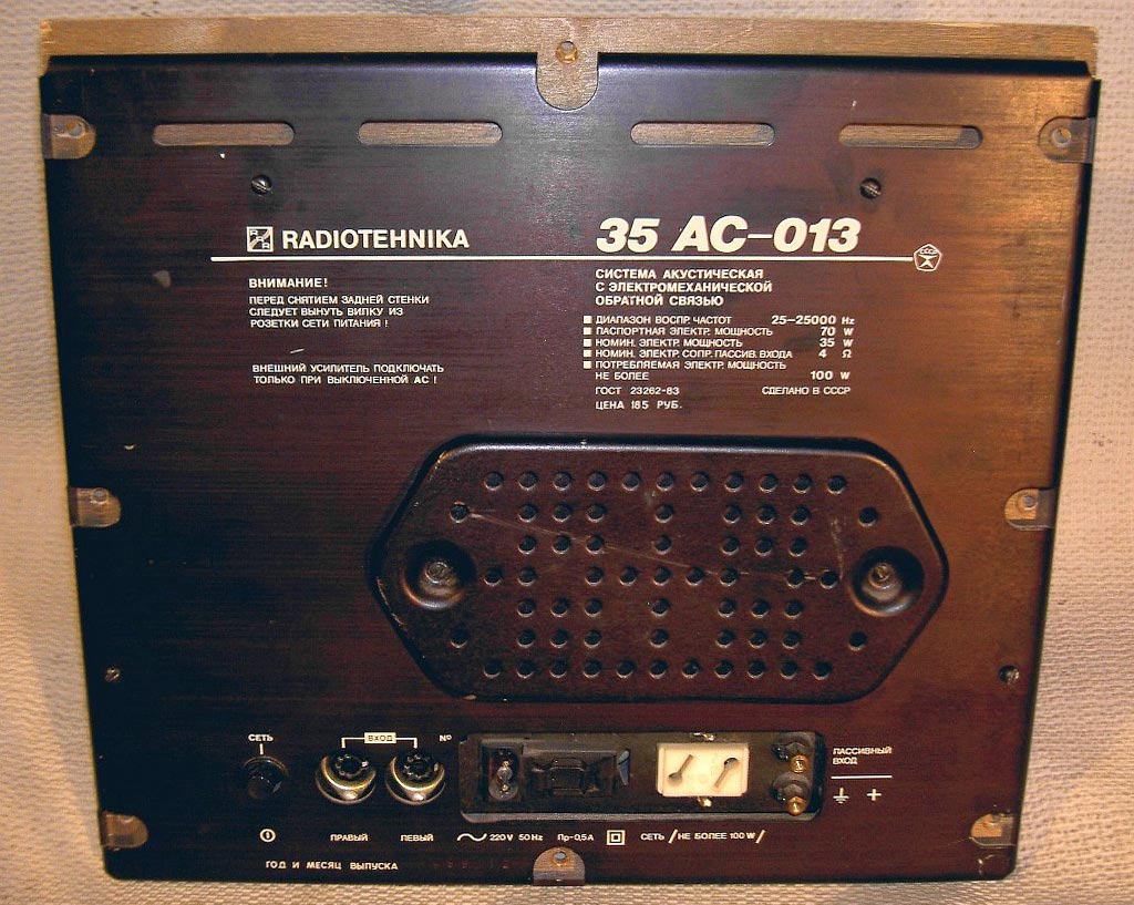 Акустическая система *35АС-013* с I-кв 1985 года выпускал Рижский радиозавод имени Попова. Акустическая система **35АС-013** - предназначена для высококачественного воспроизведения звуковых фонограмм, совместно с УКУ высокого класса, мощностью 20...35 Вт. Цена одной АС 185 рублей.