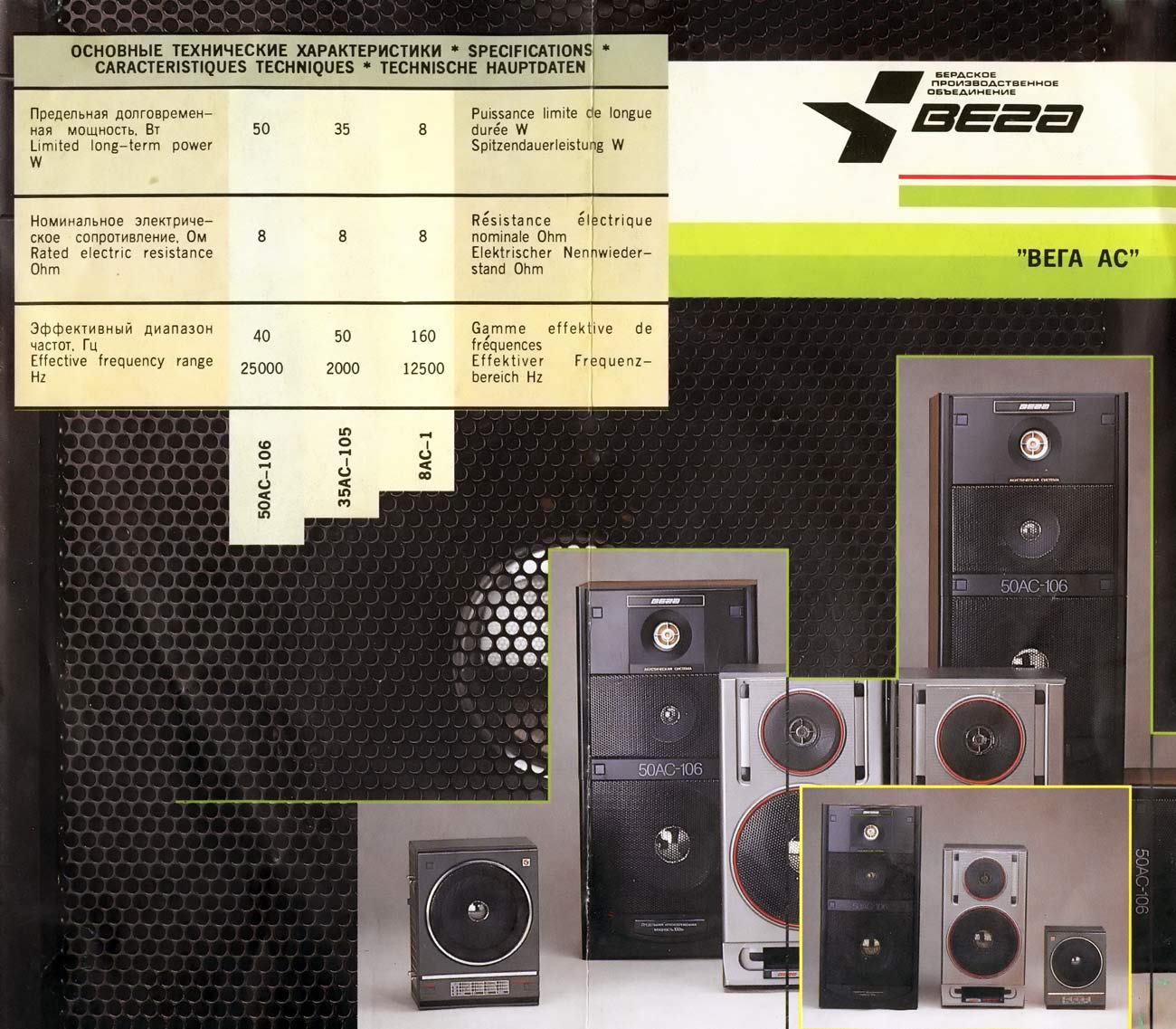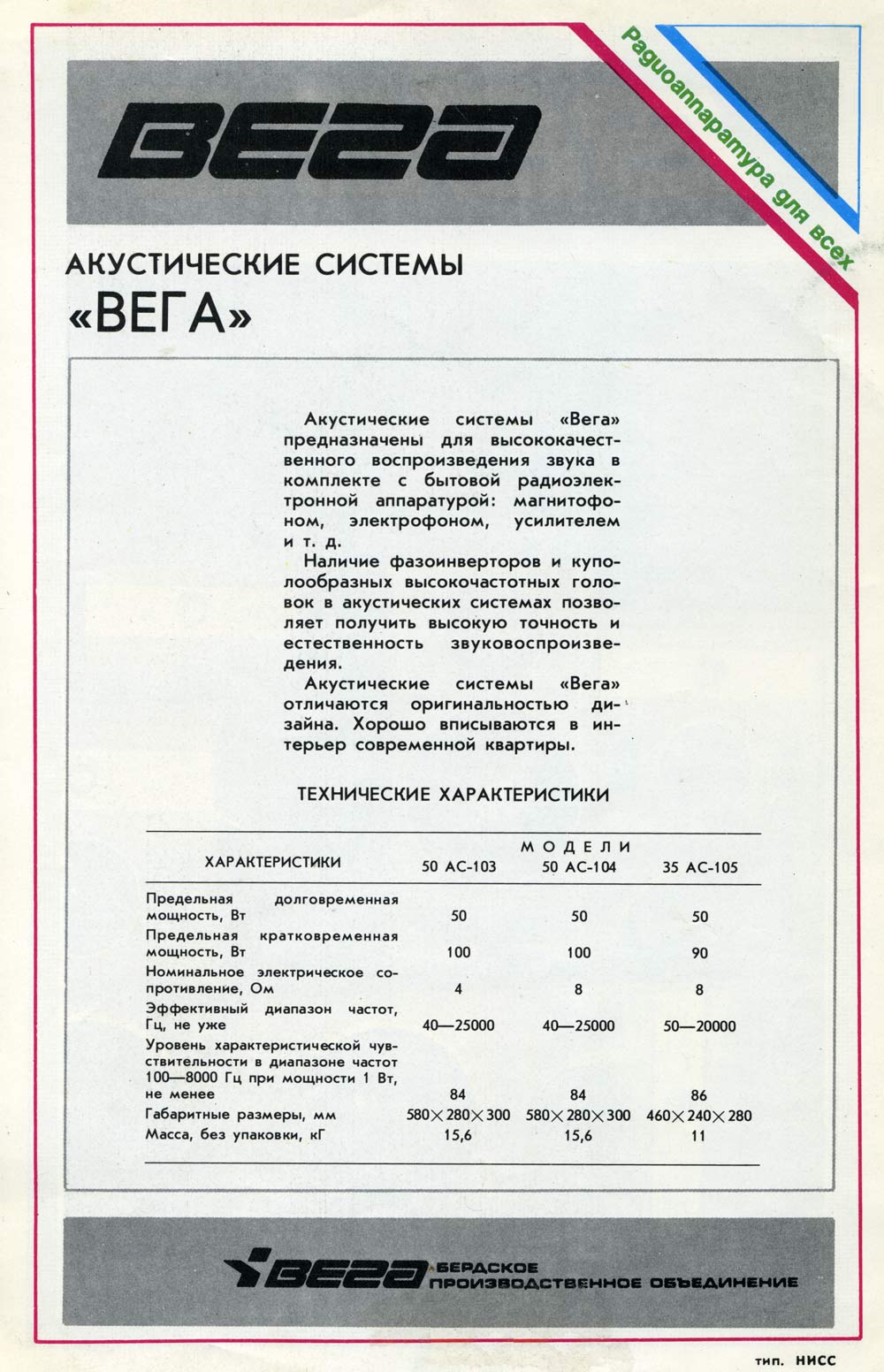 Акустические системы *Вега 35АС-105* и *Вега 35АС-105-1* с 1989 и 1991 года выпускал Бердский радиозавод. Диапазон частот: 50...20000 Гц. Чувствительность: 86 дБ. Долговременная мощность: 35 Вт. Кратковременная мощность: 90 Вт. Рекомендуемая мощность усилителя: 15...35 Вт. Сопротивление: 8 Ом. Размеры АС: 460х240х280 мм. Вес: 11 кг. Более подробная информация о параметрах АС в рекламных проспектах.