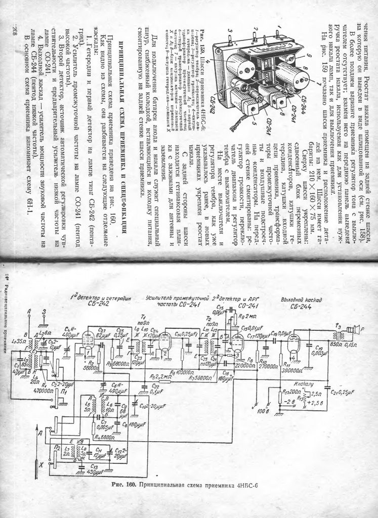 Радиоприёмник батарейный *4НБС-6* с 1938 года выпускал Воронежский завод *Электросигнал*. Супергетеродинный приёмник **4НБС-6** - что расшифровывается как, 4-х ламповый, Нормальный, Батарейный, Супергетеродинный, 6-я модель, собран на четырёх малогабаритных лампах: СБ-242, СО-241 (2), СБ-244. Питание батарейное, от двух сухих батарей, напряжением 100 В анодная и 2 В накальная. Потебляемая мощность по аноду 8 мА, по накалу 600 мА. Диапазоны принимаемых волн: ДВ - 715...2000 метров, СВ 190...580 метров. Чувствительность не менее 500 мкВ, избирательность по соседнему каналу около 20 дБ. ПЧ 460 кГц. Номинальная выходная мощность 150 мВт. Диапазон воспроизводимых частот 200...2500 Гц. Корпус деревянный, покрыт лаком. Левая ручка - включение питания, далее громкость, диапазоны, вверху - настройка.