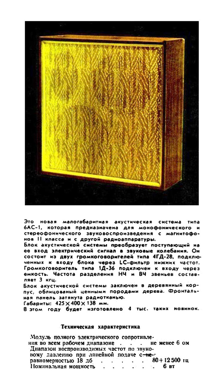 Акустическая система *6АС-1* выпускалась с 1971 года Ленинградским НИИРПА им. А. С. Попова. АС предназначена для работы с радиоаппаратурой второго, третьего и четвёртого классов. АС обеспечивает качественное воспроизведение фонограмм при подводимой мощности от 0,5 до 6 Вт. Диапазон воспроизводимых частот 80...12500 Гц. Модуль электрического сопротивления 6 Ом. В АС установлено три громкоговорителя, два 4ГД-28 и один 1ГД-36 подключенный через конденсатор, который обрезает звуковые частоты ниже 3 кГц и выделяя выше 3 кГц. Габариты АС 425 х 400 х 138 мм. Масса 3,8 кг.