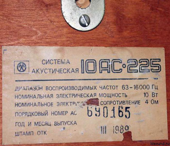 Акустическая система *10АС-225* выпускалась с 1986 года Муромским заводом РИП. Одновременно АС выпускалась и под наименованием *15АС-220*, а ещё и как *6АС-224*. Оформление АС одинаково, разница в применённых громкоговорителях. 2-х полосная АС с фазоинвертором. Диапазон частот: 63...16000 Гц (6АС-224), для АС *15АС-220* диапазон частот 63...18000 Гц. Чувствительность: 84 дБ. Неравномерность АЧХ в диапазоне частот 100...8000 Гц: ±5 дБ. Сопротивление: 4 Ома. Номинальная мощность: 15 Вт (6 Вт для 6АС-224). Динамики: НЧ/СЧ: 25ГДН-3-4 (10ГД-34, 15ГД-14, 6ГД-6). ВЧ: 6ГДВ-2-8 (4ГД-56). Частота раздела фильтра: 5000 Гц. Габариты АС 370х225х210 мм. Масса АС *10АС-225* 6 кг. АС *15АС-220* шла с радиолой *Кантата-205С*. С какой радиоаппаратурой шли другие АС не установлено.