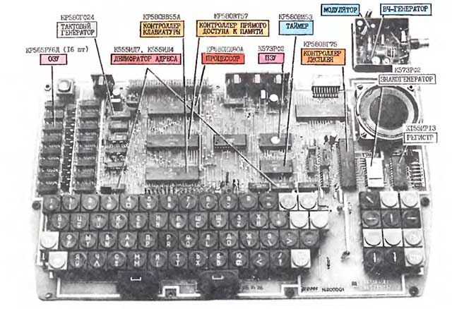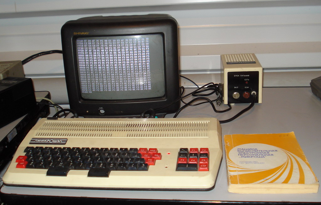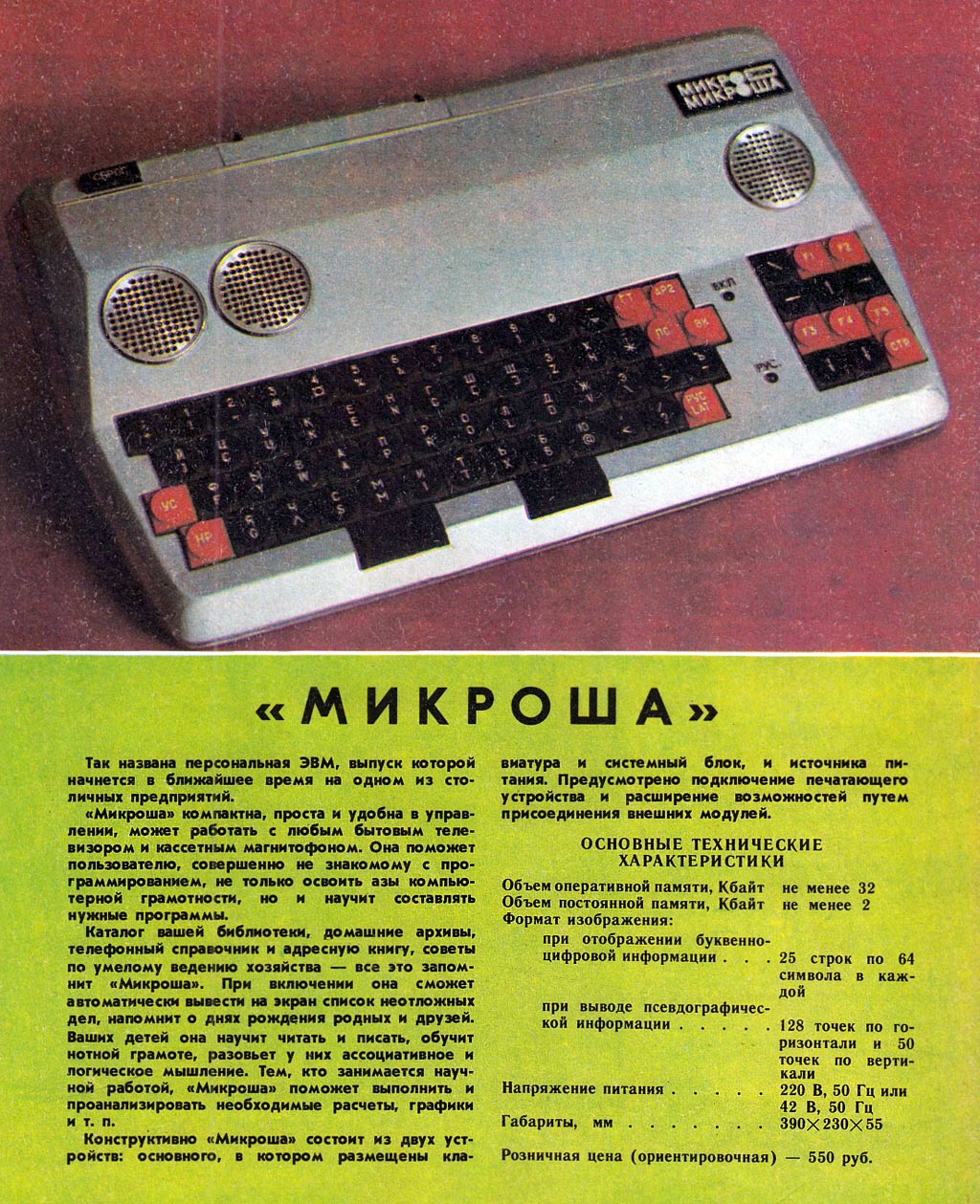 8-разрядный микрокомпьютер *Микроша* выпускался с 1987 года Лианозовским электромеханическим заводом. Один из первых бытовых компьютеров в СССР. В 1986-ом году в журнале "Радио" стали выходить статьи, посвящённые сборке самодельного компьютера "Радио-86РК". Этот компьютер стал родоначальником отдельной эволюционной ветви советских ПК, а его параметры - своеобразным стандартом совместимости. Вскоре сборкой совместимых с "Радио-86РК" машин занялись несколько отечественных заводов. Одним из них стал Лианозовский электромеханический завод, выпустивший в 1987-ом году модель "Микроша". Как и "Радио-86РК", "Микроша" базировался на процессоре КР580ВМ0/КР580ИК80 (клон Intel 8080), работавшем на тактовой частоте 1,77 МГц. Объём ОЗУ составлял 32 Кб, ПЗУ - 2 Кб. В ПЗУ был зашит системный монитор-загрузчик. Видеоадаптер был монохромным и поддерживал лишь текстовый режим 64 х 25 символов; знакогенератор содержал символы псевдографики, позволявшие формировать на экране простые изображения разрешением до 128 х 50 точек. В качестве устройства хранения данных использовался бытовой магнитофон. В компьютере имелся системный разъём, куда теоретически можно было подключить контроллер дисководов или дополнительное ОЗУ/ПЗУ, однако в заводском исполнении выпускался лишь ПЗУ-картридж с играми. Благодаря своим скромным характеристикам цена компьютера на момент выпуска составляла всего 500 рублей. Производство "Микроши" продолжалось как минимум до 1992-ого года. Наряду с клонами ZX-Spectrum и компьютерами серии "Электроника БК", Радио-86РК-совместимые ПЭВМ внесли огромный вклад в приобщение советских граждан к компьютерной грамотности, способствовали появлению целого поколения талантливых отечественных программистов. Микропроцессор: КР580ВМ80А на тактовой частоте 1,77 МГц, быстродействие — 300 тыс. оп/сПамять: ОЗУ — 32 Кб, ПЗУ — 2 КбУстройство вывода: бытовой телевизор через видеовход либо в антенный вход через отдельный блок модулятораРежим отображения: монохромный, 25 строк по 64 символа, знакогенератор содержит символы псевдографики, что позволяет имитировать графический режим 128 × 50 точекКлавиатура: 68 клавишВнешняя память: бытовой кассетный магнитофон, скорость чтения/записи — 700 бит/cПорты: «Интерфейс 1», «Интерфейс 2», «Внутренний интерфейс» (разъём ОНП-КС-23-Р (аналог СНП342-60Р))Питание: внешний блок питания 220 В (в школьном варианте — 42 В), на выходе — +5 В, −5 В, +12 В, потребляемая мощность — не более 20 ВтРазмеры: системного блока — 390 × 230 × 55 мм, блока питания — 160 × 100 × 100 мм, модулятора — 100 × 30 × 40 мм Теоретическая возможность подключения периферии через системный разъём: увеличение объёма ОЗУувеличение объёма ПЗУподключение НГМД через внешний контроллерпрограмматор ППЗУэлектронный диск ОЗУ или ПЗУобеспечение связи с удалёнными ЭВМ (связной контроллер)приём и выдача аналоговых сигналов (модуль ЦАП-АЦП)