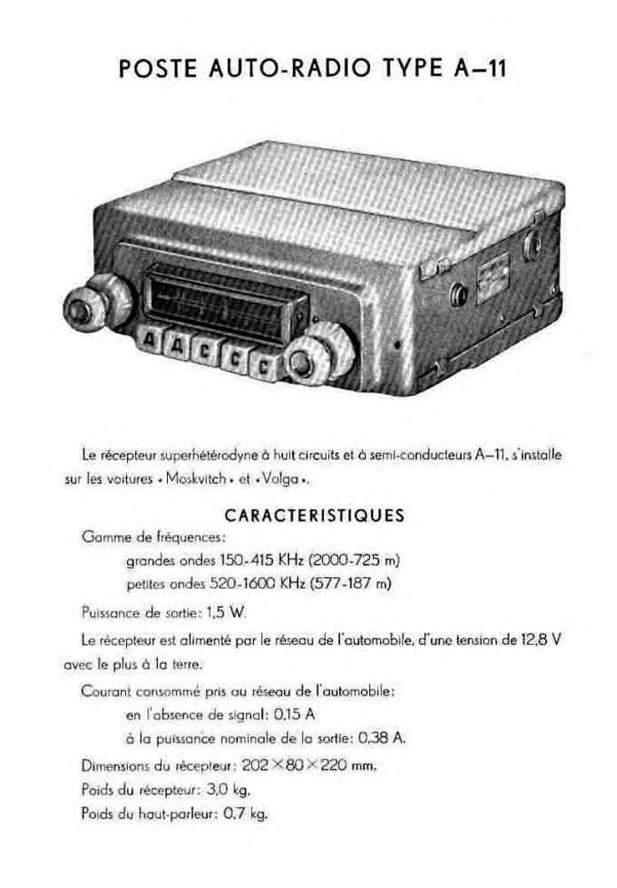 Радиоприёмник автомобильный *A-11* выпускал с 1958 года небольшой опытной серией Муромский радиозавод. Приёмник собран на 10 транзисторах по супергетеродинной схеме и предназначен для установки на легковых автомобилях марки Москвич и Волга. Он заключен в металлический корпус размерами 202х220х80 мм. Его вес 3 кг. Питание осуществляется от аккумулятора напряжением 12,8 вольт или от сетевого выпрямителя. Потребляемый приёмником ток равен 0,35 А при номинальной выходной мощности и 0,15 А при отсутствии сигнала. Приёмник рассчитан на работу в диапазоне средних 187,5...576 м и длинных 723...2000 м волн. Переход с одного диапазона на другой производится кнопочным переключателем. Чувствительность модели 100 мкВ, при отношении уровня сигнала к уровню шумов 10:1. Промежуточная частота 465 кгц. Избирательность по соседнему каналу 18 дб, по зеркальному каналу 16 дб на ДВ и 14 дб на СВ. Номинальная выходная мощность 1,5 Вт. Приёмник демонстрировался на всемирной выставке в Брюсселе в 1958 году, смотрите буклет.
