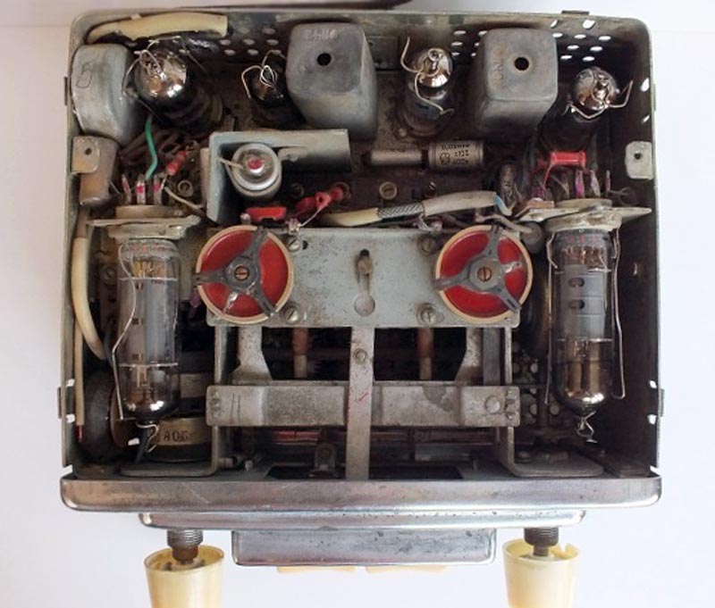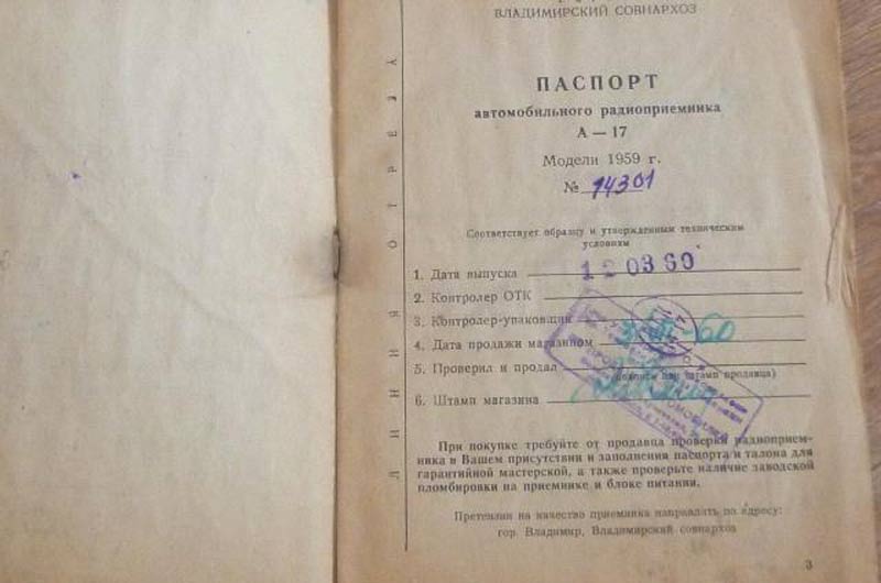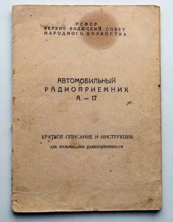 Радиоприёмник автомобильный *А-17* выпускал с 1958 года Муромский радиозавод. **А-17** - шестиламповый двухдиапазонный автомобильный супергетеродин, предназначенный для установки в автомобилях марок Москвич-403 и 407. Возможна установка и в автомобиль ГАЗ-21. Питание осуществляется от аккумулятора автомобиля напряжением 12,8 вольта с заземлённым минусом. Радиоприёмник **А-17** практически аналогичен модели **А-12** за исключением фиксированной настройки. Диапазоны: ДВ 150...415 кГц, СВ 520...1600 кГц. Чувствительность: ДВ 250, СВ 100 мкВ. Избирательность ДВ 28, СВ 26 дБ. Номинальная выходная мощность 2 Вт. Потребляемая мощность 42 Вт. В комплекте блок питания на вибропреобразователе **ВП-9**, или на транзисторах **БП-12**, громкоговоритель укреплённый на отражательной доске и кабель антенны. С 1959 года завод выпускал радиоприёмник *А-17А* по схеме и конструкции аналогичный базовому, кроме применения в нём уже печатного монтажа.