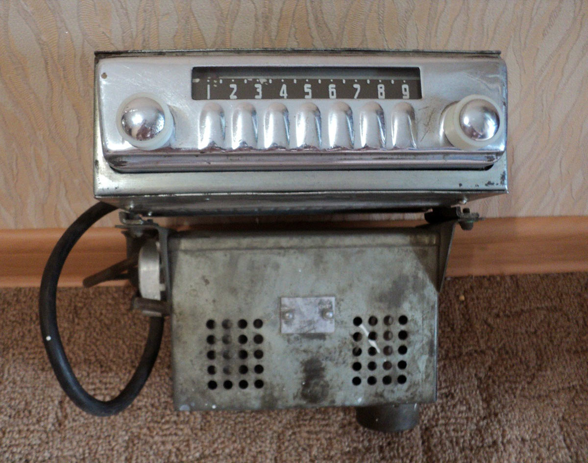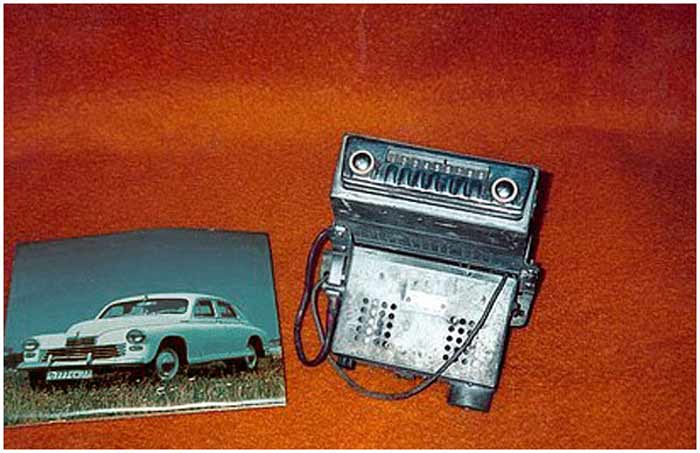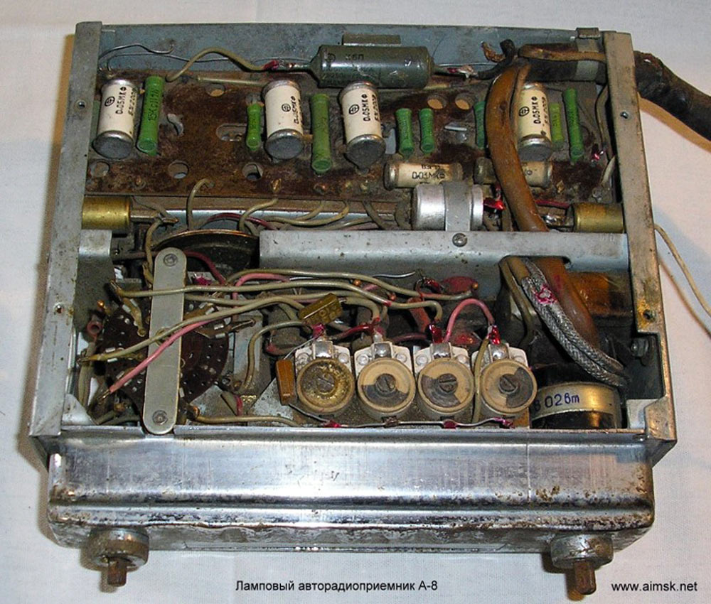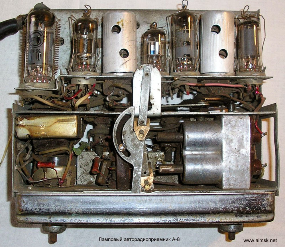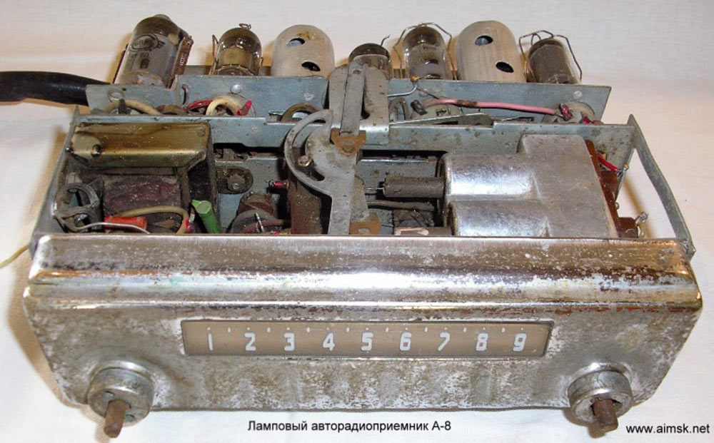 Радиоприёмники автомобильные *А-8* (слева) и *А-8М* (справа) с 1955 года выпускал Муромский радиозавод и Ленинградский завод *Красная Заря*. **А-8** это двухдиапазонный, шестиламповый супергетеродин. Он предназначен для установки в автомобилях **Победа** М-20, а модель **А-8М** в автомобилях **Москвич** М-402, М-403. Питание приёмников осуществляется от автомобильного аккумулятора с напряжением 12,8 вольт, с минусом на массе. Питание анодных цепей приёмника осуществляется от вибропреобразователя. Комплект состоит из приёмного блока, блока питания, громкоговорителя с отражательной доской и кабеля соединения с антенной. Соединение с блоком питания и громкоговорителем осуществляется кабелями. Настройка на частоту радиостанции производится ферроиндукторами (перемещением сердечников в катушках). Шкала приёмника градуирована в УЕ. Ручка переключателя диапазонов объединена с ручкой настройки. При её вдавливании включается диапазон ДВ, при вытягивании СВ. Номинальная выходная мощность 1,5 вт. Коэффициент нелинейных искажений 7%. Диапазоны ДВ: 150...415 кГц, СВ: 520...1500 кГц. ПЧ 465 кГц.Чувствительность в диапазонах: ДВ 250 мкВ, СВ 150 мкВ. Избирательность в диапазонах ДВ -20 дб, СВ -18 дб. Ослабление зеркального канала 20 дБ. Потребляемая мощность 45 Вт. Габариты приёмника 202х72х202 мм, БП - 176х72х137 мм. Отражательной доски 194х150х8 мм. Вес любого комплекта 7,3 кг. В 1955 году при модернизации автомобиля **Победа** уже штатно устанавливался приёмник **А-8**. А с 1956 года приёмники **А-8М** начали штатно ставить и на автомобилях Москвич-402, а позднее и 403, телескопическая антенна **АР-44** устанавливалась вертикально.