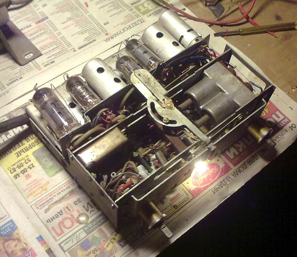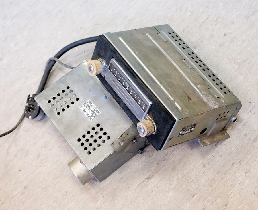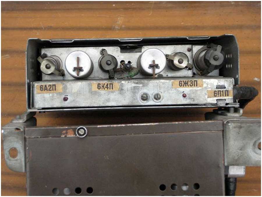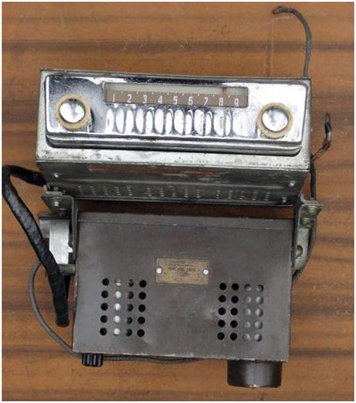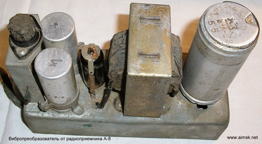 Радиоприёмники автомобильные *А-8* (слева) и *А-8М* (справа) с 1955 года выпускал Муромский радиозавод и Ленинградский завод *Красная Заря*. **А-8** это двухдиапазонный, шестиламповый супергетеродин. Он предназначен для установки в автомобилях **Победа** М-20, а модель **А-8М** в автомобилях **Москвич** М-402, М-403. Питание приёмников осуществляется от автомобильного аккумулятора с напряжением 12,8 вольт, с минусом на массе. Питание анодных цепей приёмника осуществляется от вибропреобразователя. Комплект состоит из приёмного блока, блока питания, громкоговорителя с отражательной доской и кабеля соединения с антенной. Соединение с блоком питания и громкоговорителем осуществляется кабелями. Настройка на частоту радиостанции производится ферроиндукторами (перемещением сердечников в катушках). Шкала приёмника градуирована в УЕ. Ручка переключателя диапазонов объединена с ручкой настройки. При её вдавливании включается диапазон ДВ, при вытягивании СВ. Номинальная выходная мощность 1,5 вт. Коэффициент нелинейных искажений 7%. Диапазоны ДВ: 150...415 кГц, СВ: 520...1500 кГц. ПЧ 465 кГц.Чувствительность в диапазонах: ДВ 250 мкВ, СВ 150 мкВ. Избирательность в диапазонах ДВ -20 дб, СВ -18 дб. Ослабление зеркального канала 20 дБ. Потребляемая мощность 45 Вт. Габариты приёмника 202х72х202 мм, БП - 176х72х137 мм. Отражательной доски 194х150х8 мм. Вес любого комплекта 7,3 кг. В 1955 году при модернизации автомобиля **Победа** уже штатно устанавливался приёмник **А-8**. А с 1956 года приёмники **А-8М** начали штатно ставить и на автомобилях Москвич-402, а позднее и 403, телескопическая антенна **АР-44** устанавливалась вертикально.