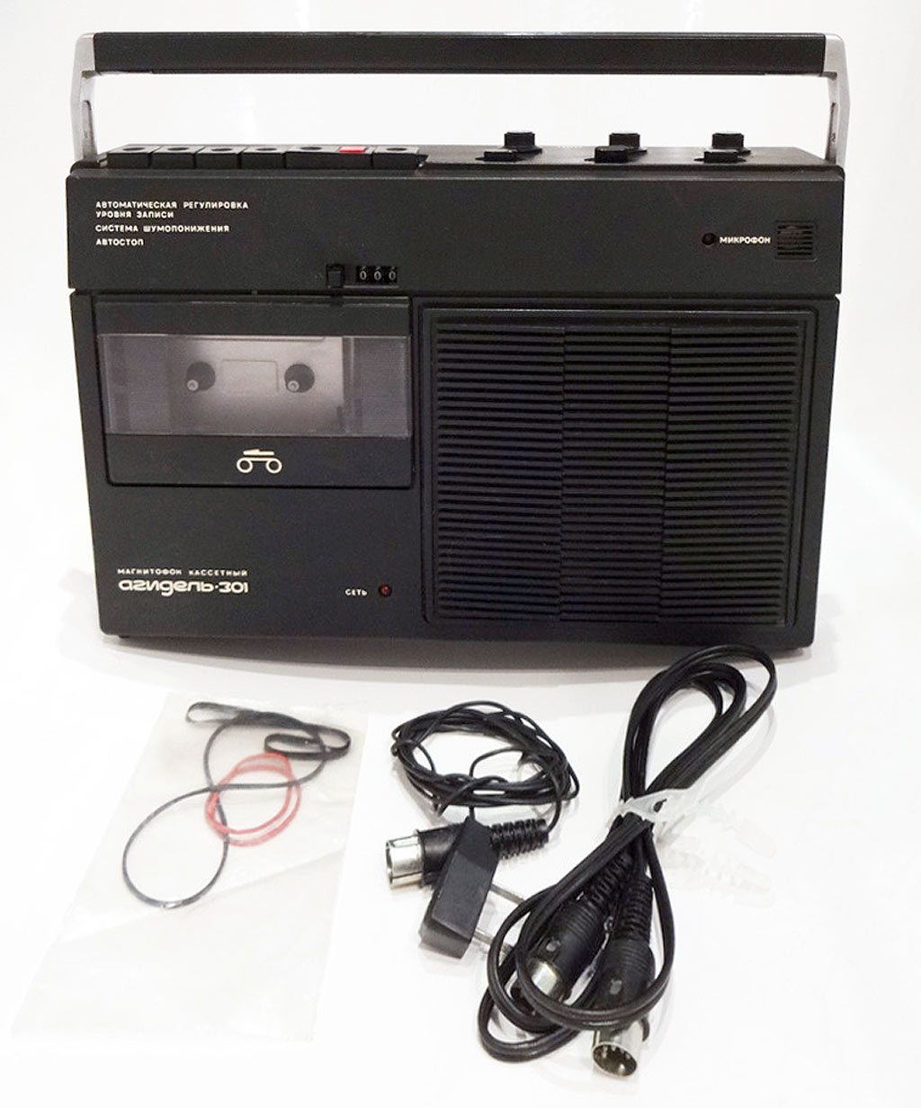 Портативный кассетный магнитофон *Агидель-301* с 1985 года выпускало Уфимское Приборостроительное ПО. Магнитофон 3-й группы сложности с универсальным питанием, предназначен для записи фонограмм на магнитную ленту в кассетах МК, с последующим воспроизведением. В модели имеется электретный микрофон, система АРУЗ, отключаемая СШП, регуляторы тембра по НЧ и ВЧ. Скорость протяжки магнитной ленты 4,76 см/сек. Относительный уровень шумов в канале З/В -52 дБ. Коэффициент гармоник на ЛВ - 4%. Коэффициент детонации - 0,3%. Полоса рабочих частот на ЛВ - 40...12500 Гц. Частота тока подмагничивания 60 кГц. Питание - шесть элементов 343 или сеть. Максимальная выходная мощность от батарей 2 Вт, от сети 2,5 Вт. Габариты магнитофона - 320х220х100 мм. Вес - 3,5 кг. По одинаковой схеме, конструкции и оформлении (кроме наименования и надписей) Воронежский завод *Электроприбор* выпускал магнитофон **Элегия-301** (описан на сайте), а Арзамасский ПСЗ имени 50-летия СССР магнитофон **Легенда-301** (выпущено всего 8 аппаратов). На задней крышке магнитофонов могли быть наименования *Агидель М-301*, *Легенда М-301* и *Элегия М-301*, то есть с добавлением буквы *М* (магнитофон). Были и без буквы.