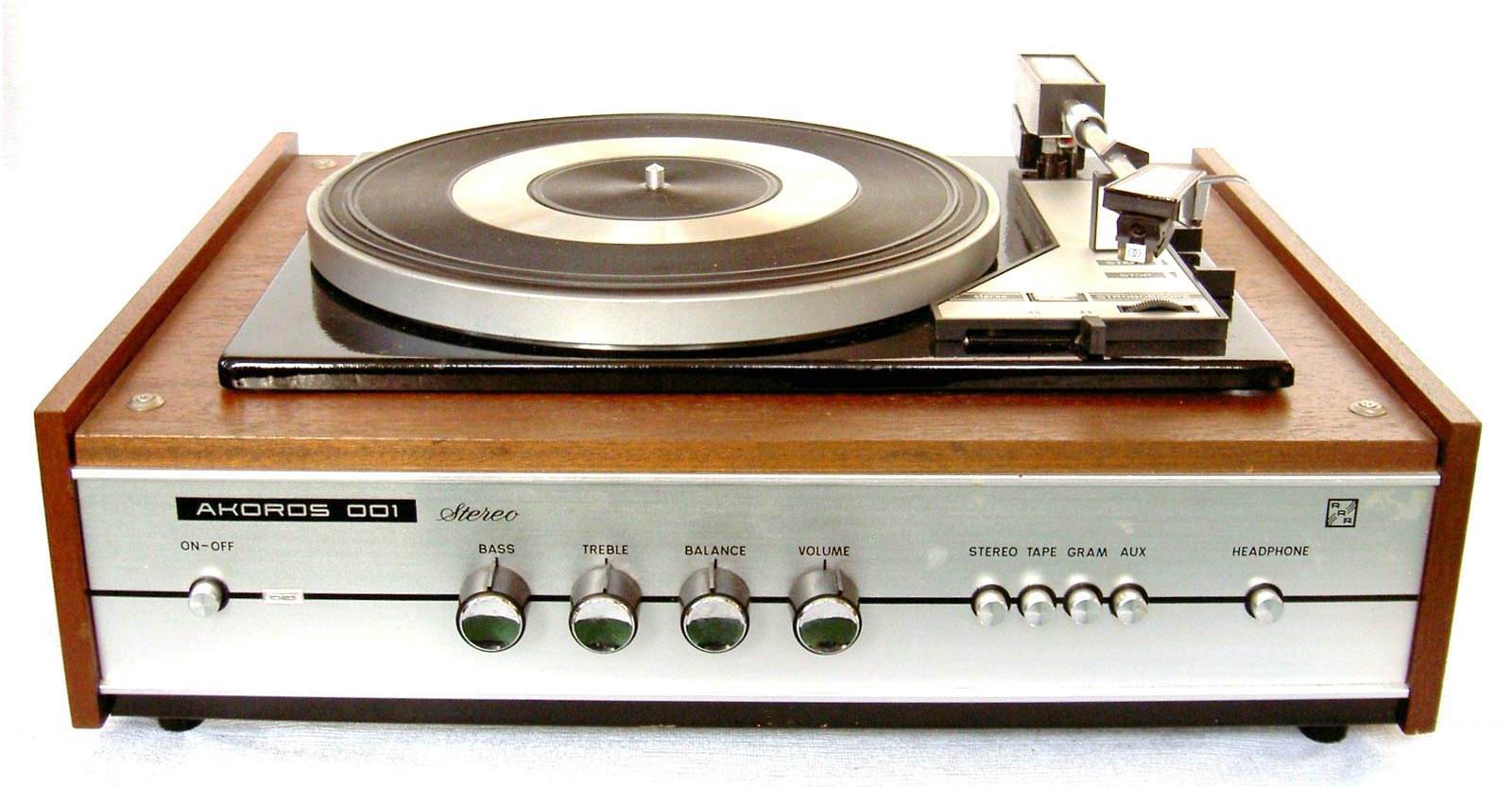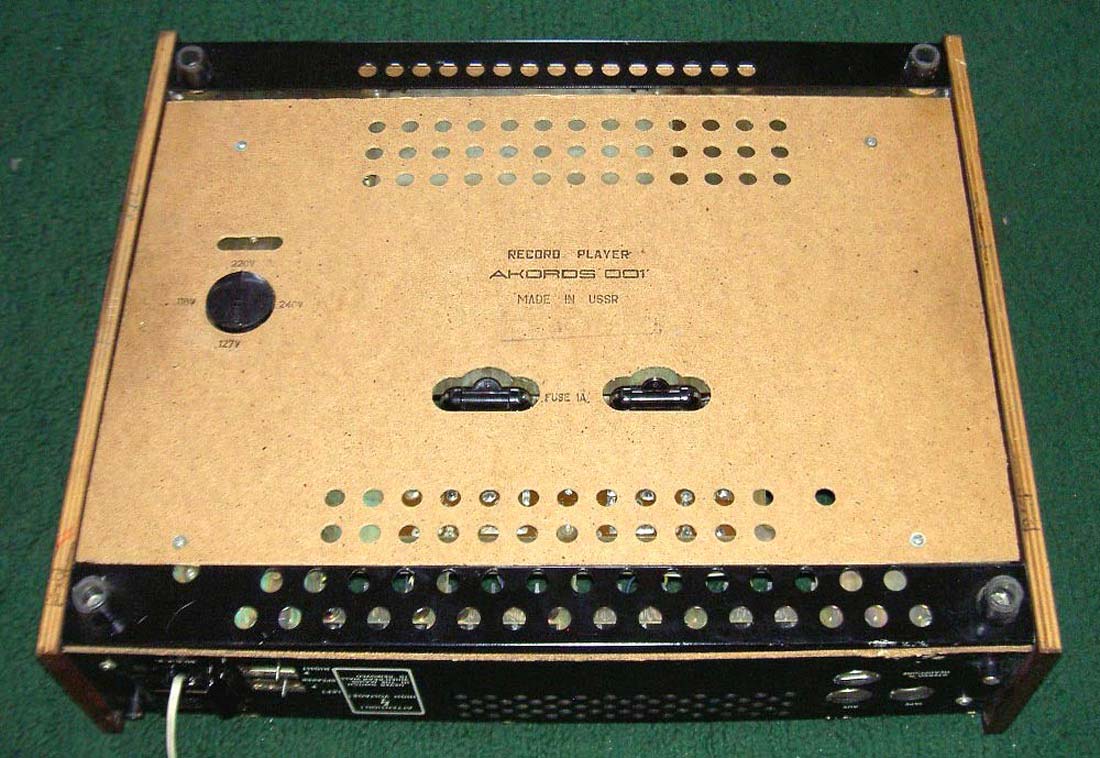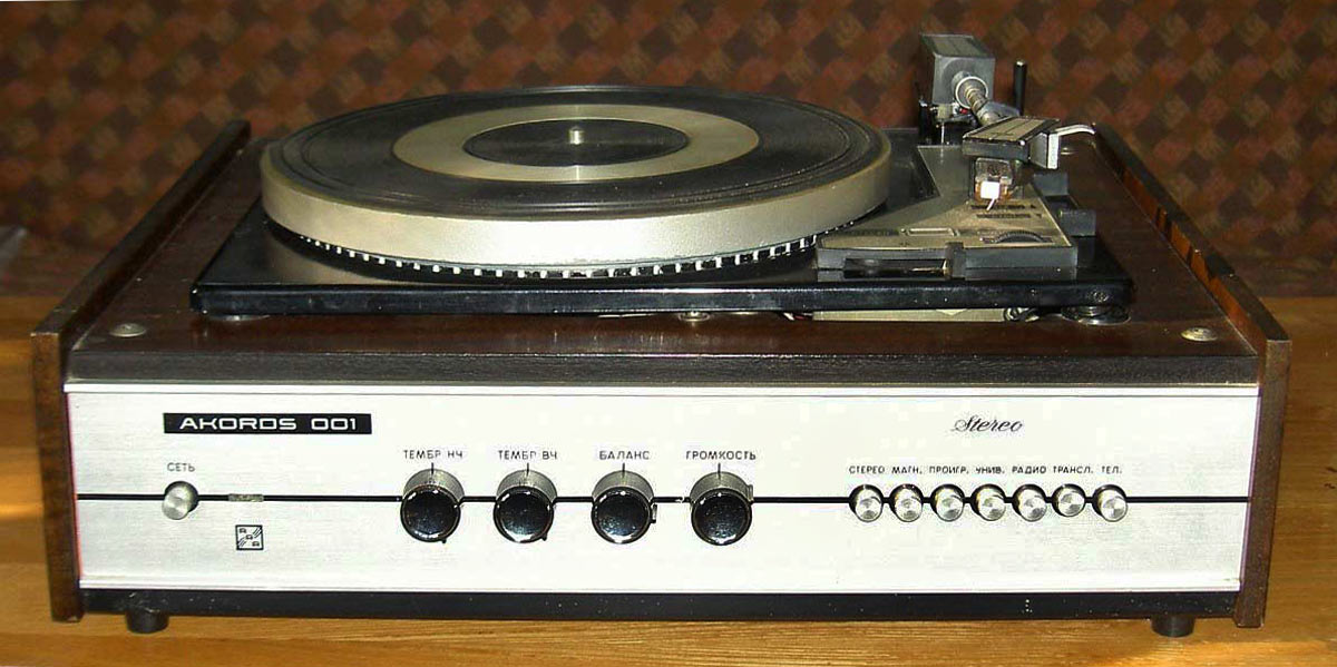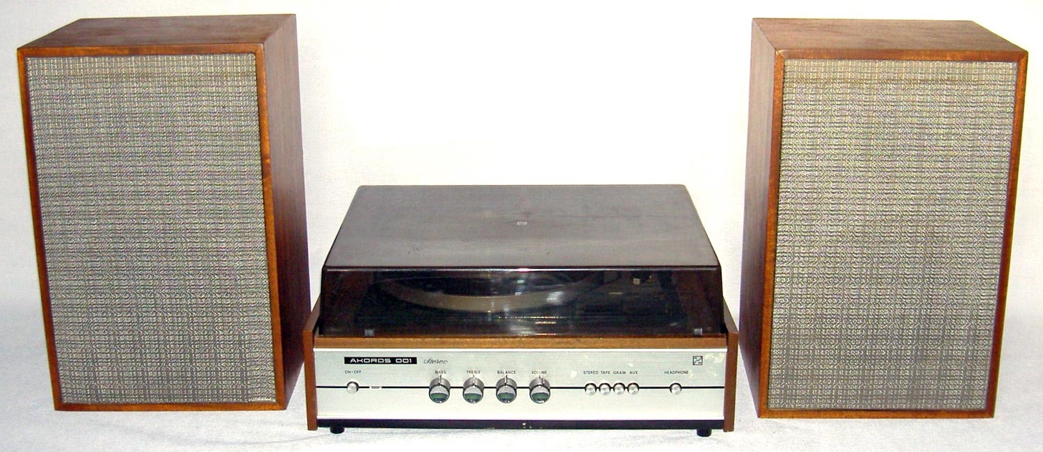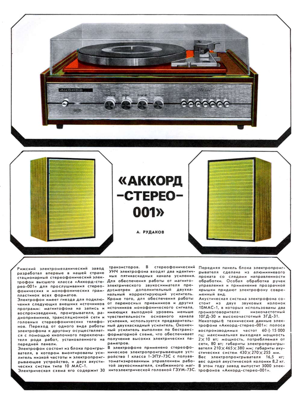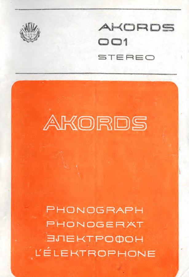 Электрофоны сетевые транзисторные *Аккорд-101-стерео* и *Аккорд-001-стерео* с осени 1972 года выпускал Рижский электромеханический завод. Электрофоны **Аккорд-101-стерео** и **Аккорд-001-стерео** одинаковы. Сначала электрофон позиционировался как первый класс, затем был переведён в высший, так как по многим своим параметрам, кроме ЭПУ ему соответствовал. Стереофонический электрофон **Аккорд-001 стерео** один из первых электрофонов высшего класса в СССР. Он рассчитан на прослушивание моно и стерео пластинок всех форматов и состоит из проигрывателя, в котором размещены усилитель низкой частоты и ЭПУ и двух акустических систем. Для магнитоэлектрического звукоснимателя имеется корректирующий усилитель, а для работы с других источников использован предварительный усилитель. В модели применено стереофоническое ЭПУ типа I-ЭПУ-73С - с полуавтоматическим управлением звукоснимателем и магнитоэлектрической головкой ГЗУМ-73С. АС состоит из двух звуковых колонок **10MAC-1**, в которых установлено по два громкоговорителя: один 10ГД-30 и один ЗГД-15М. Электрофон имеет гнёзда для подключения трансляционной сети, магнитофона, приёмника или стереотелефонов. Переход от одного вида работы к другому осуществляется с помощью кнопочного переключателя рода работ, установленного на передней панели. Полоса рабочих звуковых частот электрофона 60...15000 Гц. Максимальная выходная мощность 2х10 Вт. Габариты модели 210х465х380 мм. Габариты одной АС - 430х270х255 мм. Вес электропроигрывателя без упаковки - 16,5 кг. Вес каждой АС - 8,2 кг.