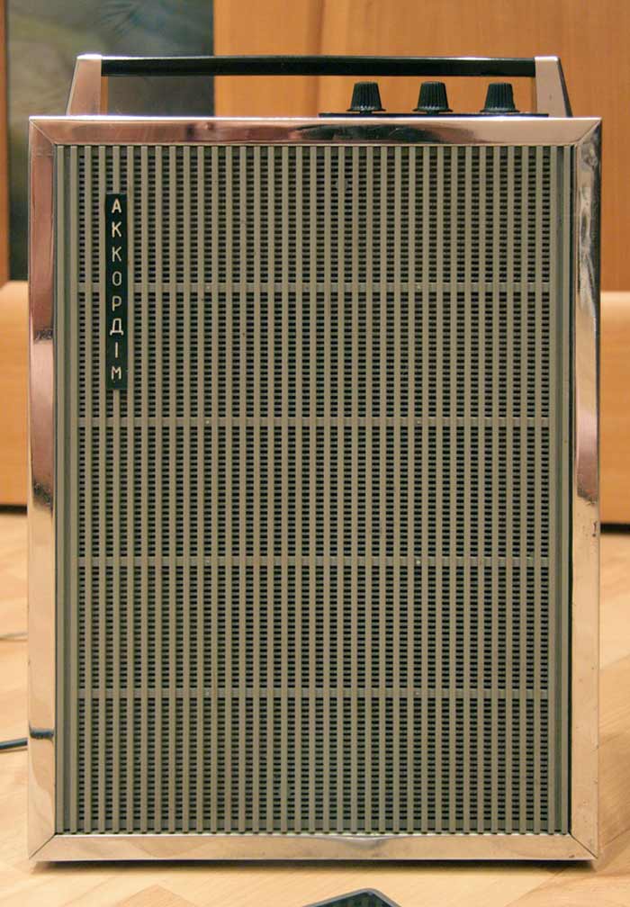 Электроакустический агрегат *Аккорд-М* с 1972 года выпускалась Смоленским заводом *Кентавр*. Предназначен для усиления звучания щипковых инструментов, а так же сигналов со звукоснимателя, магнитофона, приёмника или радиолинии. Питание агрегата осуществляется от специального батарейного блока или от электрической сети через блок питания вставляемого вместо батарейного блока. Номинальная выходная мощность усилителя при питании от батарей - 2,5 Вт, от сети - 3 Вт. Диапазон частот воспроизводимых по звуковому давлению не уже 80...10000 Гц, напряжению 60...12000 Гц. Габариты агрегата 290х140х445 мм. Масса без отсека питания 4 кг.
