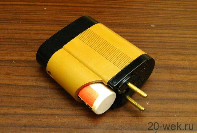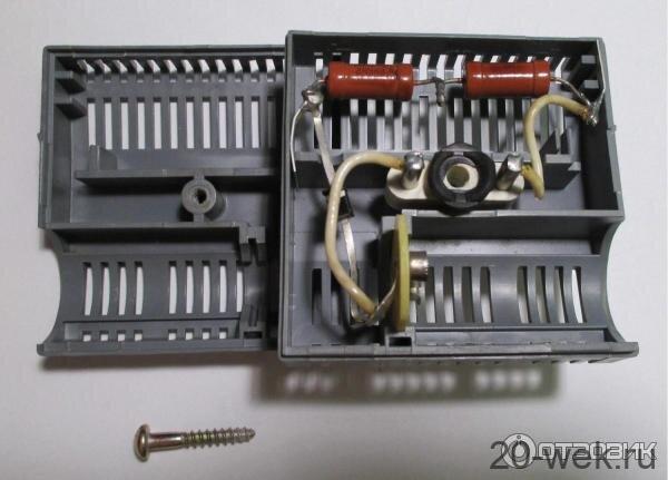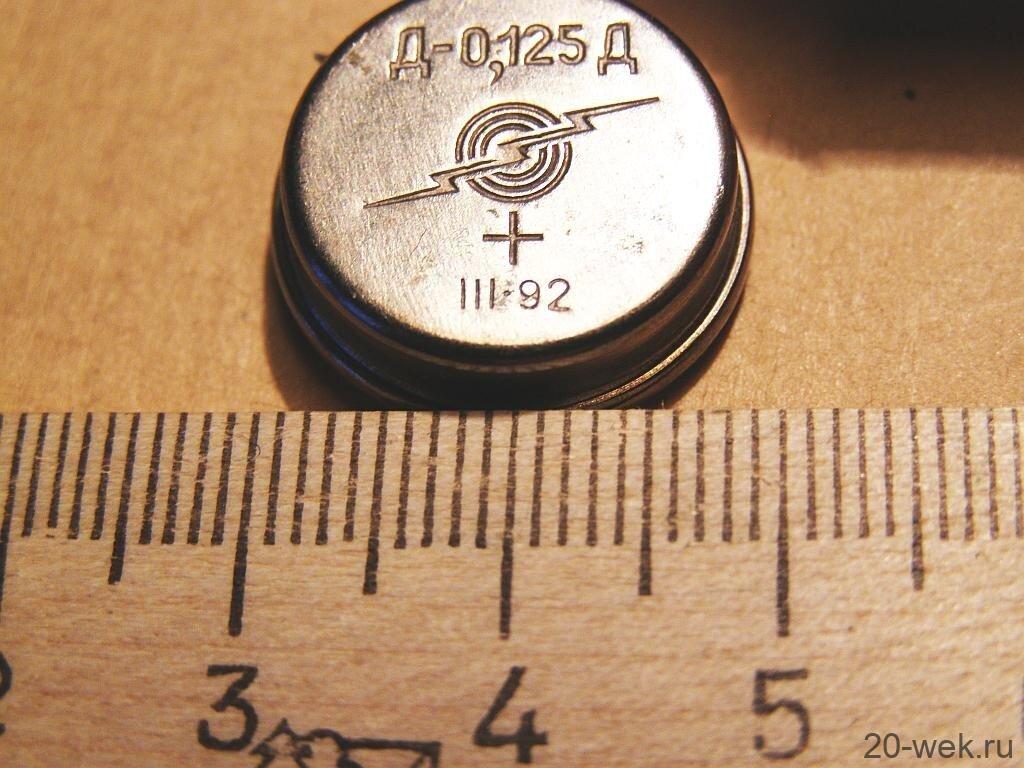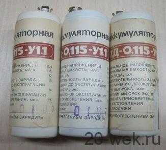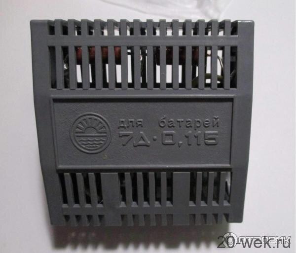 7Д-0,1 - это единственная аккумуляторная батарея напряжением близким к 9В выпускавшаяся в СССР. И самое интересное, что такие аккумуляторы, судя по всему выпускаются до сих пор, по непроверенной информации ОАО "Аккумуляторная компания "Ригель" выпускает 7Д-0,125Д. И судя по тому, что буква "Д" написана латиницей это может быть правдой, в СССР латиницей не писали. Хотя возможно это "перестроечные" шутки производителя. Циферки после тире, в названии, обозначали емкость. Были 7Д-0,1, 7Д-0,115, 7Д-0,125. Характеристики: номинальная ёмкость — 125 мА-ч; номинальное напряжение — 8, 4 В; ток разряда — 12, 5 мА (рекомендуемый — 10-20 мА, максимальный — 30 мА); конечное разрядное напряжение — 7 В; ток заряда — 12, 5 мА; время заряда — 15 часов; конечное зарядное напряжение — 10, 5 В; габаритные размеры — диаметр 23, 2 мм., высота 58 мм. без контактов; масса — 53 грамма; срок службы — 400-500 циклов; оптимальная рабочая температура — 5-35°С. Такими аккумуляторами иногда комплектовались некоторые радиоприемники, например Селга, и конечно их можно было купить в розницу. Продавались аккумуляторы в комплекте с зарядным устройством или отдельно. Если батарея продавалась отдельно, нужно было искать специальное зарядное для нее. И батареи и зарядные устройства были в Советское время достаточно дефицитны. Зарядное устройство было катастрофически простое: два резистора и диод. Иногда можно было встретить зарядное с переключателем напряжения сети, как на схеме ниже. Естественно радиолюбители не обошли стороной зарядное, проблема дефицита, да и простота заводского изделия... В журнале Радио было опубликовано несколько вариантов схем. Сам аккумулятор внутри состоял из других аккумуляторов, поменьше. Внутри находилось 7 штук дисковых Д-0,125 или Д-0,115. Были еще Д-0,1, но я такие в живую не встречал.