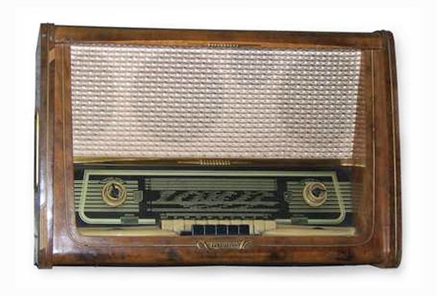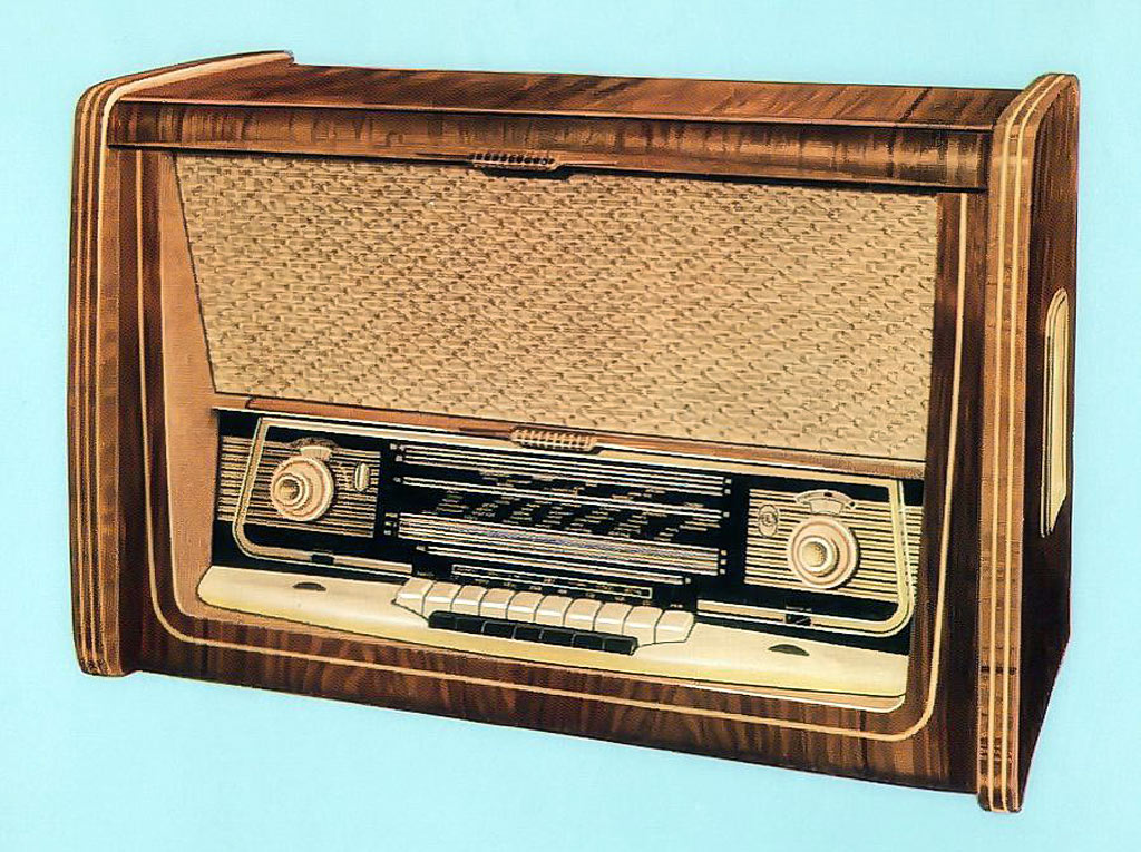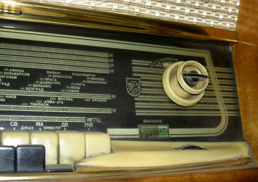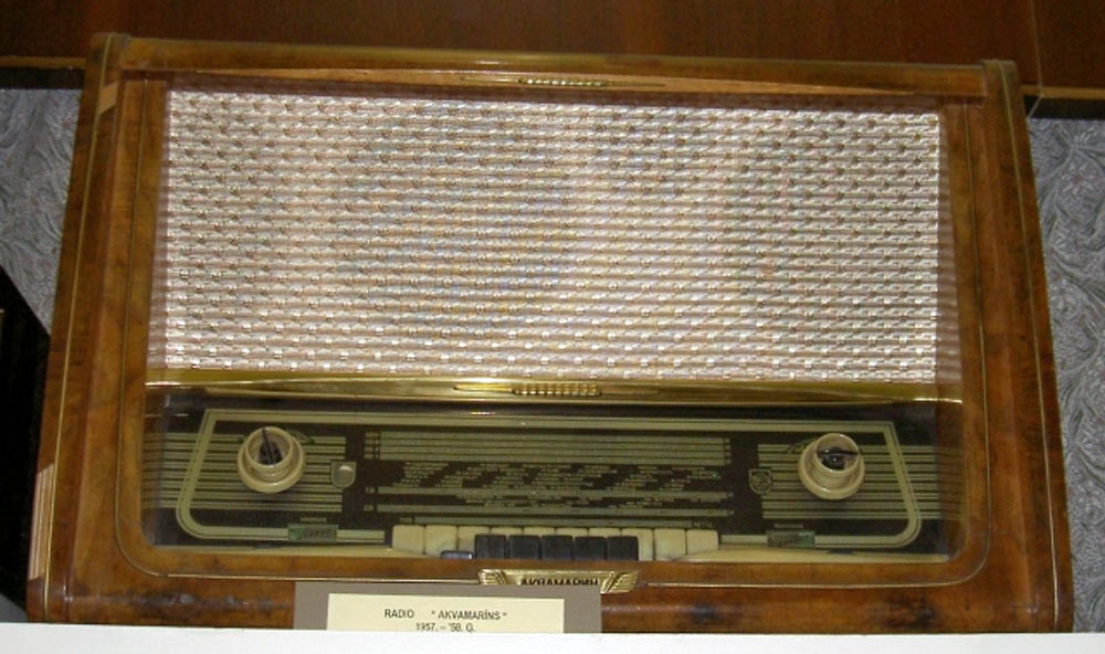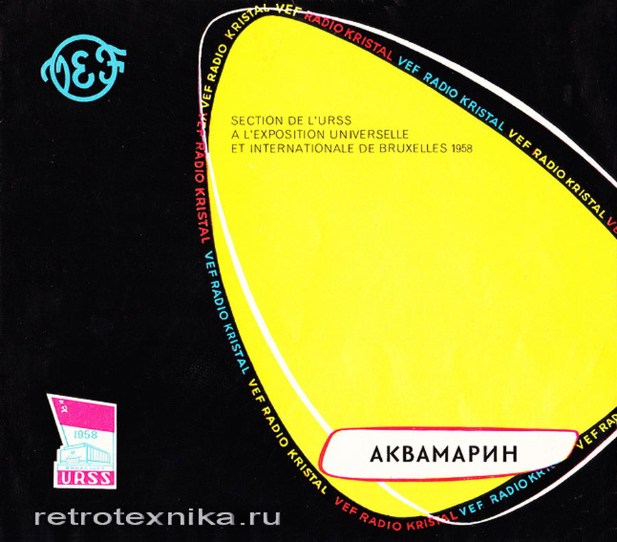 Радиоприёмник сетевой ламповый *Аквамарин* разработал в 1955 году Рижский государственный электротехнический завод ВЭФ. К 1956 году конструкторским бюро завода ВЭФ был разработан ряд моделей радиоприёмников высшего класса, которые значительно повлияли на развитие советской радиопромышленности. Многие из новых перспективных радиоприёмников демонстрировались на различных выставках, но так и не были поставлены на конвейер. Приёмники имели современный дизайн, большой набор функций (автоматическая настройка, тонрегистры, пульт ДУ, УКВ-диапазон) и высокие акустические характеристики. Опытный приёмник *Аквамарин* имеет 7 диапазонов: ДВ, СВ, КВ1..КВ4, УКВ. Нижний ряд клавиш - это тонрегистр, дискретно управляющего АЧХ усилителя НЧ и блок моторной автоматической настройки, со сложной механикой.