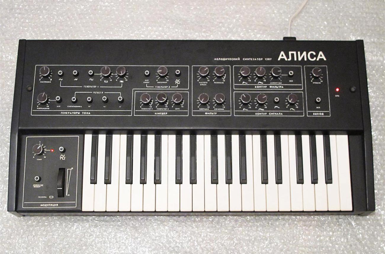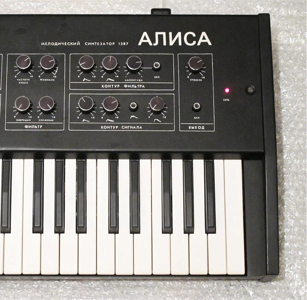 Электромузыкальный инструмент *Алиса-1387* с 1982 года выпускал Люберецкий завод электромузыкальных инструментов. ЭМИ представляет собой мелодический синтезатор, предназначен для сольного исполнения в музыкальных коллективах, а также для получения разнообразных эффектов и синтезированных звучаний. Инструмент имеет 3-х октавную клавиатуру, колесо модуляции и органы управления в виде регуляторов и кнопок. Состоит их основных синтезирующих блоков: генератор тона, фильтр, контур фильтра, контур сигнала, модуляция, микшер и выход. Управление на передней панели: Генератор тона-настройка; генератор 1: 3 формы волны, скважность, шим; портаменто (вкл); регистр: субгармоника, 32*,16*, 8*; генератор 2: вкл.синхр, интервал, форма волны (прямая, пилообразная). Микшер - генератор 1 (уровень); генератор 2 (уровень); шум (уровень). Фильтр - частота среза; резонанс; вибрация; слежение. Контур фильтра - атака; затухание; амплитуда + вкл. Контур сигнала - атака; затухание; поддержка (вкл); спад. Модуляция - темп; вкл.формы волны; перекл. генератор/фильтр; глубина (колесо). Выход - общий уровень; вкл. выхода. Разъемы задней панели: Выход линейный. Сеть (вкл). Разъём сети. Внешний запуск - генератор, выход, вход, вкл. Передняя панель - выход на наушники.