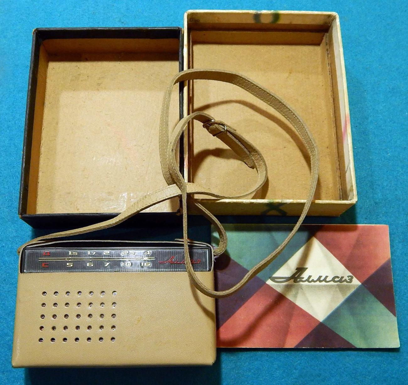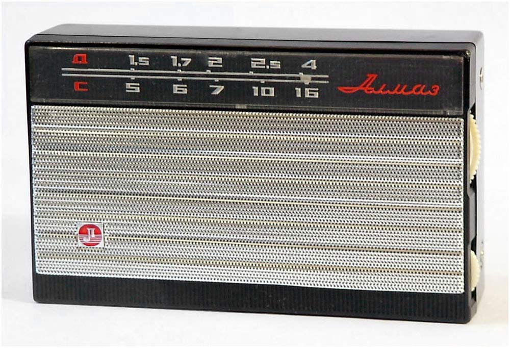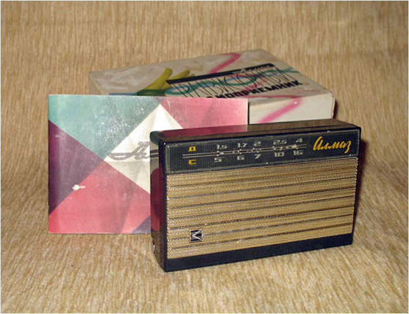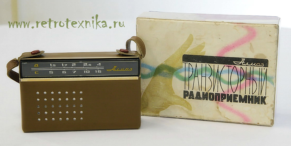 Портативный радиоприёмник 4-го класса *Алмаз* с 1964 года выпускали Ленинградские заводы *Новатор и *Радиоприбор*. Питание - аккумуляторная батарея 7Д-0,1 или Крона. Номинальная выходная мощность 50 мВт. Диапазоны СВ, ДВ, где чувствительность 1,5 мВ/м и 2,5 мВ/м. Избирательность по соседнему каналу 16 и 20 дБ, по зеркальному 20 дБ. Диапазон воспроизводимых частот звука 450...3000 Гц. Основные параметры сохраняются при снижении напряжения питания до 7,2 В. Габариты модели 134х83х34 мм. Масса 380 гр. Для переноски приёмник помещается в кожаный футляр. Приёмник выпускали в разных вариантах оформления до 1972 года. Завод *Радиоприбор* для использования заделов по окончании выпуска модели выпускал и ремонтные комплекты для мастерских и радиолюбителей состоящие из корпуса с громкоговорителем, платы (собранной и настроенной или плату и комплектующих) из которых можно было собрать аналогичный приёмник. Стоимость такого приёмника была на 30% дешевле заводского. Радио №1/1965, ст. 30