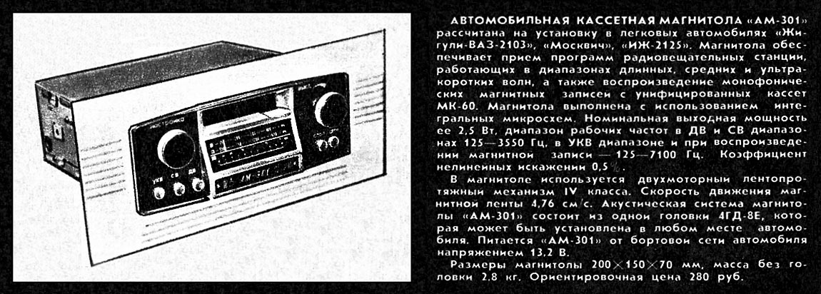 Автомобильная магнитола *АМ-301* с 1974 года выпускалась Загорским ПО *Звезда*. Магнитола рассчитана на установку в автомобили Жигули *ВАЗ-2103* и Москвич *ИЖ-2125*. Она обеспечивает приём радиостанций работающих в диапазонах ДВ, СВ и УКВ, а также для воспроизведения монофонических магнитных записей с унифицированных кассет МК-60. Номинальная выходная мощность 2,5 Вт. Диапазон воспроизводимых частот в АМ диапазонах 125...3550 Гц, на УКВ и при воспроизведении магнитной записи 125...7100 Гц. В магнитоле используется двухмоторный ЛПМ. АС состоит из громкоговорителя 4ГД8Е. Размеры магнитолы - 200х150х70 мм. Масса без АС - 2,8 кг. Цена комплекта 280 рублей. С 1978 года на Гродненском заводе автомагнитол выпускалась автомагнитола *Гродно-301*, аналог магнитолы *АМ-301*.
