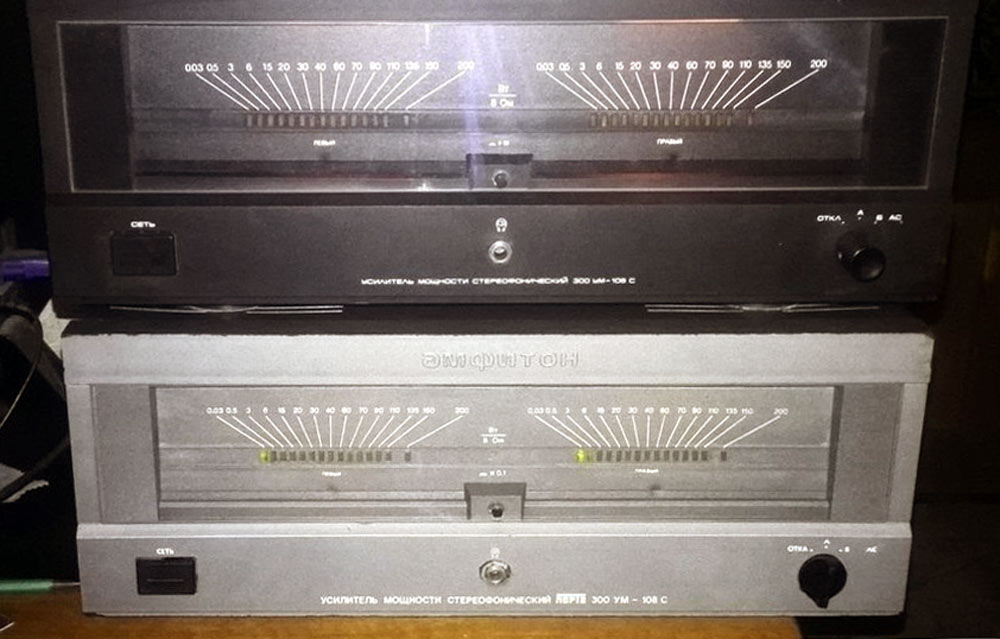 Усилитель мощности *Амфитон-150УМ-108С* выпускаемый с 1993 года рассчитан на совместную работу с предварительным усилителем ЗЧ. От других УЗЧ отличается большей выходной мощностью, позволяющей в полной мере реализовать возможности высококачественных источников звуковых сигналов, например проигрывателей компакт-дисков. Усилитель имеет электронную защиту от КЗ в нагрузке УС, тепловую защиту, а также защиту АС от постоянного напряжения на выходе УМ. Предусмотрена электронная индикация уровня выходной мощности. Номинальная выходная мощность на нагрузке 4 Ом 150, максимальная 400 Вт; диапазон воспроизводимых частот 20...30000 Гц; коэффициент гармоник 0,08%; отношение сигнал/шум 112 дБ; габариты УМ 430х175х368 мм; масса 15,5 кг. С 1994 года УМ выпускался под названием *Амфитон-300УМ-108С*.