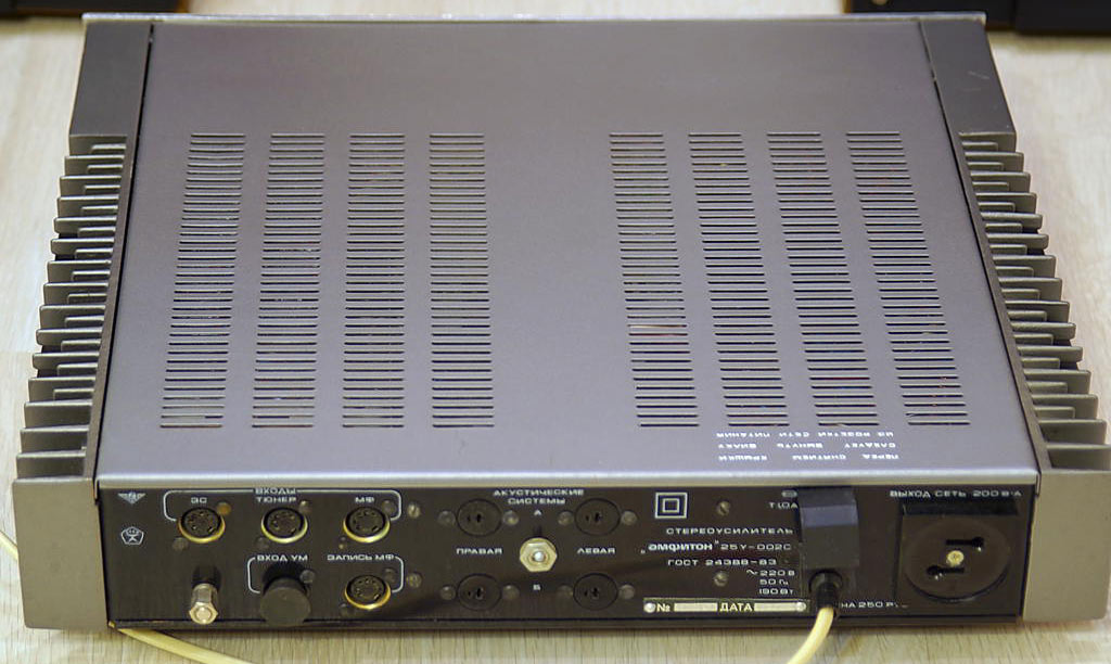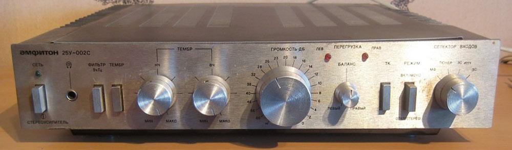 Усилитель низкой частоты *Амфитон 25У-002С* с 1983 года выпускало Львовское ПО имени Ленина (ПО Лорта). Усилитель предназначен для высококачественного усиления сигналов от различных источников. Основные технические характеристики: Диапазон воспроизводимых частот: 20...25000 Гц. Неравномерность АЧХ в диапазоне 20...25000 Гц: ±0,7 дБ. Сопротивление подключаемых АС: 4 Ом. Выходная мощность на канал: номинальная: 25 Вт, максимальная: 100 Вт. Коэффициент гармоник в диапазоне 40...16000 Гц: 0,13%. Переходное затухание между каналами на частоте: 250 Гц и 10000 Гц: 38 дБ, 1000 Гц: 48 дБ. Отношение сигнал/взвешенный шум в номинальных условиях на входах: линейных мф и тюнер: 83 дБ, корректирующего зс: 72 дБ. Пределы регулировки: звуковых частот: 10 дБ, стереобаланс: ±26 дБ, тембр НЧ: ±11 дБ, тембр ВЧ: ±10 дБ, ручная регулировка громкости: 60 дБ. Потребляемая мощность от сети: 105 Вт. Размер усилителя: 387х88х390 мм. Вес: 9 кг.