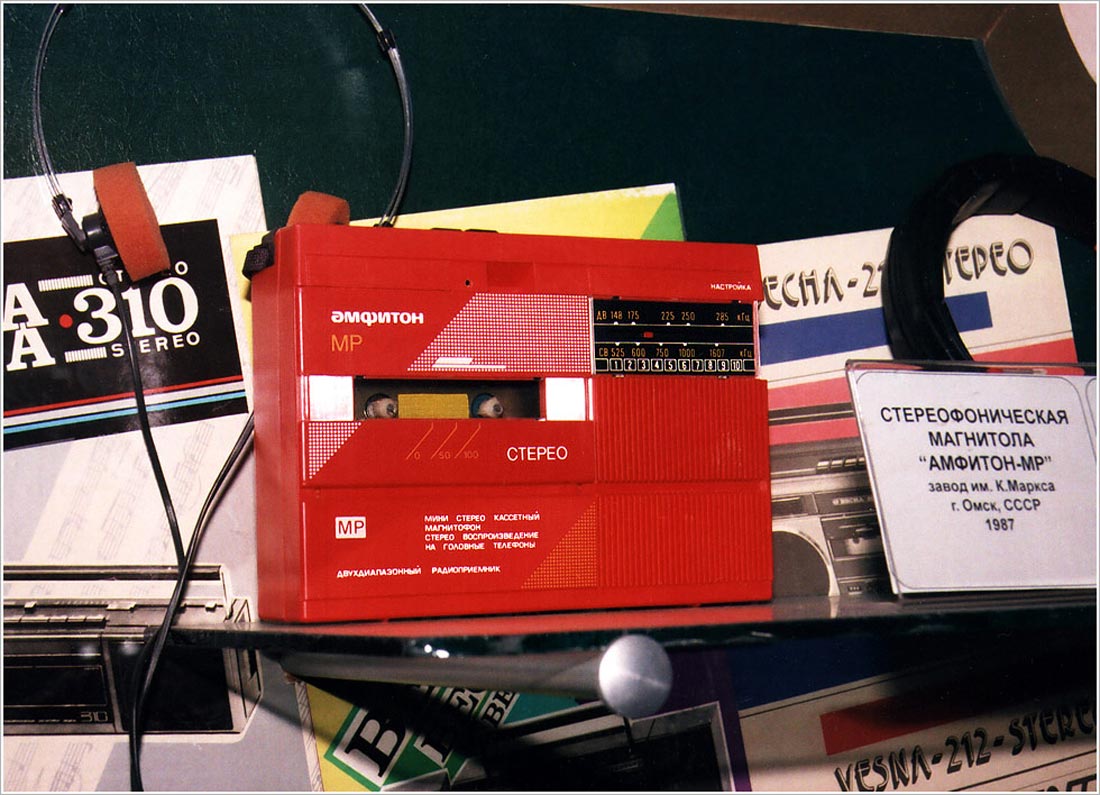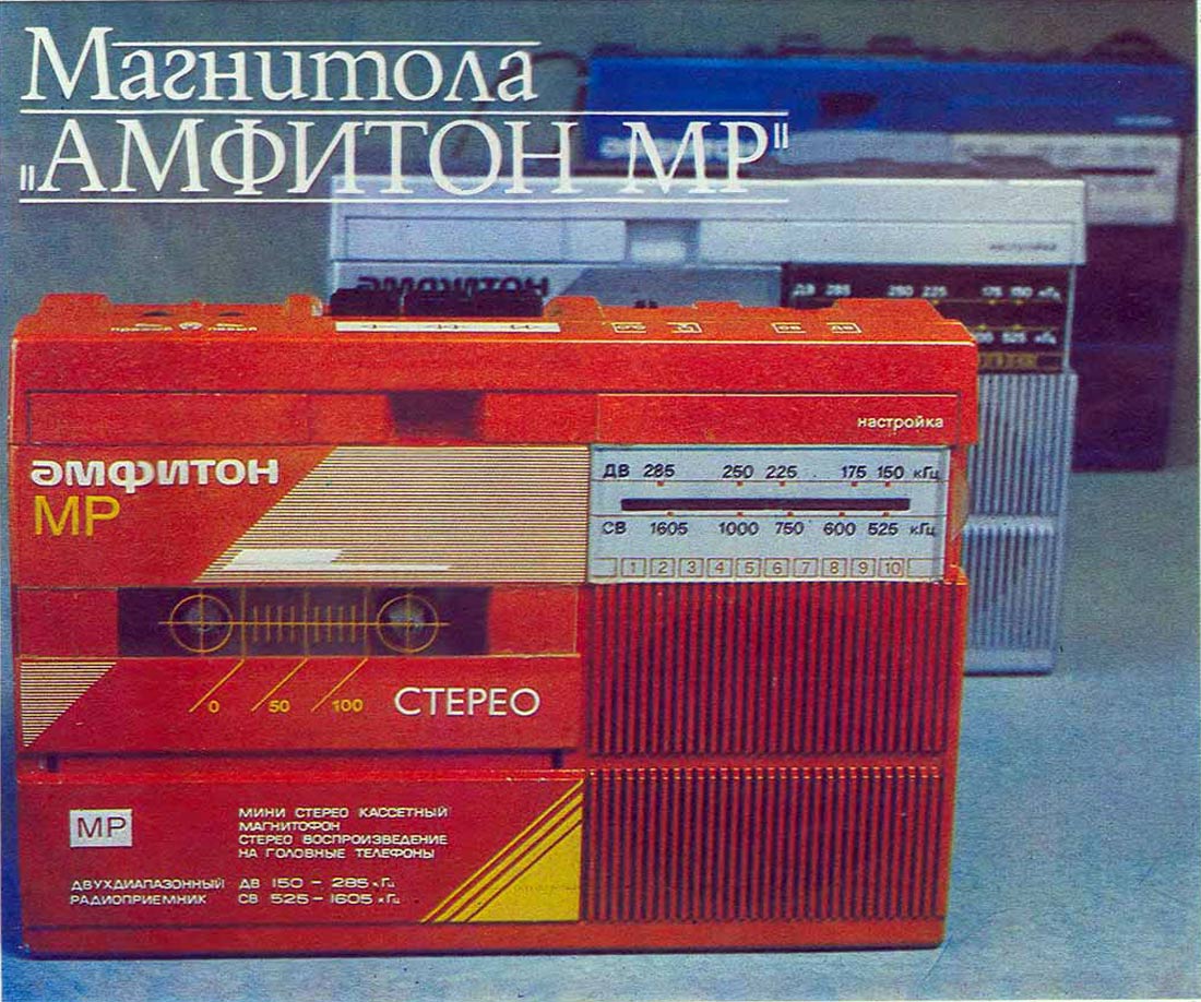 Портативная транзисторная магнитола *Амфитон-МР* с I-кв 1987 года выпускал Омский завод им. Карла Маркса и Бакинское ПО *Радиостроение*. Магнитола служит для приёма радиостанций в диапазонах ДВ, СВ и для прослушивания моно и стерео (на головные стереотелефоны) фонограмм с компакт-кассет. Имеется ускоренная перемотка ленты в обоих направлениях, раздельная регулировка громкости при работе на стереотелефоны. Питание от 6 элементов А-316 или сеть через внешний БП. Чувствительность в диапазоне ДВ - 2, СВ - 1,5 мВ/м; селективность 30 дБ; диапазон воспроизводимых частот по звуковому давлению при приёме 315...3150 Гц; на телефонном выходе при прослушивании кассет 63...12500 Гц; КНИ 5%; максимальная выходная мощность 0,5 Вт; коэффициент детонации ±0,5%; размеры модели 196х136х41мм, масса 0,8 кг. Цена с телефонами 145 рублей. С 1988 года оформление магнитолы было несколько изменено. Магнитола выпускалась ограниченной серией, а в Баку лишь штучной.