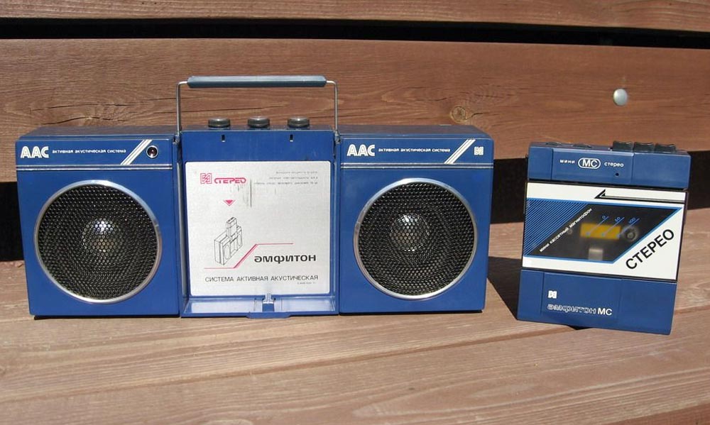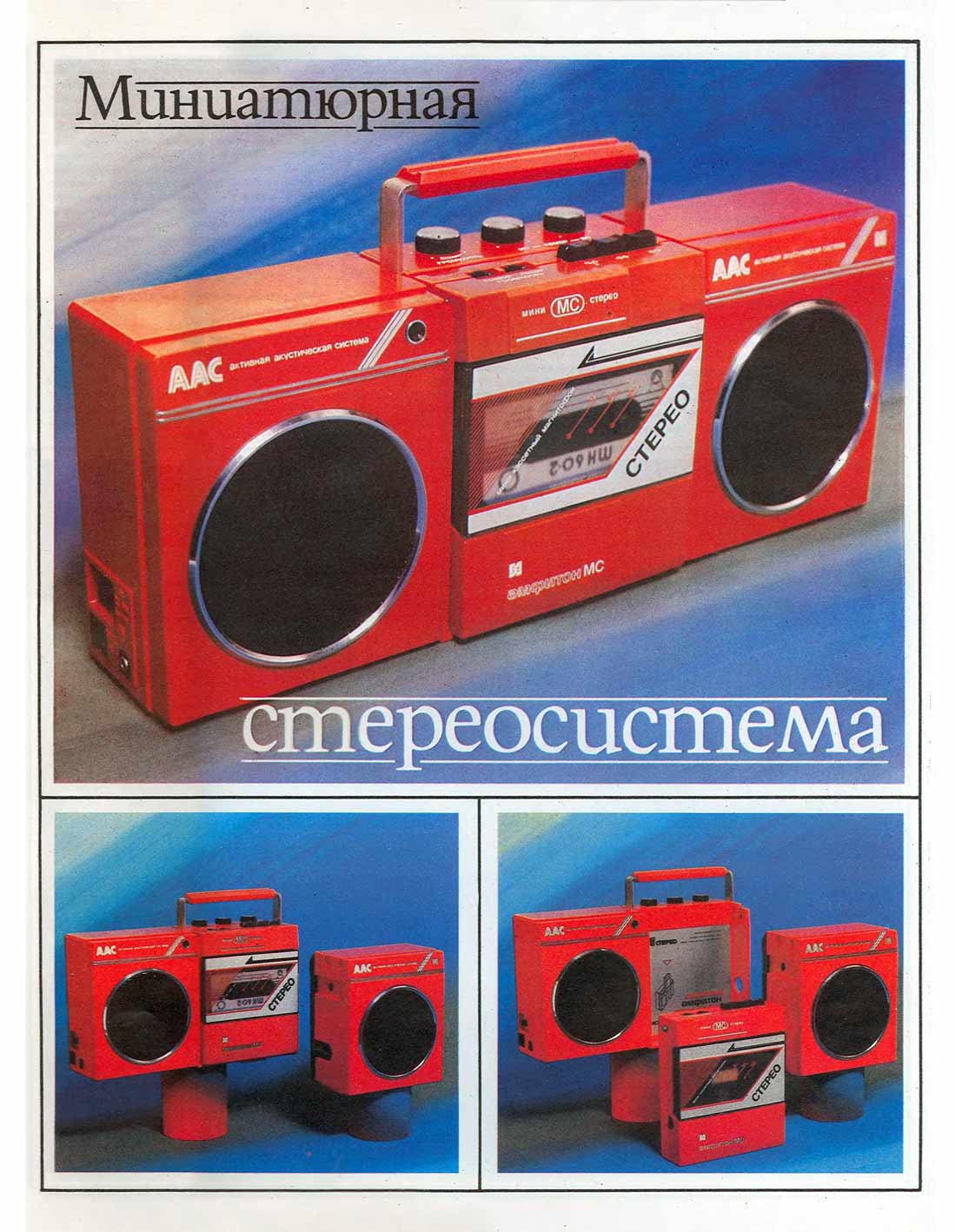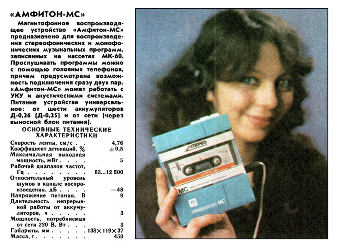 Стереосистема *Амфитон* с 1987 года выпускалась Омским ЭТЗ К. Маркса. **Амфитон** переносный блочный аппарат, состоящий из магнитофона - проигрывателя **Амфитон-МС**, стереофонической акустической системы *ААС* и блока питания. **Амфитон ААС** состоит из объединенного с АС левого канала усилителя низкой частоты и АС правого канала. В блоке ААС имеется регулировка громкости и тембра низких и высоких частот, к ней можно подключить стереотелефоны. Питается акустический блок (ААС) от батарей А-343 или от сети через встроенный блок питания. Номинальная выходная мощность ААС - 2х0,5 Вт. Диапазон частот на ЛВ - 80...16000, по звуковому давлению 150...10000 Гц. Время работы от батарей 10 часов. Габариты основного блока 342х143х85 мм; масса 2,2 кг. Цена комплекта из ААС *Амфитон*, МП *Амфитон МС* и блока питания - 176 рублей.