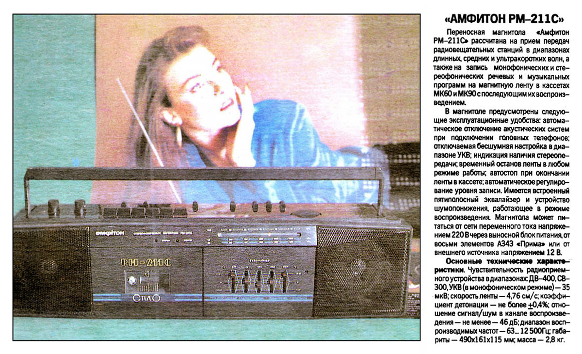 Переносная кассетная магнитола *Амфитон РМ-211С* с 1993 года планировалась к выпуску Львовским объединением РТА. Рассчитана для приёма в диапазонах ДВ, СВ, УКВ и на запись моно или стереофонических фонограмм на магнитную ленту в кассетах типа МК-60, с последующим воспроизведением. В магнитоле имеются: автоотключение АС при подключении телефонов; отключаемая бесшумная настройка в диапазоне УКВ; индикация наличия в эфире стереопередачи; временный останов ленты в любом режиме работы ЛПМ; автостоп при окончании ленты; АРУЗ. Имеется встроенный пятиполосный эквалайзер и блок шумопонижения работающий в режиме воспроизведения. Магнитола питается от сети переменного тока через выносной БП, от 8 элементов А343 или внешнего источника 12 В. Чувствительность приёмника в диапазонах: ДВ 400 мкВ, СВ 300 мкВ, УКВ 35 мкВ в режиме моно; скорость протяжки ленты 4,76 см/с; коэффициент детонации ±0,4%; отношение сигнал/шум в канале воспроизведения -46 дБ; диапазон воспроизводимых частот магнитолы на ЛВ 63...12500 Гц; габариты модели 490х161х115 мм; вес 5,3 кг.