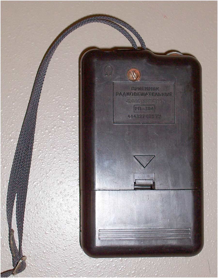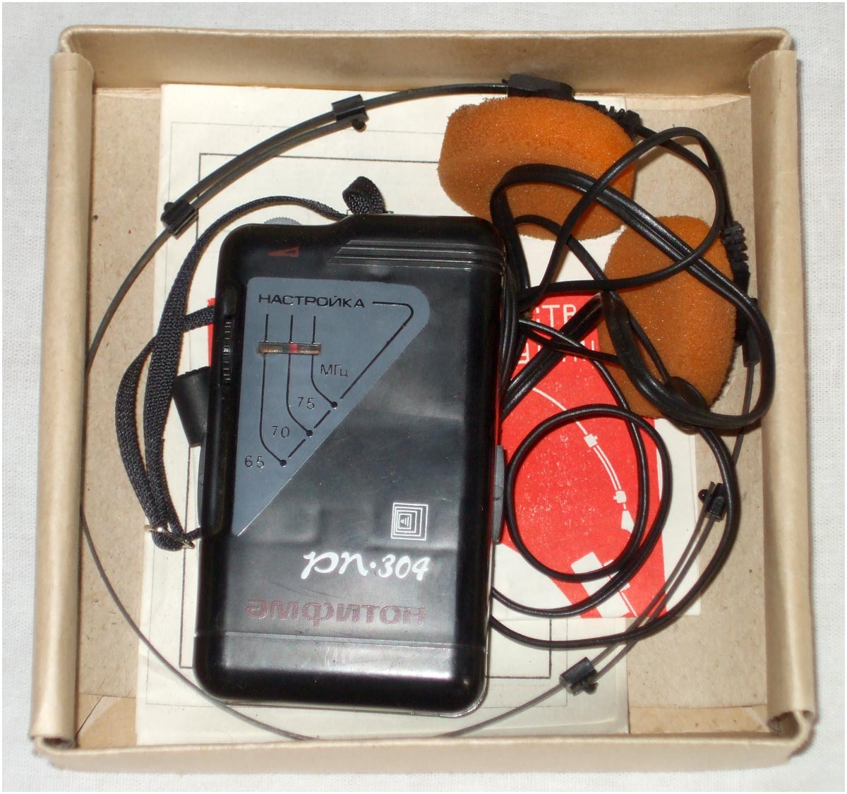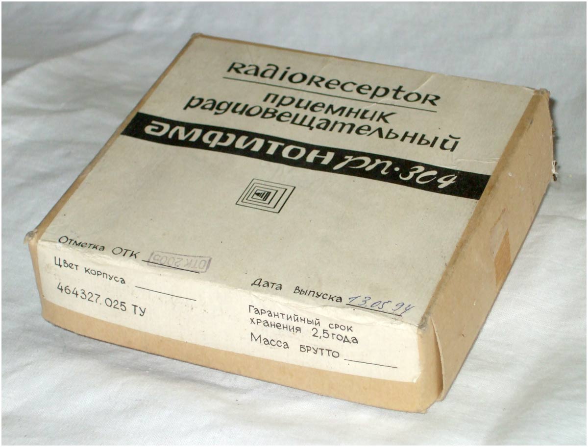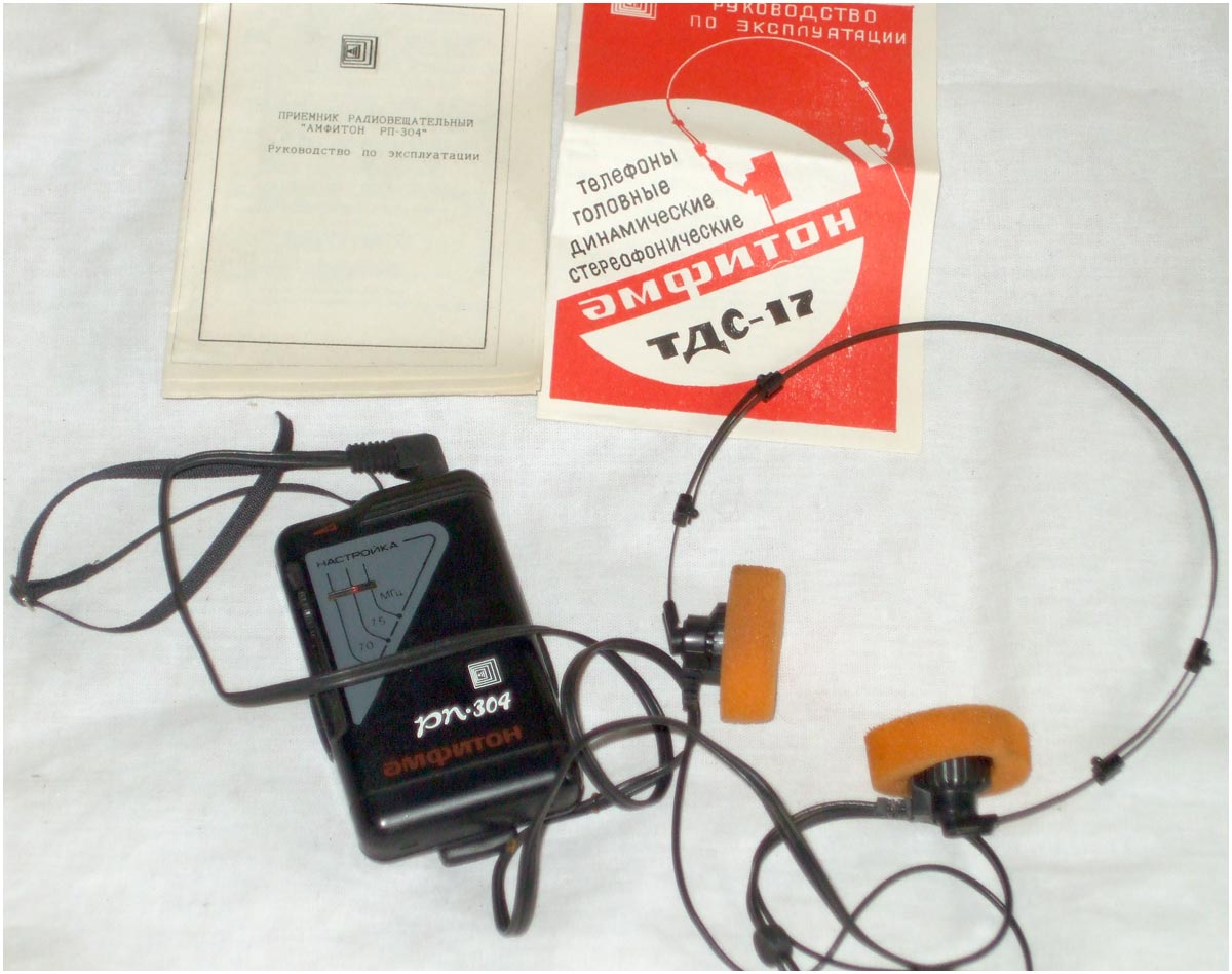 Малогабаритный радиоприёмник *Амфитон РП-304* с 1994 года выпускало Кишинёвское ПО *Счётмаш*. Приёмник радиовещательный **Амфитон РП-304** предназначен для приёма сигналов радиовещательных станций в диапазоне УКВ-ЧМ. Прослушивание принимаемых передач осуществляется через головные стереофонические телефоны в режиме **моно**. Питание обеспечивается от одной батареи типа **Корунд**. Время работы при средней громкости составляет 30 часов, при работе не более 4 часов в сутки. Технические характеристики радиоприёмника: Диапазон принимаемых частот; 65,8...74 Мгц. Чувствительность, ограниченная шумом, при отношении сигнал/шум 26 дБ, по напряжению со входа для внешней антенны 150 мкВ. Односигнальная избирательность по зеркальному каналу на частоте 69 Мгц - 18 дБ. Ток покоя 18 мА. Максимальная выходная мощность 100 мВт. Масса приёмника без батареи и наушников 100 гр. Габариты модели 105х66х28 мм.