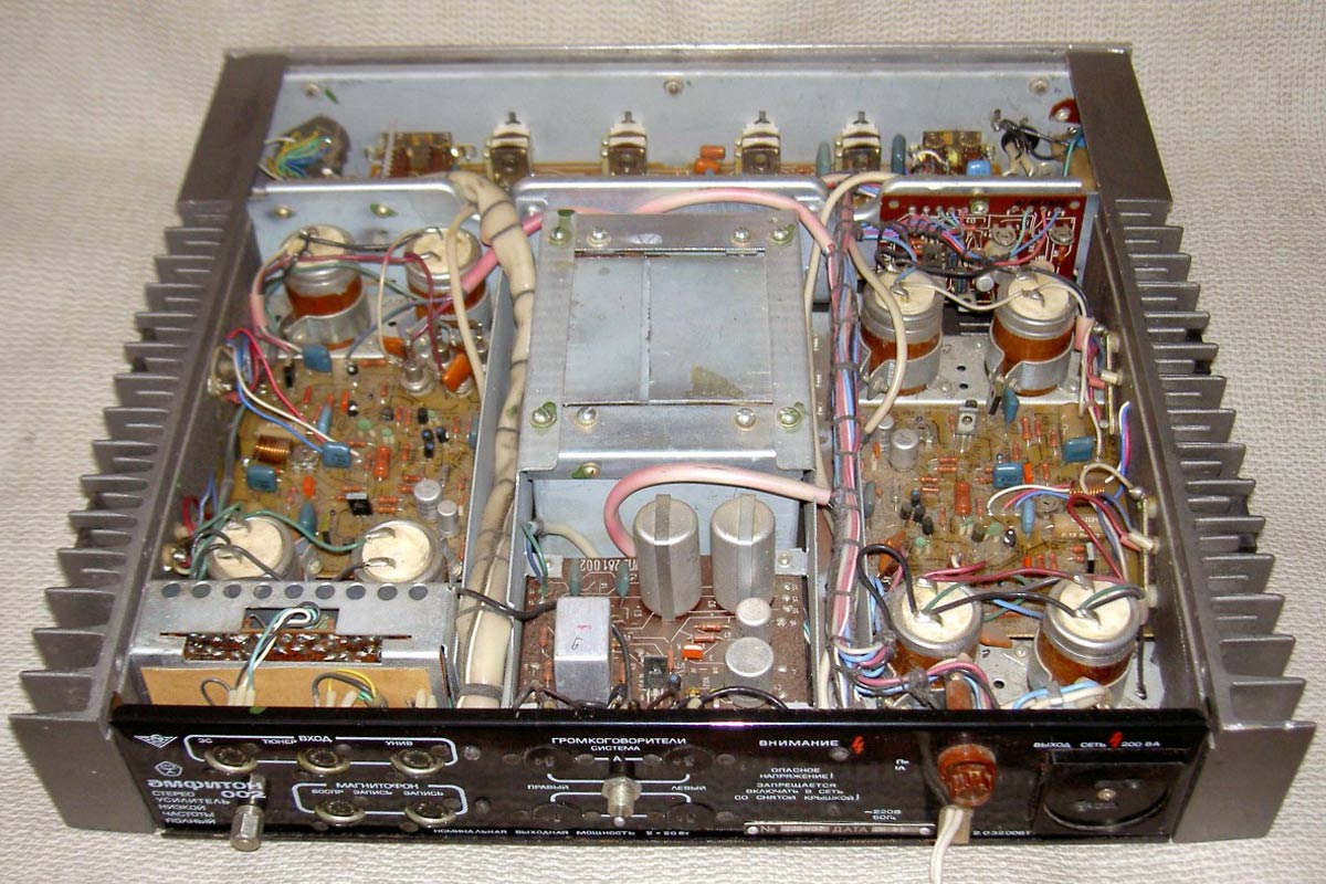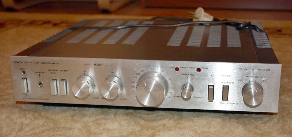 Стереофонический полный усилитель *Амфитон У-002-стерео* с 1983 года выпускало Львовское ПО им. Ленина. Усилитель высшей группы сложности **Амфитон У-002-стерео** обеспечивает высококачественное усиление фонограмм в стерео и моно режимах при работе от различных источников. В нём предусмотрены: возможност оперативного выбора источника сигнала с помощью переключателя **Селектор**; ограничительные фильтры по высшим и инфранизким звуковым частотам; наличие двух режимов работы (режим стерео и моно); регуляторы тембра по ВЧ и НЧ: регулировка уровня громкости с тонкомпенсацией; перевод усилителя в режим линейного усиления; слуховой контроль качества записываемого сигнала на магнитофон; электронная защита от коротких замыканий на выходе УНЧ; автоматическое отключение акустических систем при неисправности усилителя. Выходная номинальная мощность 2х25 Вт. Диапазон рабочих частот 20...25000 Гц. Коэффициент гармоник 0,15%. Габариты аппарата 390х88х390 мм, масса 9 кг. Цена 250 руб.