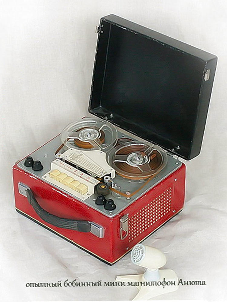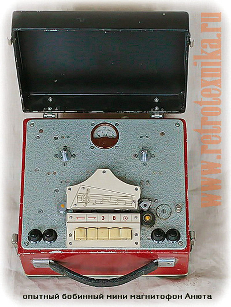 Малогабаритный катушечный магнитофон *Анюта* изготовлен предположительно в 1960 году. Данных по магнитофону никаких. По фотографиям можно предположить что это односкоростной (9,53 см/сек) магнитофон изготовленный на одном из оборонных заводов страны. Вполне допускаю что это самоделка, сделанная радиолюбителем на заводе.