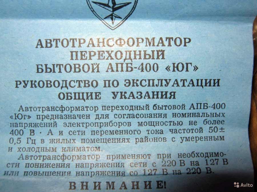 Автотрансформатор переходной бытовой *АПБ-400* выпускался предположительно с 1977 года несколькими предприятиями. АПБ предназначен для согласования входных напряжений электроприборов мощностью до 400 ватт с электрической сетью. Если в сети 127 В, то на выходе автотрансформатора 220 В или наоборот.