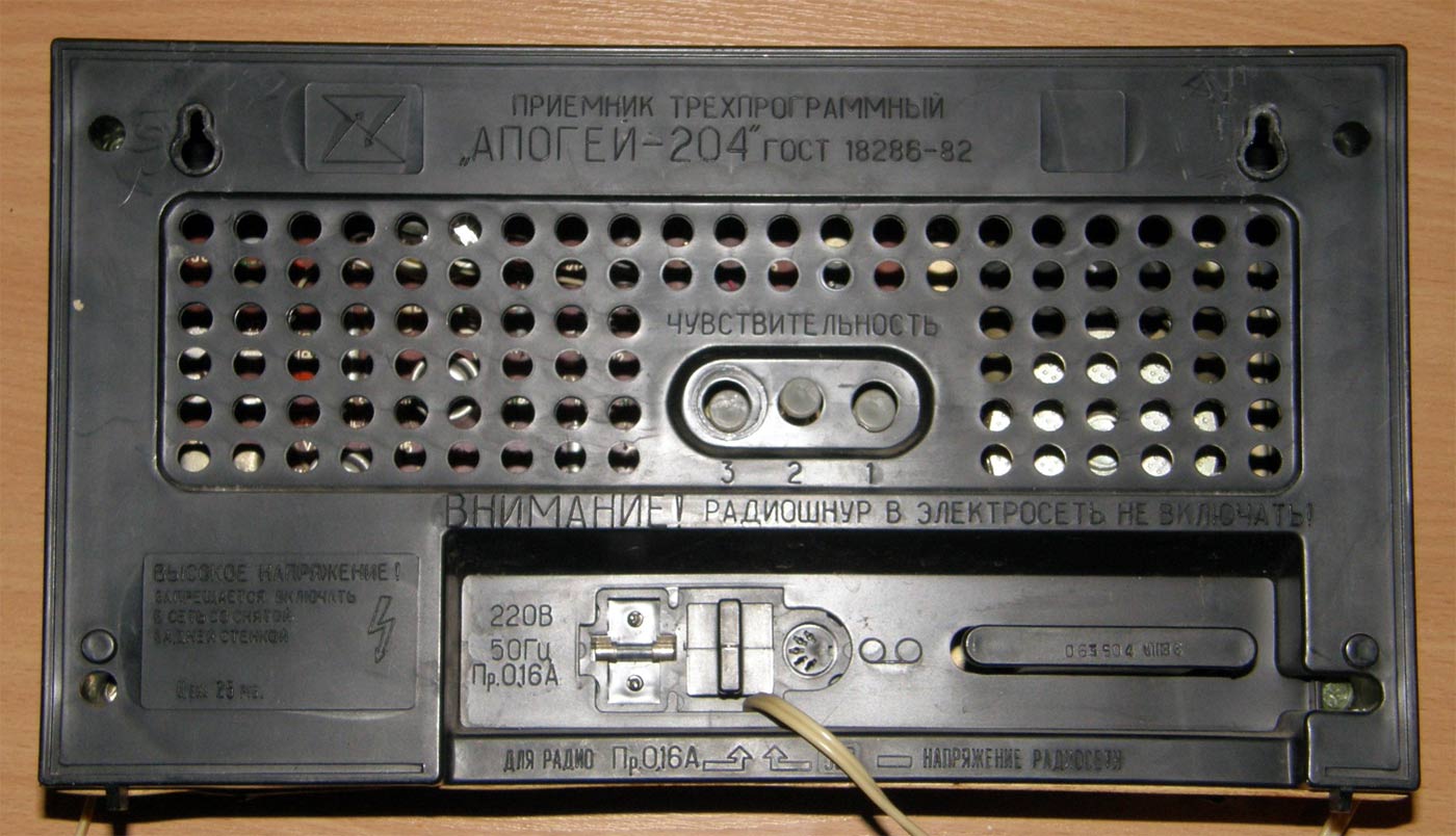 Приёмник трёхпрограммный *Апогей-204* с 1986 года выпускал Кимовский радиоэлектромеханический завод. ПТ предназначен для приёма и воспроизведения трёх радиопрограмм, передаваемых по уплотнённым проводным радиотрансляционным сетям. Основная низкочастотная программа принимается с усилиением или без усиления. Диапазон рабочих частот по НЧ каналу 100...1000 Гц, по ВЧ каналам 100...6300 Гц. Номинальная выходная мощность 300 мВт. Потребляемая мощность 4 Вт. Габариты 325х98х185 мм. Вес 2 кг.