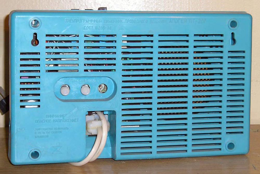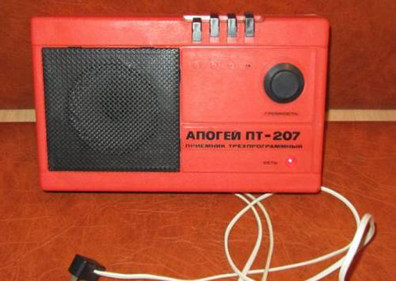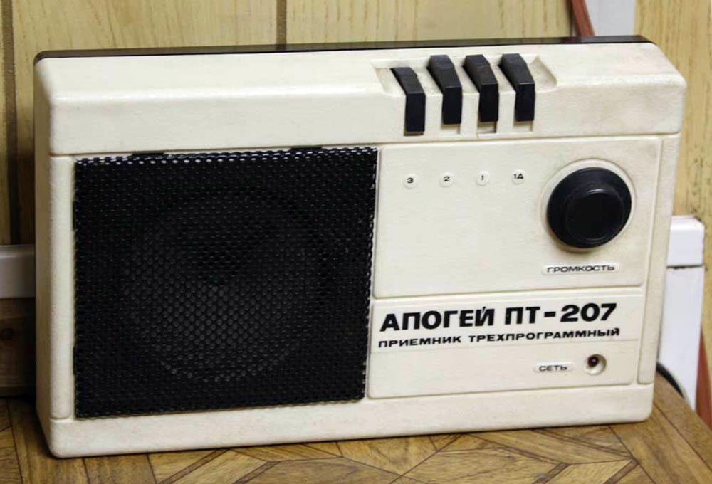 Приёмник трёхпрограммный *Апогей ПТ-207* с 1989 года выпускал Кимовский радиоэлектромеханический завод. ПТ **Апогей ПТ-207** предназначен для воспроизведения программ, передаваемых по сетям трёхпрограммного радиовещания. Диапазон воспроизводимых звуковых частот по НЧ и ВЧ каналам не уже 160...6300 Гц. На линейном выходе по НЧ каналу 63...10000 Гц, по ВЧ каналам 63...6300 Гц. Номинальная выходная мощность 500 мВт. Потребляемая от электросети мощность 5 Вт. Габариты ПТ - 260х160х55 мм. Вес 1,5 кг.