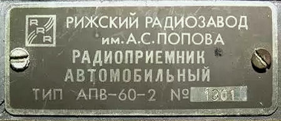Радиоприёмники автомобильные *АПВ-60* и *АПВ-60-2* с I-кв 1960 и 1963 года выпускал Рижский радиозавод им. А.С.Попова. Автомобильный приемник высшего класса **АПВ-60** представляет собой восьмидиапазонный супергетеродин с автоматической настройкой и дистанционным управлением на девяти лампах и 7 транзисторах. Он предназначен для установки в автомобилях ГАЗ-13 **Чайка** и ЗИЛ-111. С 1963 года завод выпускал упрощённый приёмник **АПВ-60-2** без пульта ДУ, упрощённой электрической схемой и более простым оформлением передней панели.