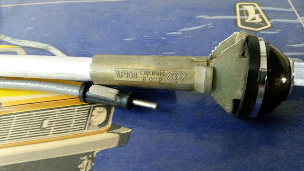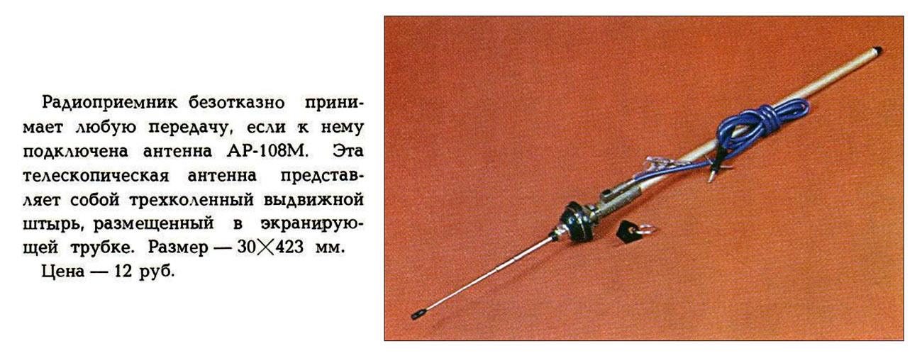 Автомобильная антенна *АР-108* выпускалась предположительно с 1964 года. Наверное с 1989 года антенна именовалась как *АР-108М*. Антенна пассивная, с длиной около одного метра, с возможность наклона на угол до 40 градусов. При задвигании антенны вновь поднять её можно только с помощью специального ключа. Антенна устанавливалась на любых типах автомобилей. Подробная информация есть в сети.