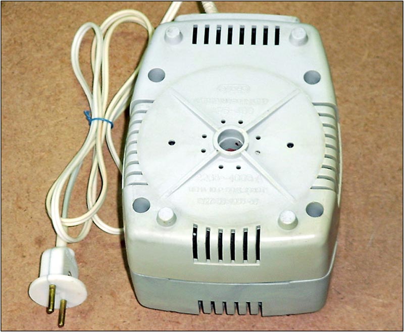 Автотрансформатор регулировочный бытовой *АРБ-400* с I-кв 1989 года выпускало Производственное Объединение *Эльво*. Автотрансформатор служит для ручного поддержания относительно стабильного напряжения в 220 вольт при медленных изменении напряжения электрической сети от 150 до 250 вольт при мощности в нагрузке до 400 ватт. Индикатором напряжения 220 вольт являются погасшие светодиоды. Если напряжение в сети меньше нормы загорается левый светодиод, больше правый. Автотрансформатор можно использовать для питания любой элетротехнической и радиотелевизионной аппаратуры.