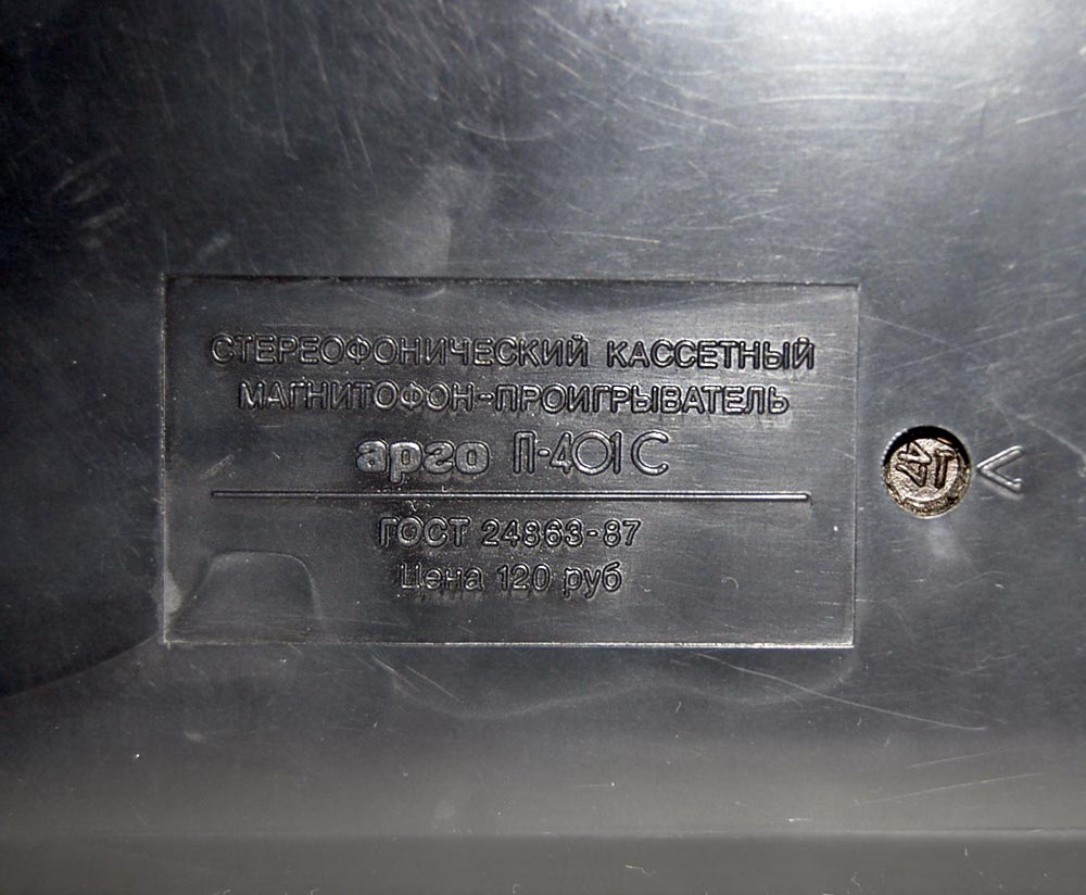 Кассетный магнитофон-проигрыватель *Арго П-401С* с начала 1991 года выпускало Ленинградское ЦНПО *Ленинец*. Стереофонический кассетный магнитофон-проигрыватель **Арго П-401С** предназначен для воспроизведения фонограмм, записанных на кассетах МК-60 и прослушивания их через головные стереотелефоны. Работоспособность магнитофона обеспечивается при питании: от сети через блок питания; от комплекта аккумуляторов Д-0,26Д. Магнитофон обеспечивает: воспроизведение и прослушивание записи через телефоны; перемотку ленты в обоих направлениях; раздельное регулирование громкости по каналам; заряд аккумуляторов при работе от сети. Время непрерывной работы от комплекта заряженных аккумуляторов 2,5 часа. Технические характеристики: Мощность, потребляемая от сети 3,5 Вт. Скорость ленты 4,76 см/сек. Детонация ±0,6%. Частотный диапазон воспроизведения 63...10000 Гц. Коэффициент гармоник 5%. Отношение сигнал/шум в канале воспроизведения -40 дБ. Время перемотки магнитной ленты в кассете МК-60 не более 180 сек. Масса МП с аккумуляторами 0,6 кг. Масса БП - 0,3 кг. Габариты МП - 119х138х37 мм, БП - 63х107х85 мм.