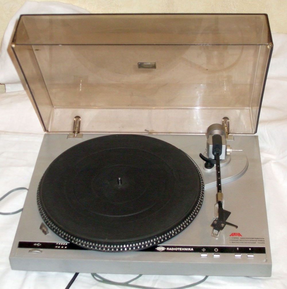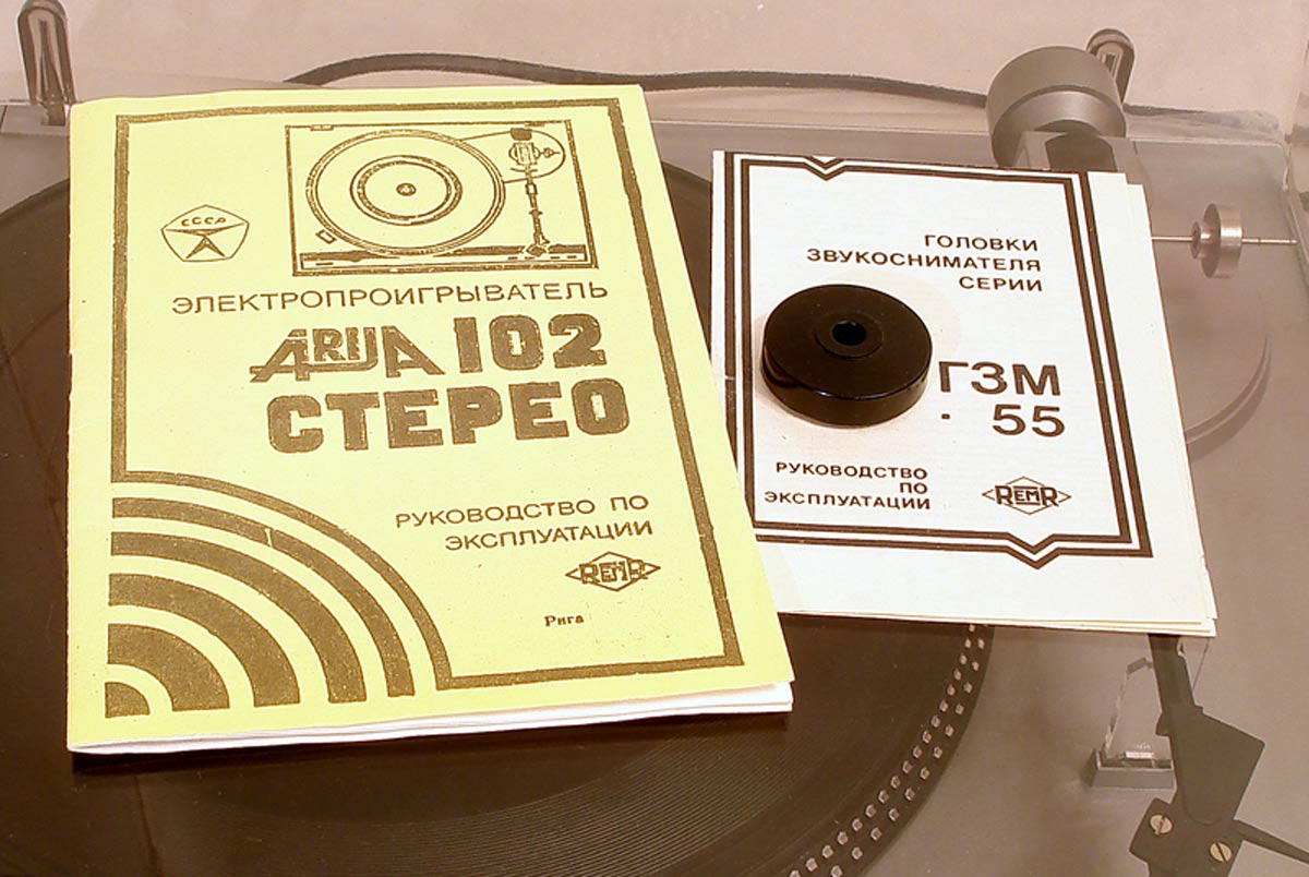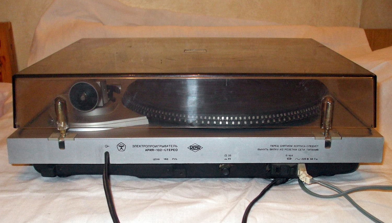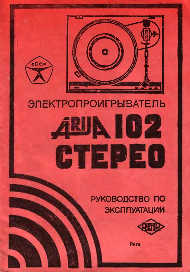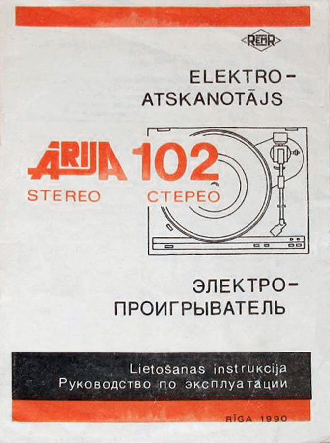 Электропроигрыватель *Ария-102-стерео* с 1986 года выпускало ПО *Радиотехника*. Электропроигрыватель 1 группы сложности *Ария-102-стерео* предназначен для воспроизведения через внешние УКУ моно и стереофонических грамзаписей с грампластинок любых форматов. В ЭП применен прямой электромеханический привод диска. В ЭП применяется магнитный звукосниматель типа ГЗМ-155. Применен полный электронный автостоп, обеспечивающий подъем микролифта и выключение ЭП при окончании проигрывания грампластинки или при нажатии кнопки *0*; автоматический подъем микролифта при случайном отключении ЭП от сети. Проигрывание пластинки может осуществляться с закрытой пылезащитной крышкой. Частота вращения диска ЭПУ 33/45 об/мин. Диапазон воспроизводимых частот 20...20000 Гц. Коэффициент детонации на частоте вращения 33 об/мин 0,12 %. Прижимная сила звукоснимателя 10 мН. Пределы подстройки частоты вращения диска не менее 2 %. Напряжение питания ЭП от сети переменного тока, с частотой 50 Гц, 220 В. Потребляемая мощность - 10 Вт. Габаритные размеры ЭП - 430 х 335 х 135 мм. Его масса - 7,5 кг.