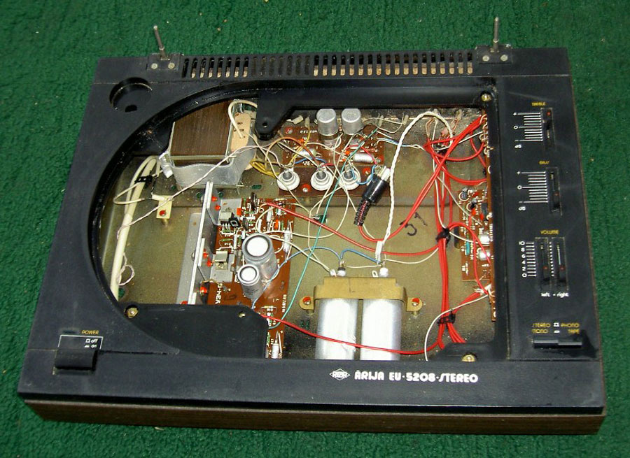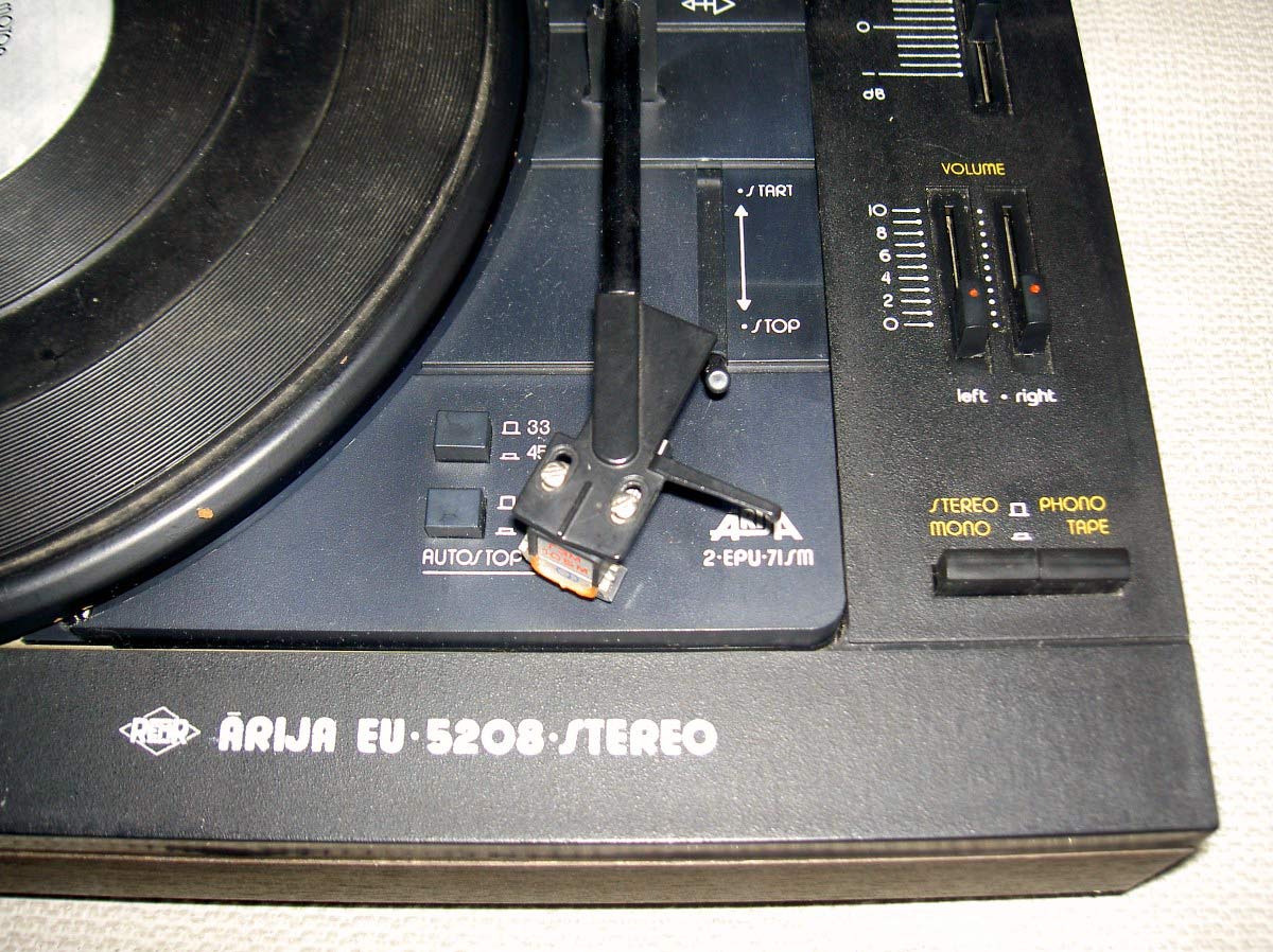 Электрофон сетевой транзисторный *Ария ЭФ-5208-стерео* с начала 1994 года выпускал Рижский электромеханический завод. Электрофон второй группы сложности **Arija-ЭФ-5208-стерео** предназначен для воспроизведения механической звукозаписи с грампластинок на скорости вращения диска 33 и 45 об/мин. В электрофоне применено электропроигрывающее устройство 2-ЭПУ-71СМ с магнитной головкой ГЗМ-105М или ГЗМ-255 по лицензии фирмы **Ортофон** с алмазной иглой и две АС типа S-30A. Диапазон воспроизводимых звуковых частот 80...16000 Гц. Коэффициент детонации 0,2 дБ. Отношение сигнал/рокот и сигнал/фон - 55/42 дБ. Потребляемая от сети мощность - 50 Вт. Номинальная выходная мощность 2х6 Вт, максимальная 10 Вт. Масса электрофона и двух АС без упаковки - 19 кг. Размер электрофона - 431х337х165 мм, одной АС - 365х215х201 мм.