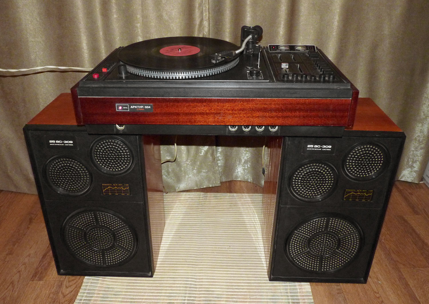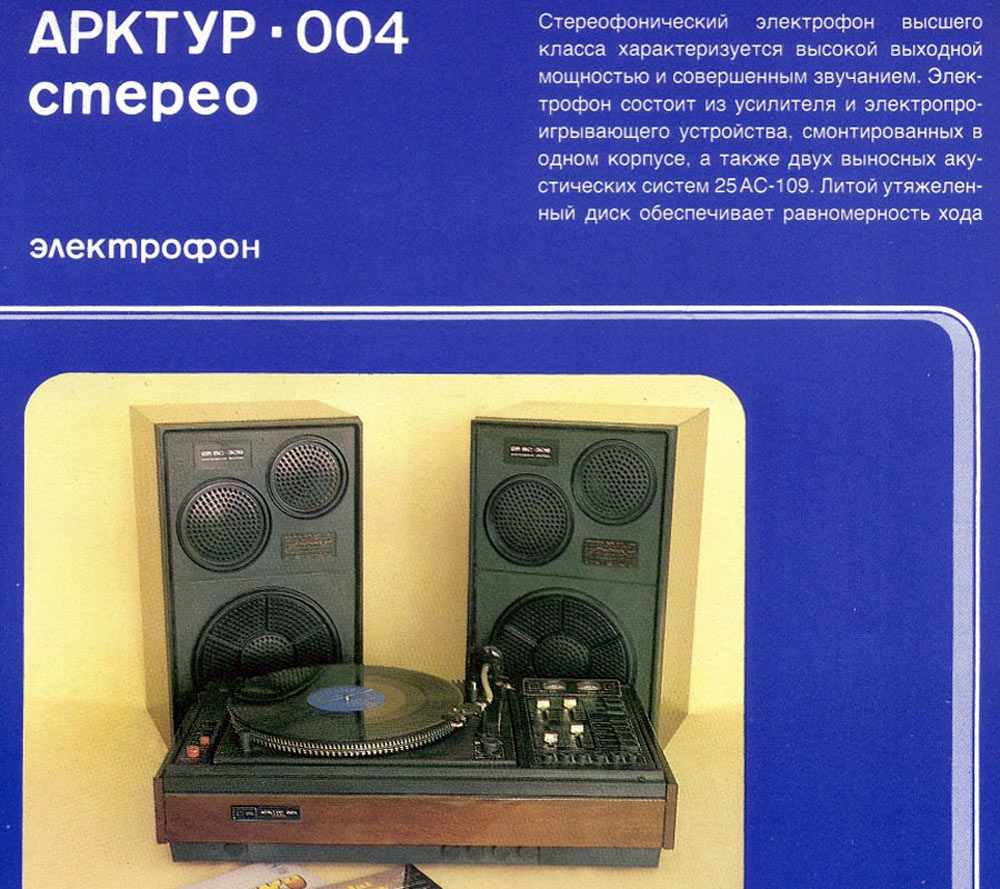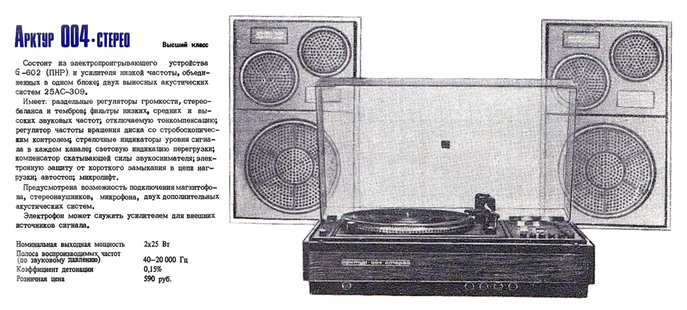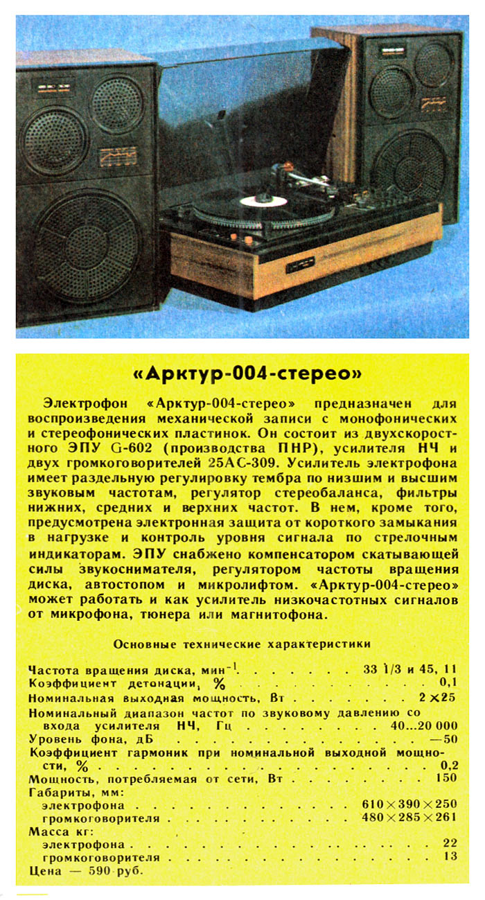 Стереофонический транзисторный электрофон *Арктур-004-стерео* с 1981 года выпускал Бердский радиозавод. ЭФ предназначен для прослушивания записи с моно и стереофонических грампластинок и состоит из 2-х скоростного ЭПУ производства ПНР, УНЧ и 2-х АС 25АС-309. Есть регулировка тембра НЧ и ВЧ, баланса, фильтры нижних, средних и верхних частот, электронная защита от КЗ в нагрузке, контроль уровня сигнала стрелочными индикаторами. В ЭПУ имеется компенсатор скатывающей силы, регулировка частоты вращения диска, автостоп и микролифт. ЭФ работает и как усилитель. Частота вращения диска 33,1/3 и 45,11 об/мин. Коэффициент детонации 0,1%. Номинальная выходная мощность 2х25 Вт. Диапазон частот по звуковому давлению 40...20000 Гц. Уровень фона -50 дБ. Коэффициент гармоник 0,2%. Потребляемая мощность 150 Вт. Габариты ЭФ 610х390х250 мм. Одной АС 480х285х261 мм. Масса ЭФ 22 кг. АС 13 кг.