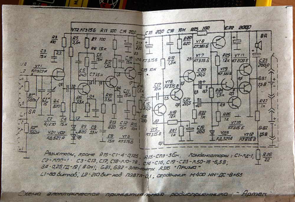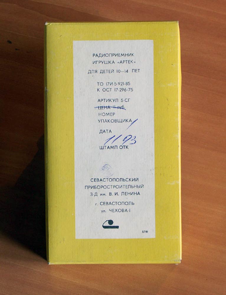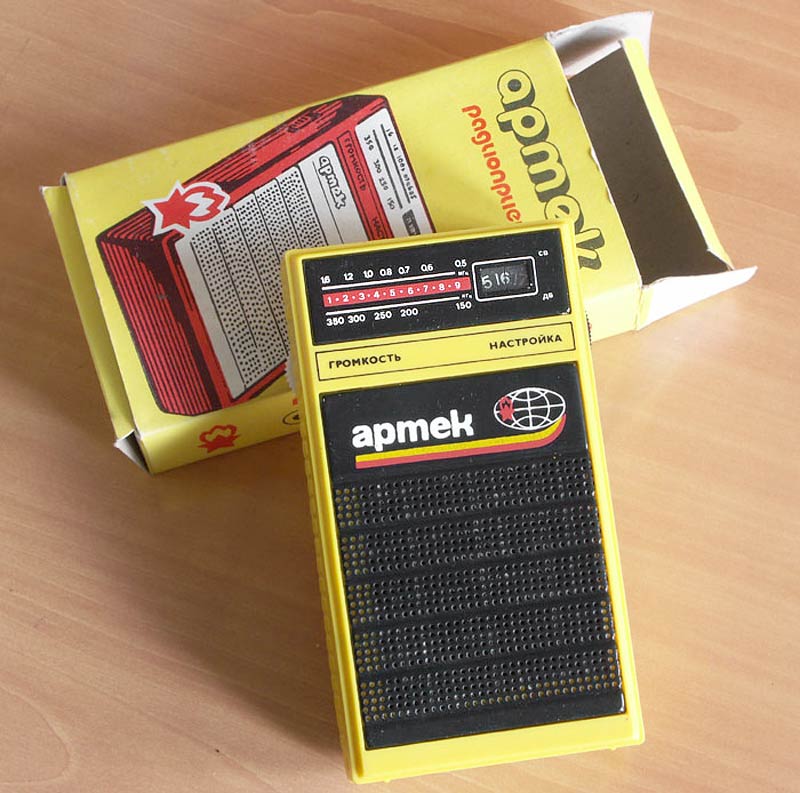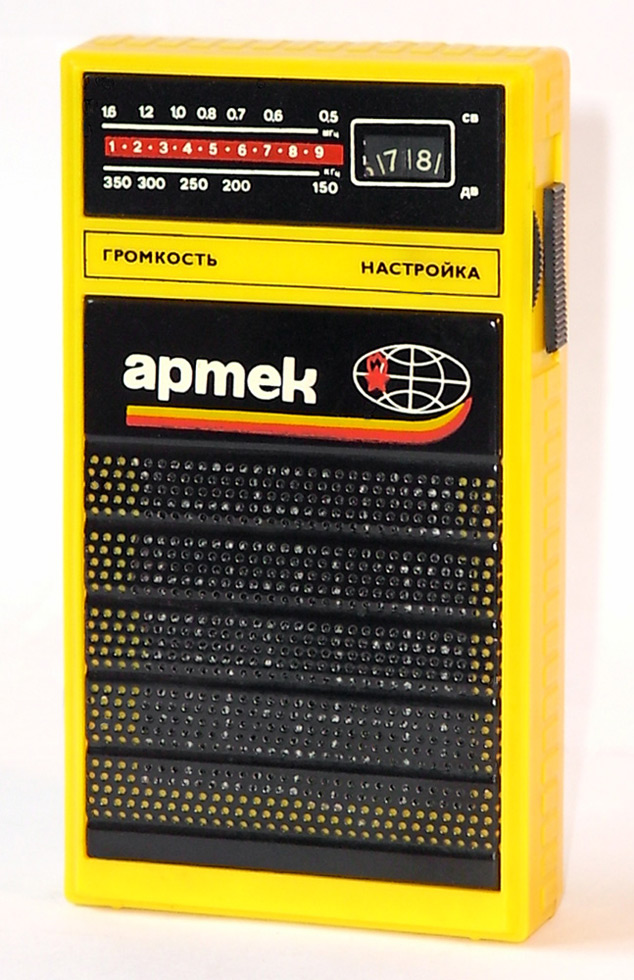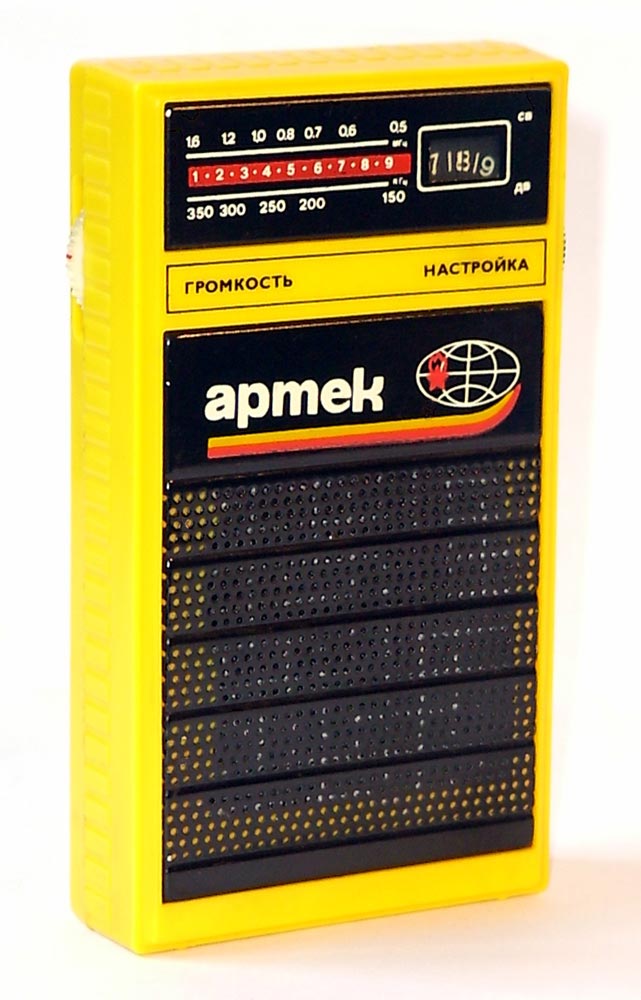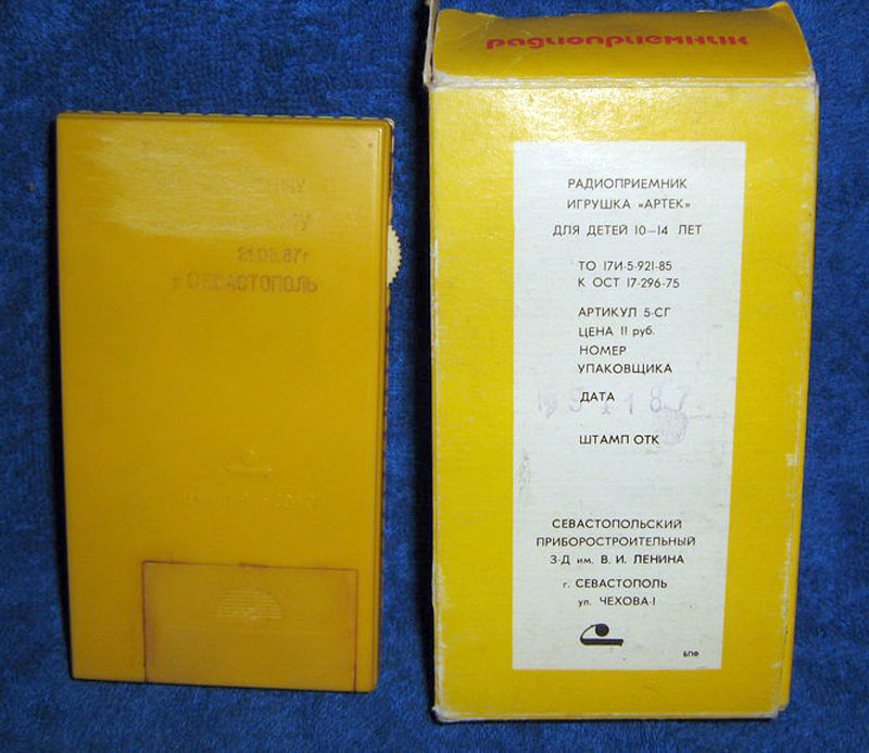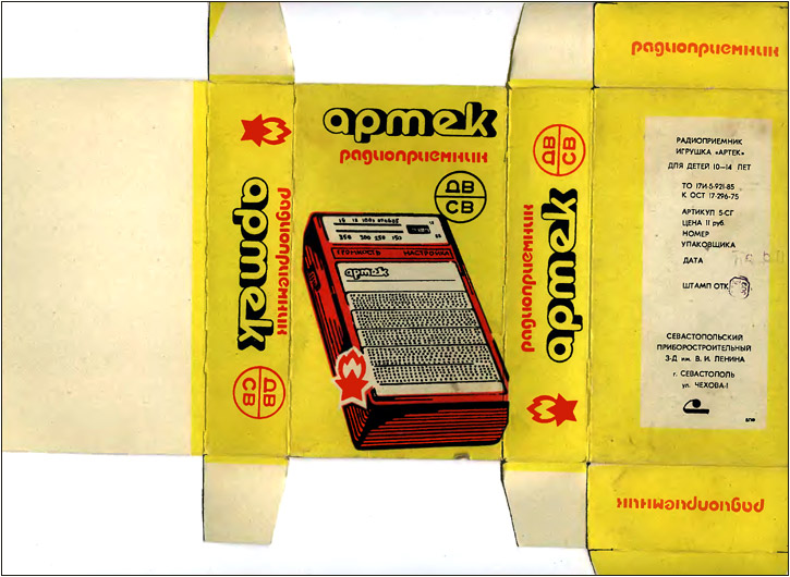 Детский радиоприёмник игрушка *Артек* с 1987 года выпускал Севастопольский приборостроительный завод им. Ленина. **Артек** является одним из первых отечественных приёмников прямого усиления с низковольтным питанием. Он собран на 12 кремниевых транзисторах и предназначен для приобретения детьми школьного возраста навыков в обращении с радиоаппаратурой. У приёмника две шкалы, первая горизонтальная, обозначенная в УЕ и в КГц для каждого диапазона является иммитатором, вторая круглая, справа в окошке, обозначенная только в условных единицах - рабочая. Питается приёмник от двух элементов 316. Громкоговоритель 1ГДШ-9. Розничная цена приёмника с батареями - 11 рублей. Диапазоны принимаемых частот: ДВ 150...300 кГц, СВ 525...1607 кГц. Чувствительность на ДВ - 6 мВ/м, СВ - 3мВ/м. Селективность на ДВ - 12 дБ, СВ - 10 дБ. Номинальная выходная мощность 30 мВт, максимальная 60. Диапазон воспроизводимых частот 200...5000 Гц. Габариты радиоприёмника - 76х135х28 мм. Масса с элементами питания - 320 гр.