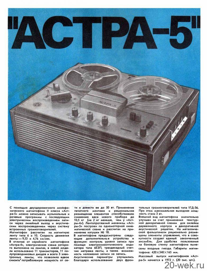 Магнитофоны "Астра-5", "Астра-205" и "Астра-206" соответственно с 1972, 1973 и 1975 года выпускал Ленинградский завод "Техприбор". Все магнитофоны имеют одинаковую конструкцию и практически одну электрическую схему. Аппараты предназначены для записи фонограмм от микрофона, звукоснимателя, приёмника, телевизора, радиолинии и другого магнитофона с последующим воспроизведением через собственную или внешнюю АС. ЛПМ моделей собран по одномоторной схеме и рассчитан на использование катушек № 18 ёмкостью 525 метров с лентой типа 6 или 10. Скорости протяжки ленты: 9,53 и 4,76 см/сек. В отличие от модели ''Астра-4'' выполненной на лампах, в этих моделях всего 3 лампы, 11 транзисторов и 11 диодов, что позволило практически вдвое снизить потребляемую мощность. В моделях имеется: трёхдекадный счетчик расхода ленты; электронно-оптический индикатор уровня записи на лампе 6Е3П; возможность наложения новой записи на имеющуюся. Акустические параметры улучшились благодаря применению двух громкоговорителей 1ГД-36, при этом максимальная выходная мощность возросла до 3 Вт. Диапазон рабочих частот звука 40...12000 Гц на большей скорости и 63...6300 Гц на меньшей. Питание от электрической сети. Потребляемая мощность 50 Вт. Габариты любой модели 420х340х105 мм, масса 10,5 кг. Цена любого из магнитофонов 210 рублей. Магнитофон ''Астра-206'' имеет незначительные изменения схемы по входам. Магнитофонов "Астра-5" было выпущено около 20.000 экземпляров.