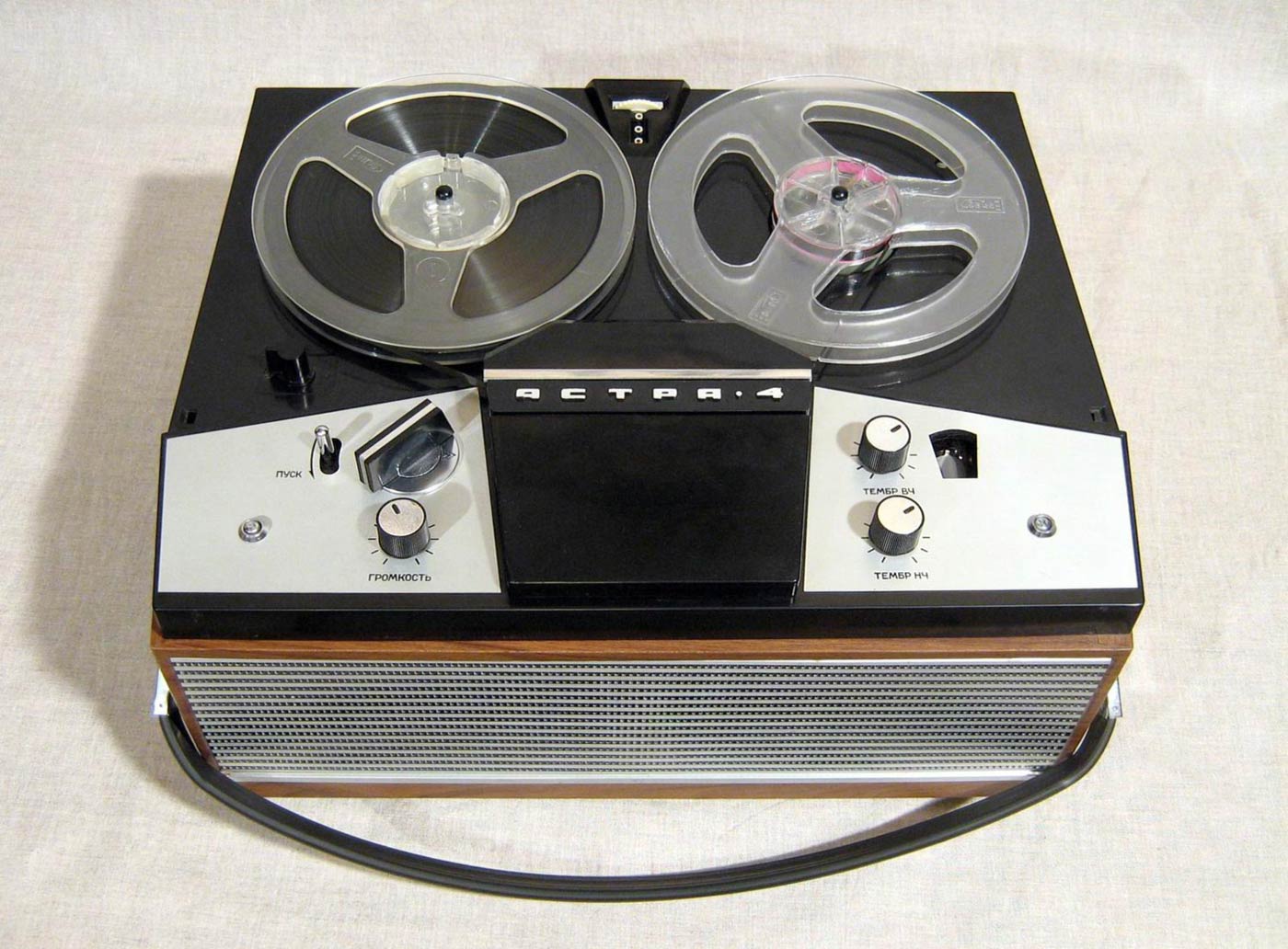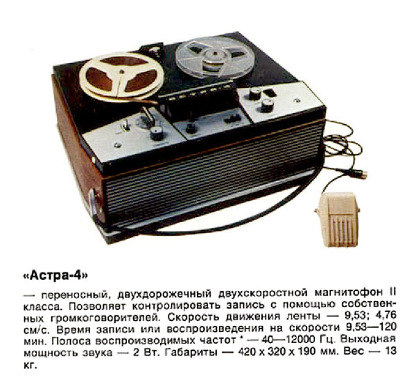 Сетевой катушечный магнитофон *Астра-4* с 10 ноября 1966 по IV-кв 1974 года выпускал Ленинградский завод *Техприбор*. Магнитофон **Астра-4** заменил магнитофон **Астра-2**, выпуск которого закончился 31 декабря 1966 года. Новый магнитофон работает на 2-х скоростях протяжки магнитной ленты 4,76 и 9,53 см/сек. Время записи при ёмкости катушки с лентой 350 метров 4 и 2 часа соответственно на меньшей и большей скоростях на двух дорожках. Номинальная выходная мощность 2, максимальная 4 Вт. Рабочий диапазон частот на линейном выходе на скорости 4,76 см/сек 63...6300 Гц и 63...12500 Гц на скорости 9,53 см/сек. КНИ 4%. Коэффициент детонации 0,2% на большей скорости и 1% на меньшей. Потребляемая мощность 100 Вт. Габариты модели - 420х320х190 мм. Масса 12 кг. В магнитофоне установлены три громкоговорителя 1ГД-28 (1ГД-18, 1ГД-36). ЛПМ приводится в движение двигателем КД-3,5. Схема собрана на 5 пальчиковых лампах. Выпрямитель АВС-80х260. Магнитофон выпускали в двух вариантах. Более раннее оформление магнитофона описано в инструкции № 1, а более современное в инструкции № 2. Небольшой серией с I-кв 1967 года магнитофон *Астра-4* выпускался и на Воронежском заводе *Электроприбор*.