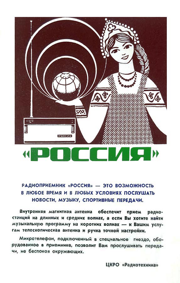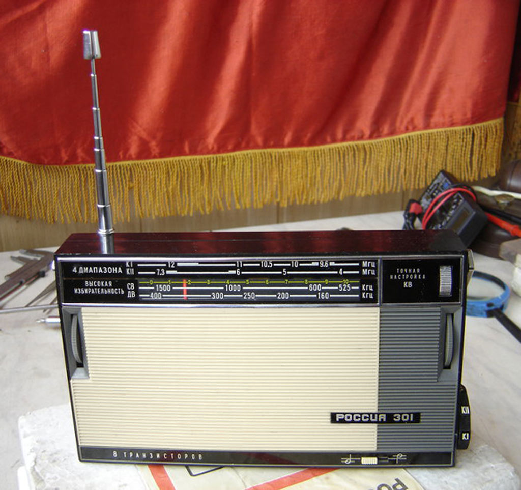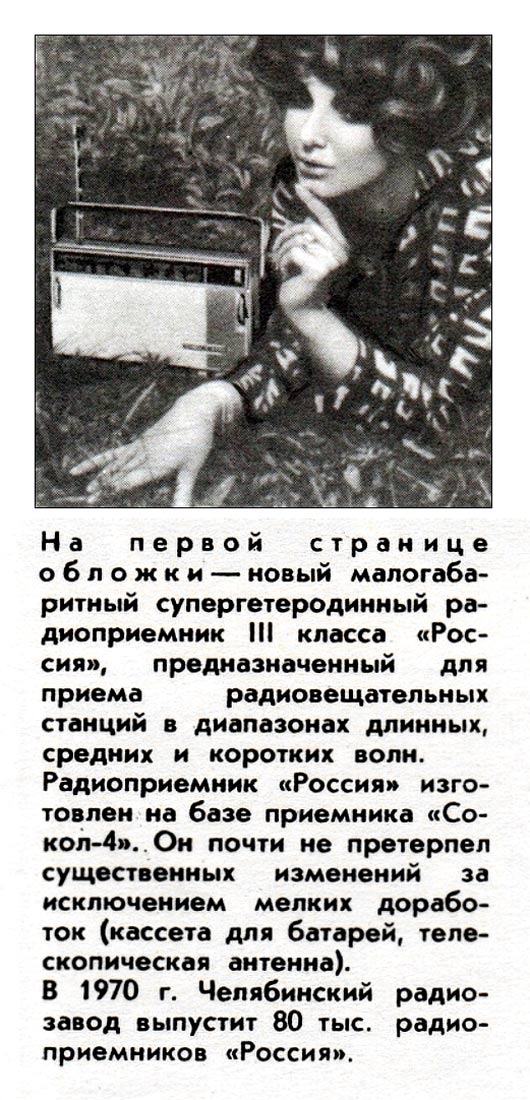 Портативный радиоприёмник *Россия* с начала 1970 года выпускал Челябинский радиозавод. С середины 1970 года радиоприёмник уже именовался как **Россия-301**, цифрами обозначая класс и номер разработки. Радиоприёмник предназначен для приёма радиостанций в диапазонах ДВ, СВ и 2-х поддиапазонах КВ. Приёмник собран на восьми транзисторах. Чувствительность в диапазонах ДВ 2,2 мВ/м, СВ 1,2 мВ/м, КВ 0,45 мВ/м. Селективность 40 дБ. Номинальная выходная мощность 100 мВт. Питание от 4-х элементов *А-316*. Габариты радиоприёмника 215х125х47 мм. Масса без батарей - 1 кг. Экспортный вариант приёмника имел наименования *Astrad* и *Astrad-Altair*.