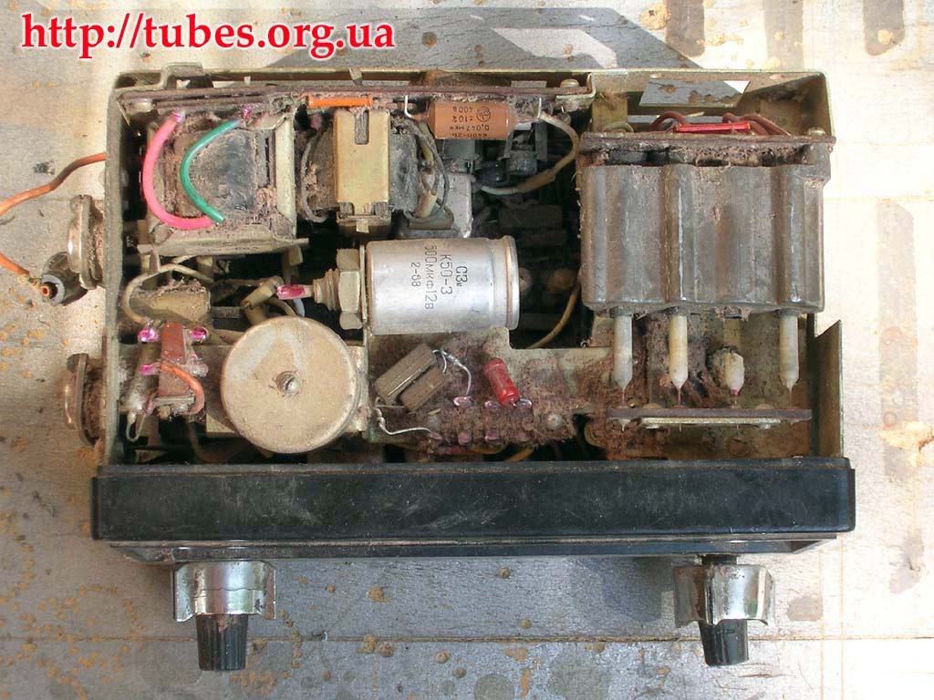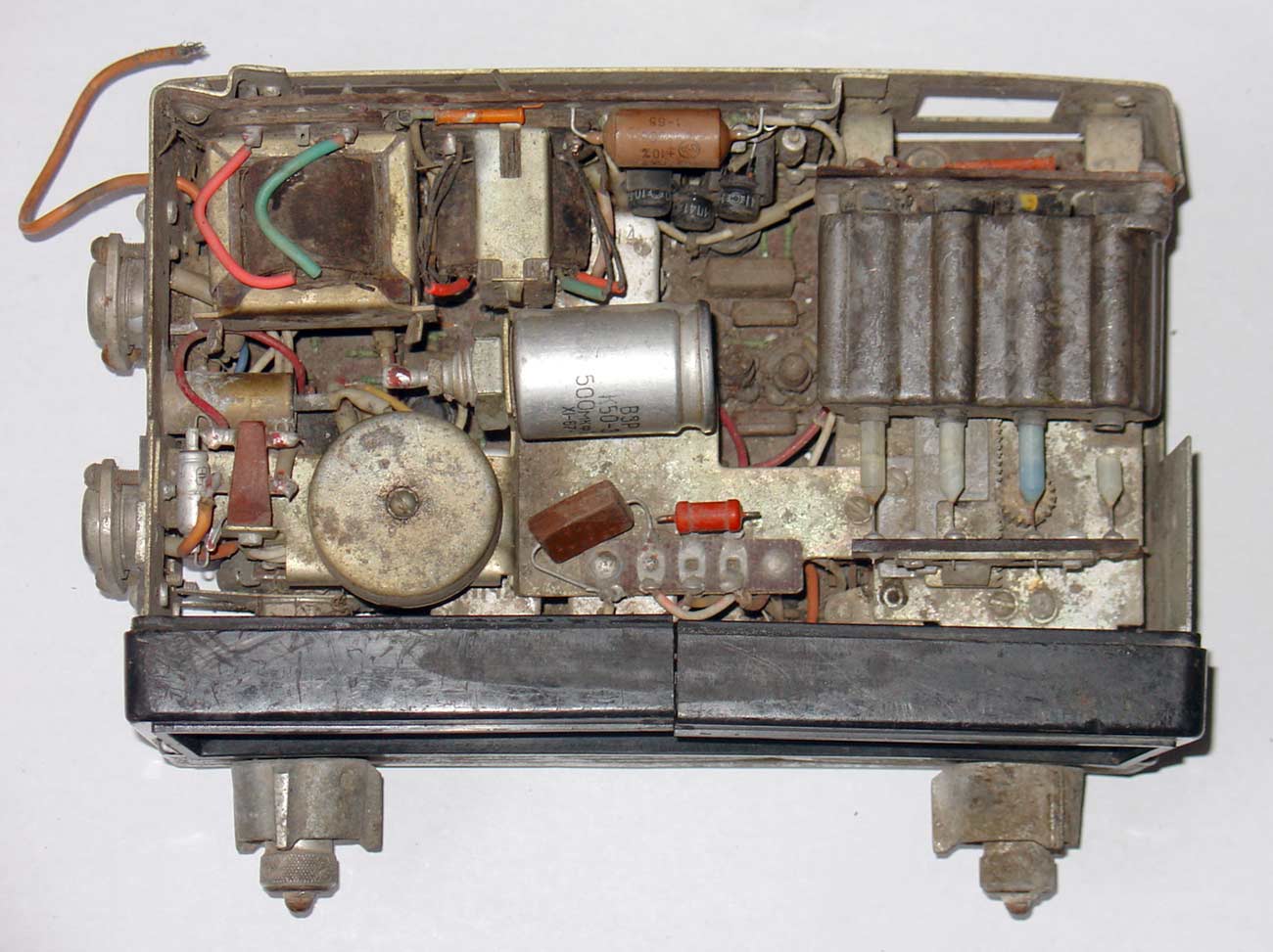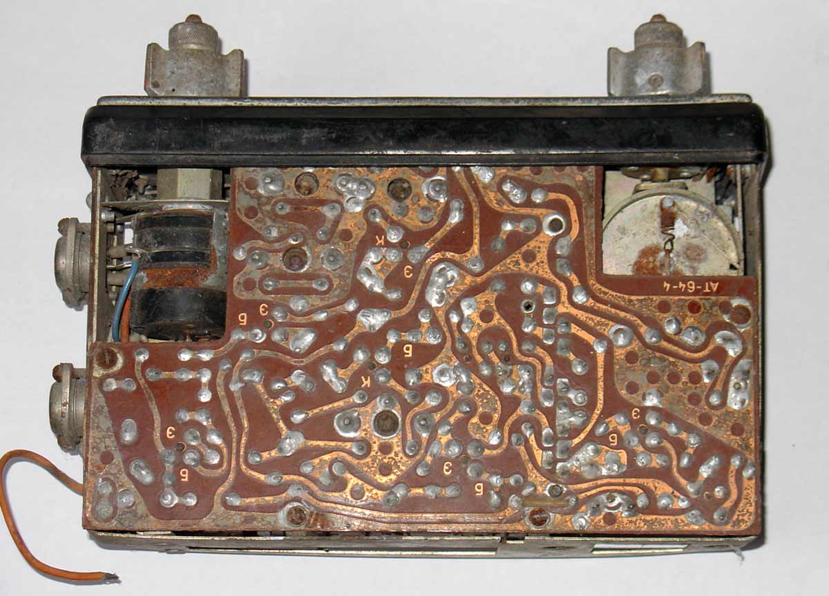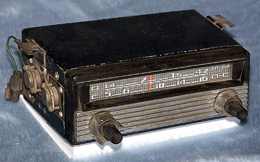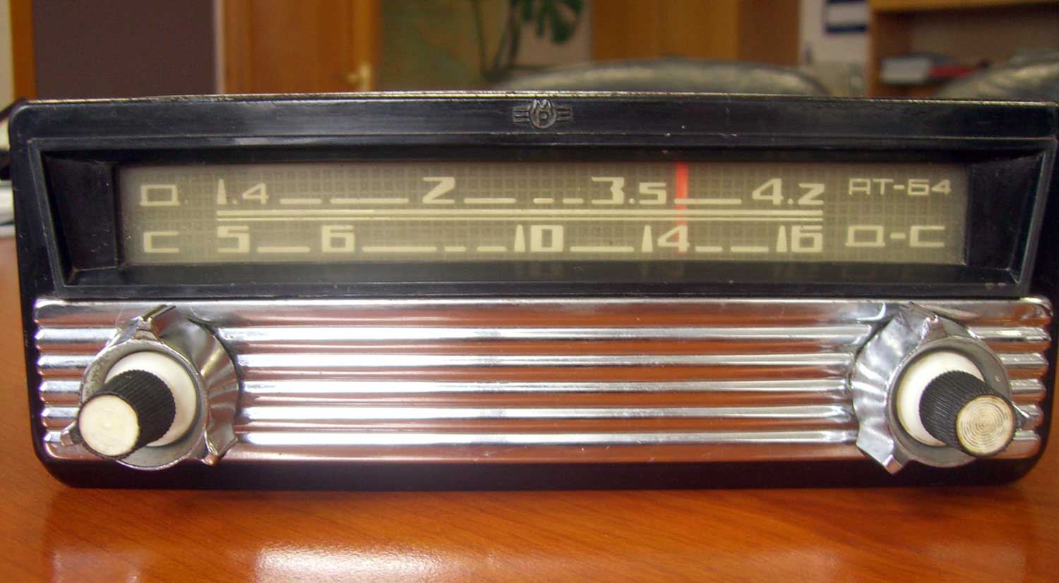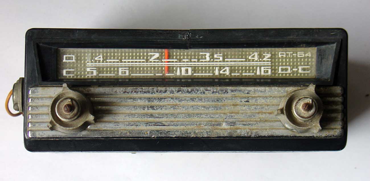 Радиоприёмник автомобильный **АТ-64** с 1964 года выпускал Муромский радиозавод. Представляет собой 11-ти транзисторный супергетеродин работающий в диапазонах ДВ и СВ на автомобилях с напряжением аккумулятора 12 В. Чувствительность модели в диапазоне ДВ 200 мкВ, СВ 60 мкВ. ПЧ 465 кГц. Избирательность по соседнему каналу 30 дБ, зеркальному 40 дБ. Полоса воспроизводимых звуковых частот 120...4000 гц. При изменении входного сигнала на 40 дБ (4000...40 мкВ) АРУ обеспечивает изменение выходного напряжения на 6 дБ. Номинальная выходная мощность 2 Вт. Мощность потребляемая от аккумулятора 10 Вт. Габариты РП - 200х131х77 мм, его масса без упаковки и громкоговорителя 2,1 кг.
