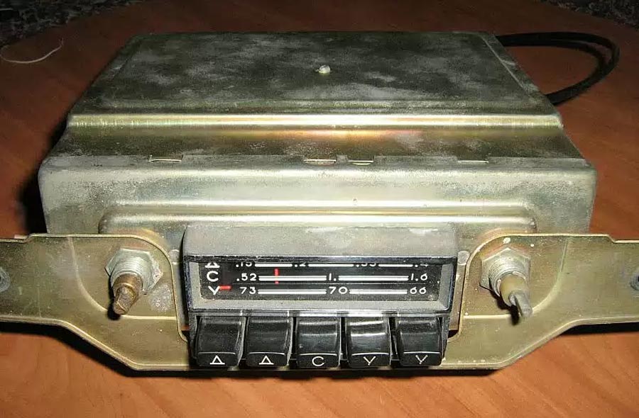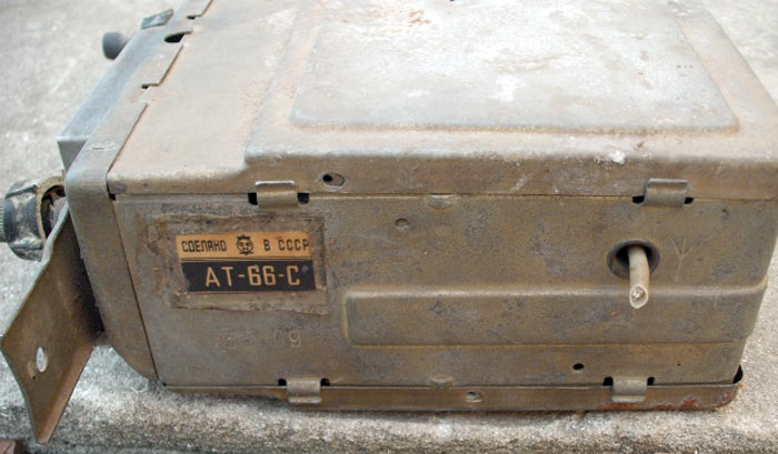 Радиоприёмник автомобильный *АТ-66* с 1966 года серийно выпускал Муромский радиозавод. Рассчитан для установки в автомобиль ГАЗ-24 (Волга) и приём станций в диапазоне длинных (150...408 кГц), средних (520...1605 кГц) волн и в УКВ (65,8...73 МГц) диапазоне. Чувствительность на ДВ - 150 мкВ, СВ - 50 мкВ, УКВ - 5 мкВ. Избирательность по соседнему каналу 34 дБ, по зеркальному в ДВ - 40, СВ - 36, УКВ - 30 дБ. АРУ в диапазонах ДВ, СВ обеспечивает изменение выходного напряжения на 8 дБ, при изменении входного сигнала на 40 дБ. Номинальная выходная мощность 5 вт. Неравномерность АЧХ в полосе 80...8000 Гц не превышает 3 дБ. Коэффициент нелинейных искажений 5%. Пределы регулировки тембра от +6 до -10 дБ. Питание от аккумулятора напряжением 12,8 вольт. Потребляемая приёмником мощность 18 вт. Размеры приёмника 247х115х270 мм, его масса 4 кг. Позднее радиоприёмники выпускались с индексами *С* Советский и *Е* Европейский экспортный вариант. Были радиоприёмники с индексом *Т* тропический вариант, рассчитанные на работу в жарком климате.
