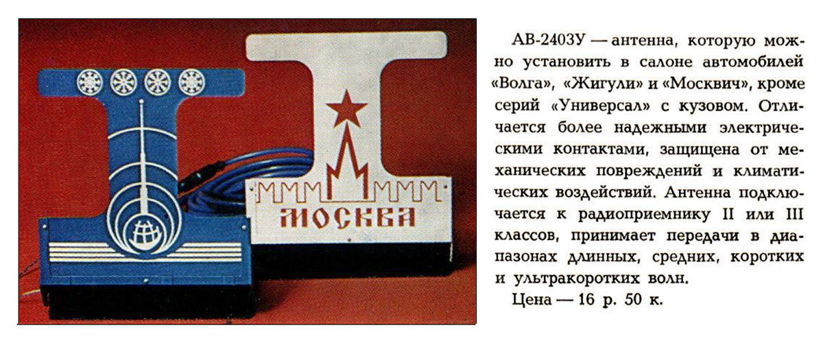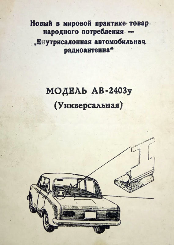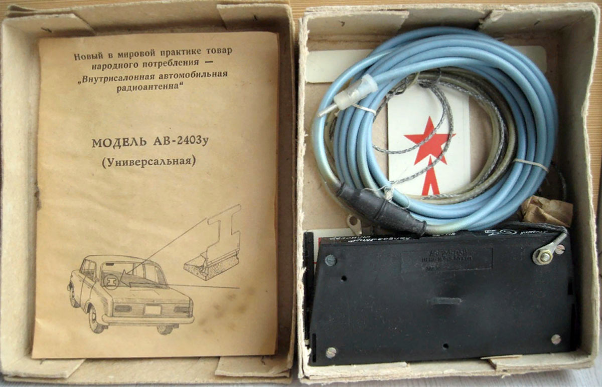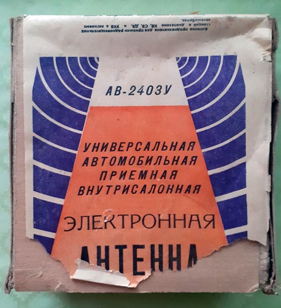 Автомобильная внутрисалонная электронная радиоантенна *АВ-2403У* выпускалась с 1984 года предположительно Московском радиотехническим заводом.
