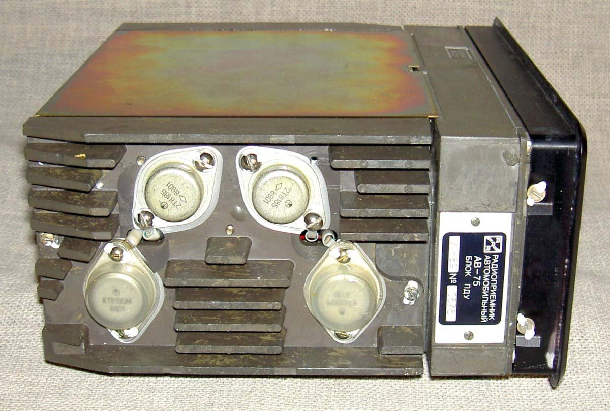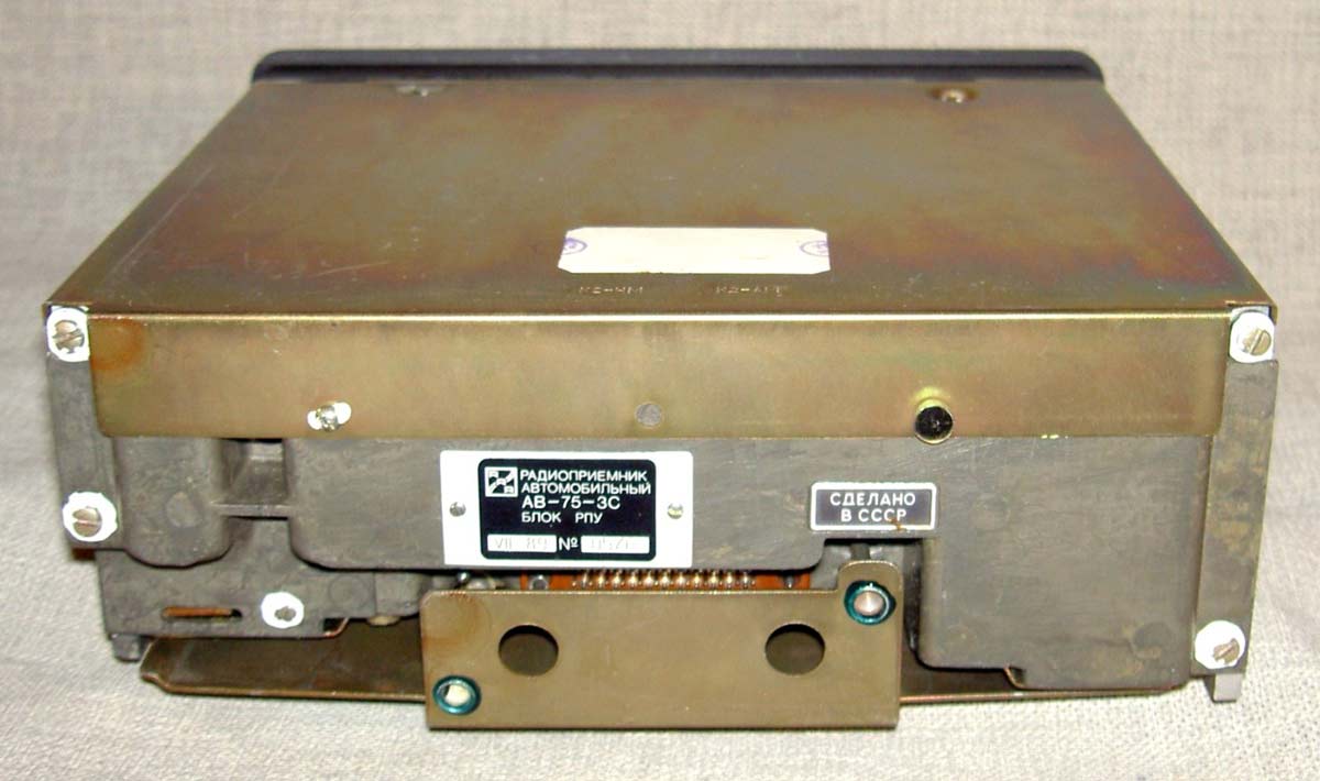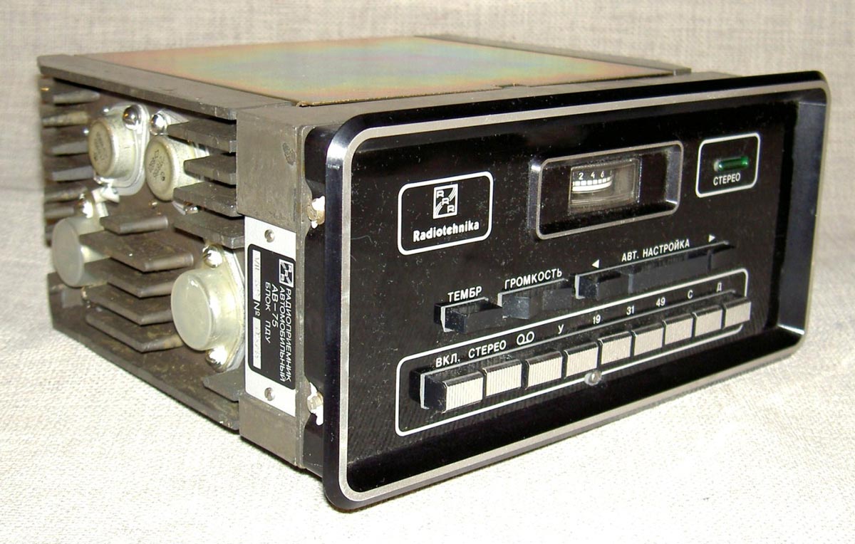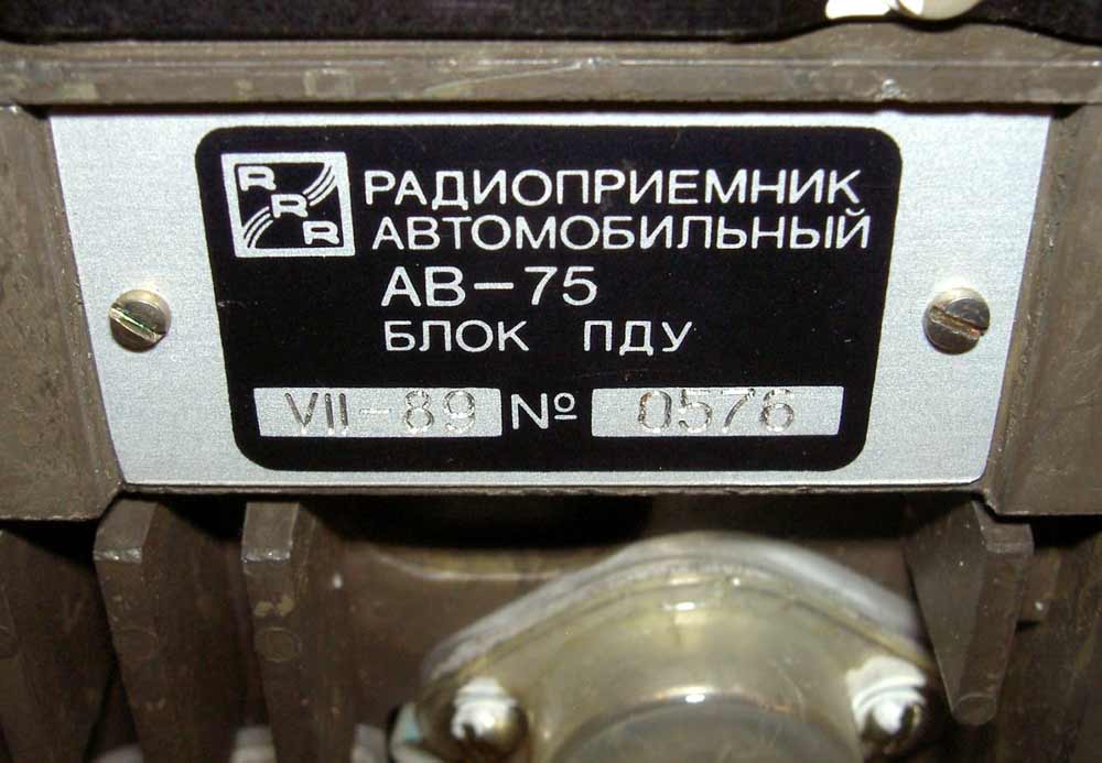 Радиоприёмник автомобильный *АВ-75* с 1975 года выпускал Рижский завод *Радиотехника*. Всеволновый автомобильный приёмник высшего класса **АВ-75** заменил ранее выпускавшийся приёмник **АВ-68**. Приёмник **АВ-75** предназначен для установки в автомобили ГАЗ-14 **Чайка** и ЗИЛ-115. Приёмник выпускали в четырёх модификациях **АВ-75-3С**, **АВ-75-3Е**, **АВ-75-ЧС** и **АВ-75-ЧЕ**. Буква в конце наименования указывает на марку автомобиля и диапазон УКВ, стандартный в СССР 65...74 МГц или европейский 88...108 МГц. Приёмник работает в диапазонах: ДВ, СВ, 3-х поддиапазонах КВ: 49, 31, 19 м и в диапазоне УКВ. В комплекте с приёмником идёт проводной (5 метров) пульт ДУ, автоматическая настройка на станции с возможностью 2-х стороннего поиска, автоматическая подстройка частоты, ступенчатая регулировка тембра по низким и высоким частотам, полосы пропускания по ПЧ. Приёмник имеет вход усилителя низкой частоты для подключения кассетной магнитофонной приставки. Конструктивно радиоприёмник *АВ-75* выполнен блочным способом.