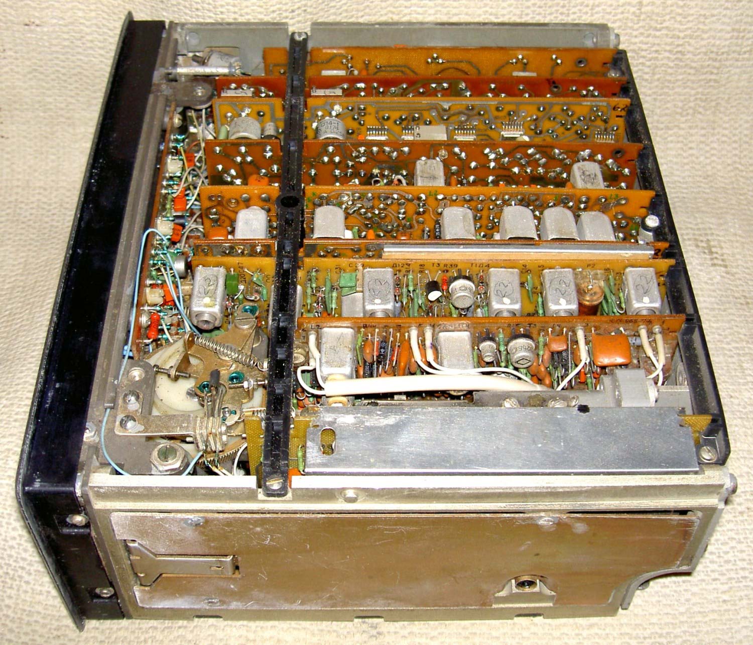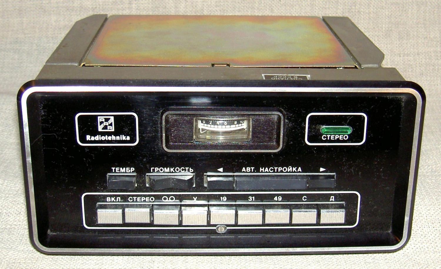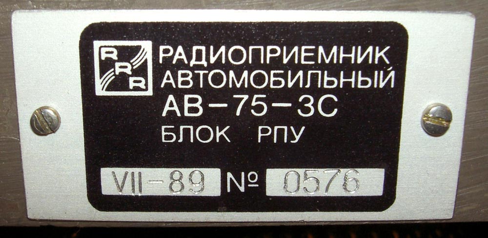 Радиоприёмник автомобильный *АВ-75* с 1975 года выпускал Рижский завод *Радиотехника*. Всеволновый автомобильный приёмник высшего класса **АВ-75** заменил ранее выпускавшийся приёмник **АВ-68**. Приёмник **АВ-75** предназначен для установки в автомобили ГАЗ-14 **Чайка** и ЗИЛ-115. Приёмник выпускали в четырёх модификациях **АВ-75-3С**, **АВ-75-3Е**, **АВ-75-ЧС** и **АВ-75-ЧЕ**. Буква в конце наименования указывает на марку автомобиля и диапазон УКВ, стандартный в СССР 65...74 МГц или европейский 88...108 МГц. Приёмник работает в диапазонах: ДВ, СВ, 3-х поддиапазонах КВ: 49, 31, 19 м и в диапазоне УКВ. В комплекте с приёмником идёт проводной (5 метров) пульт ДУ, автоматическая настройка на станции с возможностью 2-х стороннего поиска, автоматическая подстройка частоты, ступенчатая регулировка тембра по низким и высоким частотам, полосы пропускания по ПЧ. Приёмник имеет вход усилителя низкой частоты для подключения кассетной магнитофонной приставки. Конструктивно радиоприёмник *АВ-75* выполнен блочным способом.