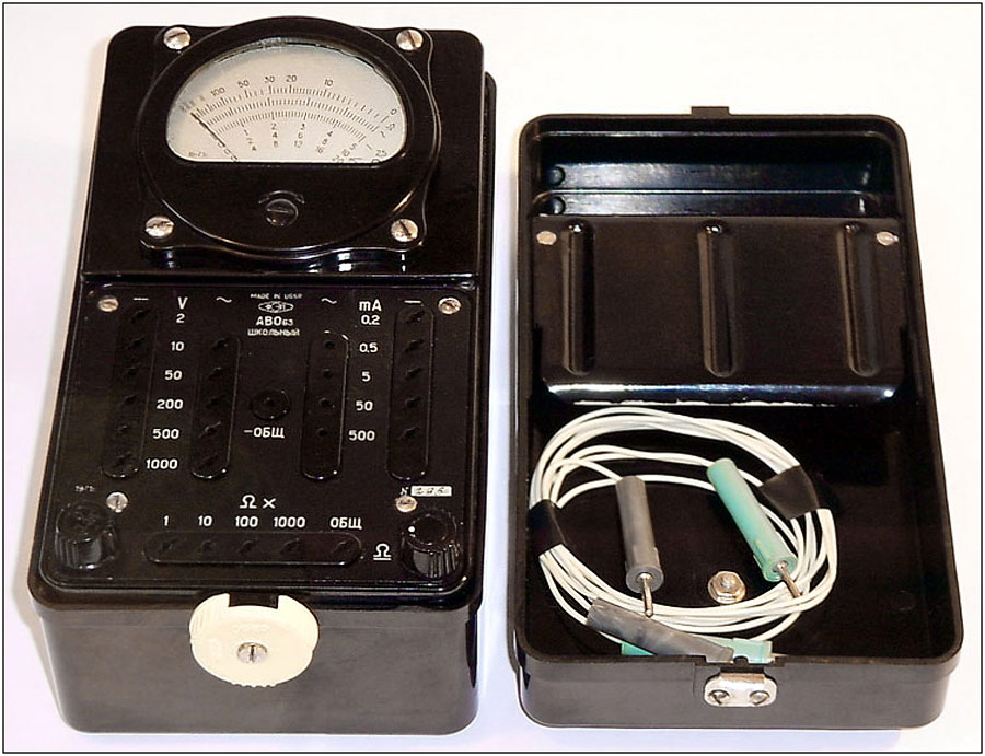 Комбинированный измерительный прибор *АВО-63* (Школьный) выпускался с начала 1963 года. Комбинированный измерительный прибор **АВО-63** (Школьный) предназначен для измерения постоянного и переменного напряжения от 0 до 1000 вольт, силы постоянного и переменного тока от 0 до 500 мА, а также сопротивления от 1 Ома до 2 Мом. Переключение режимов измерений ручное, путём вставки фазового щупа в соответствующее гнездо. Имеется переключатель для измерения постоянных или переменных величин и регулятор для выстовления концевой отметки на шкале при измерении сопротивлений. Класс точности прибора 2,5. Питание для работы омметра прибора состоит из 3-х элементов: ФБС-0,25, 1,3-ФМЦ-0,25, 332 или 336. В 1977 году прибор был обновлён, получив футляр из небьющейся пластмассы и новый стрелочный индикатор. Прибор был без крышки как предыдущий, но у него был футляр из железа серого с голубым цвета, с закрывающейся крышкой. Именовался прибор как *АВО-63* (Учебный).