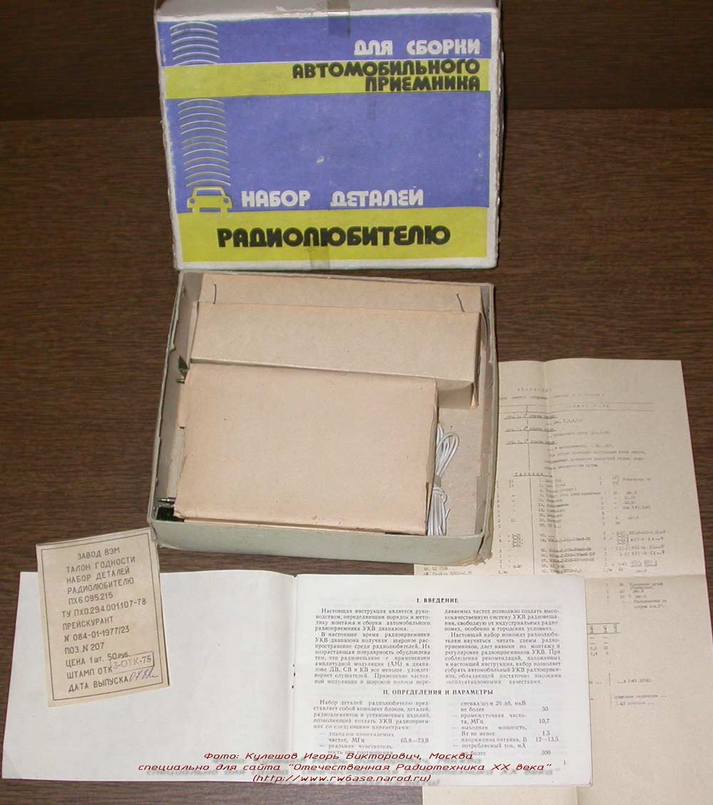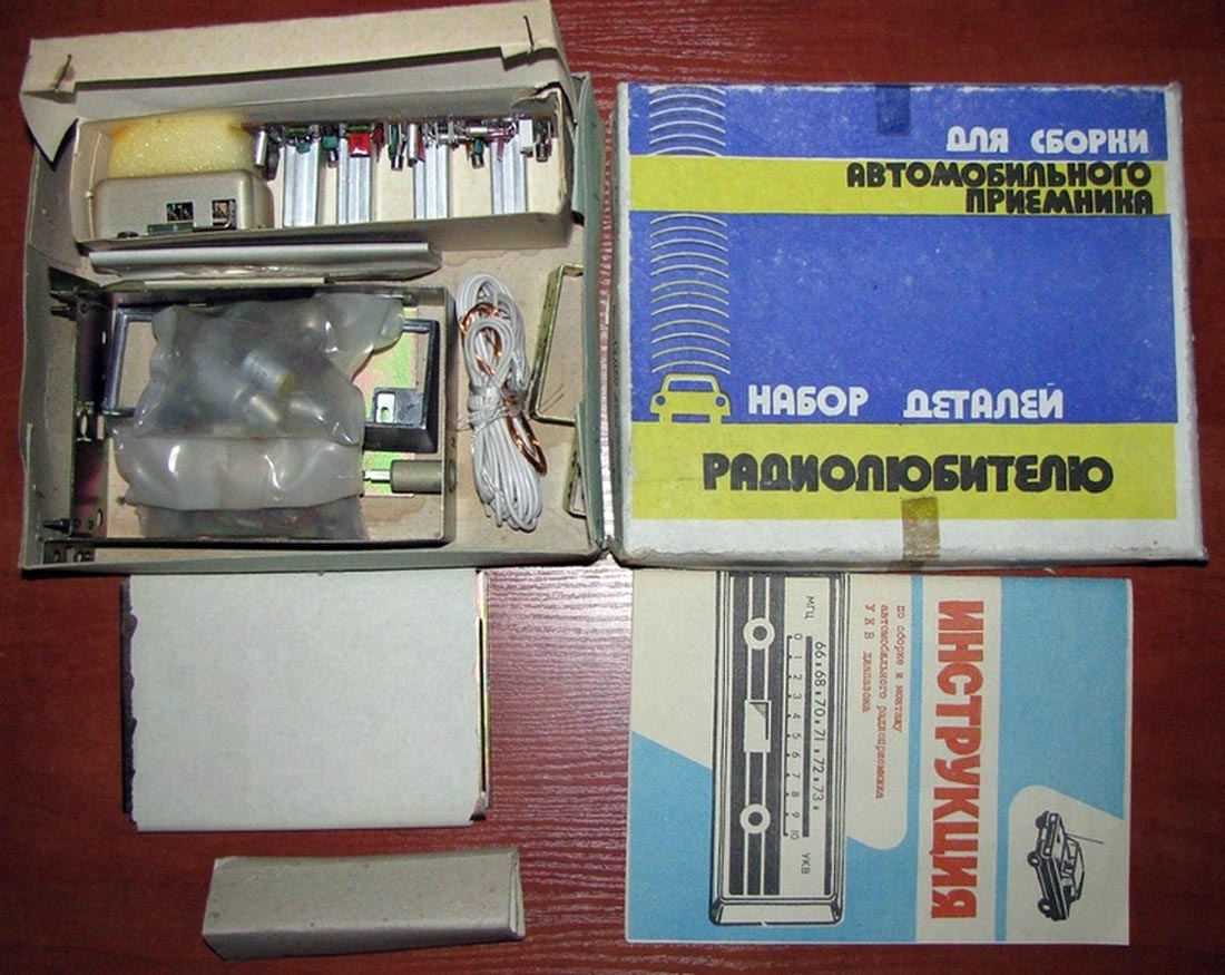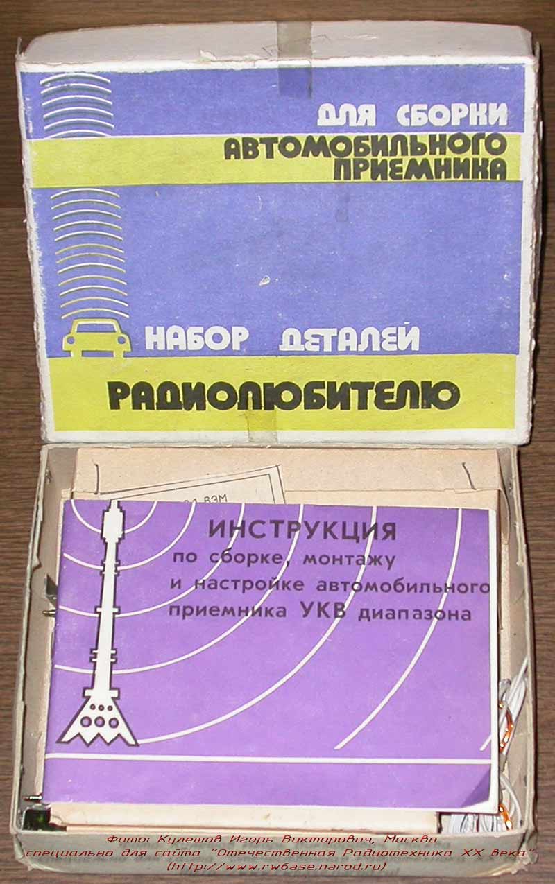 Радиоконструктор *Автомобильный приёмник* с 1981 года выпускал Пензенский завод *ВЭМ*. Набор радиодеталей, узлов и компонентов позволяет собрать автомобильный УКВ-ЧМ радиоприёмник со следующими параметрами: Диапазон принимаемых частот 65,8...73 МГц. Реальная чувствительность от 15 до 30 мкВ. Промежуточная частота 10,7 МГц. Номинальная выходная мощность - 1 Вт. Диапазон звуковых частот на выходе для громкоговорителя - 80...12000 Гц. Напряжение питания - 12...13,5 В. Ток покоя 15 мА. Максимальный потребляемый ток 300 мА. Громкоговоритель в набор не входит. Цена набора 50 рублей.
